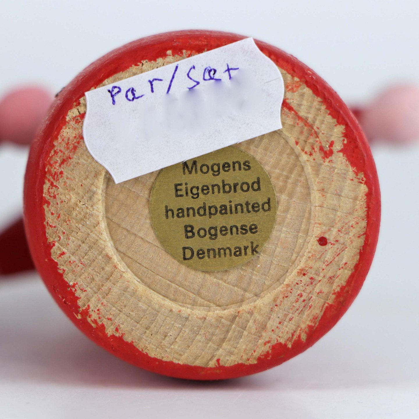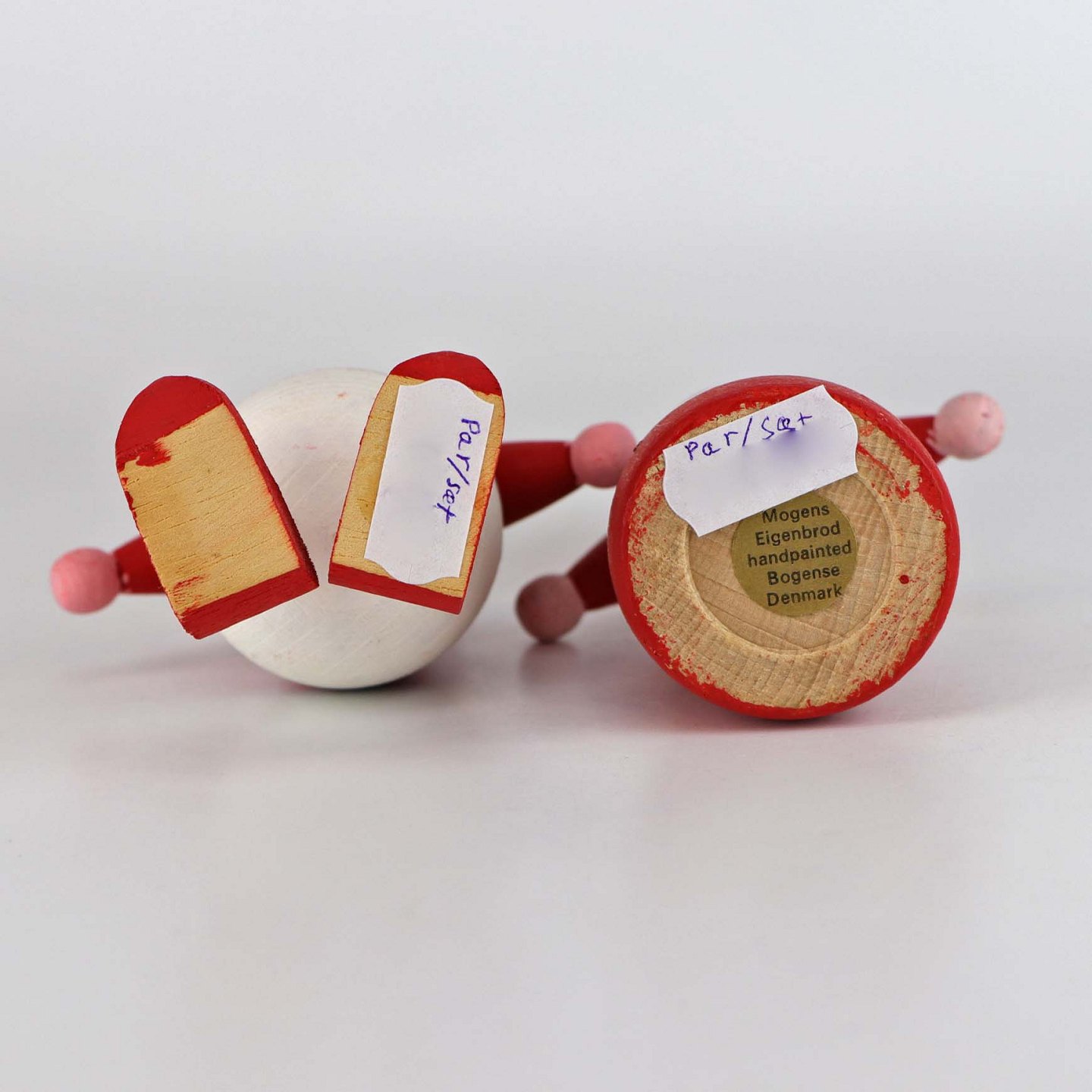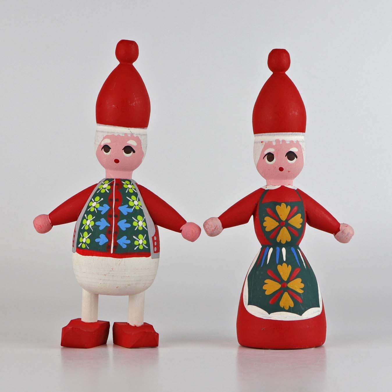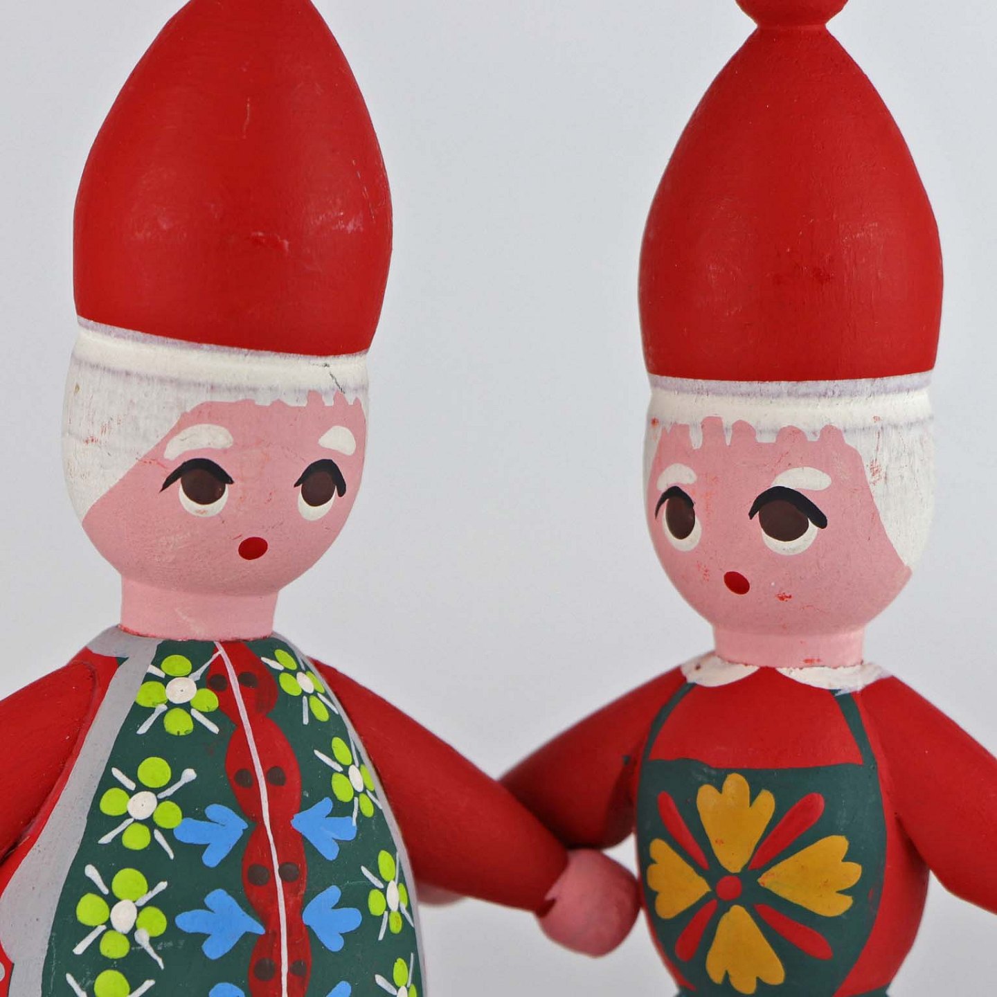 Et sæt håndmalede figurer i træ med motiv af nissefar og nissemor