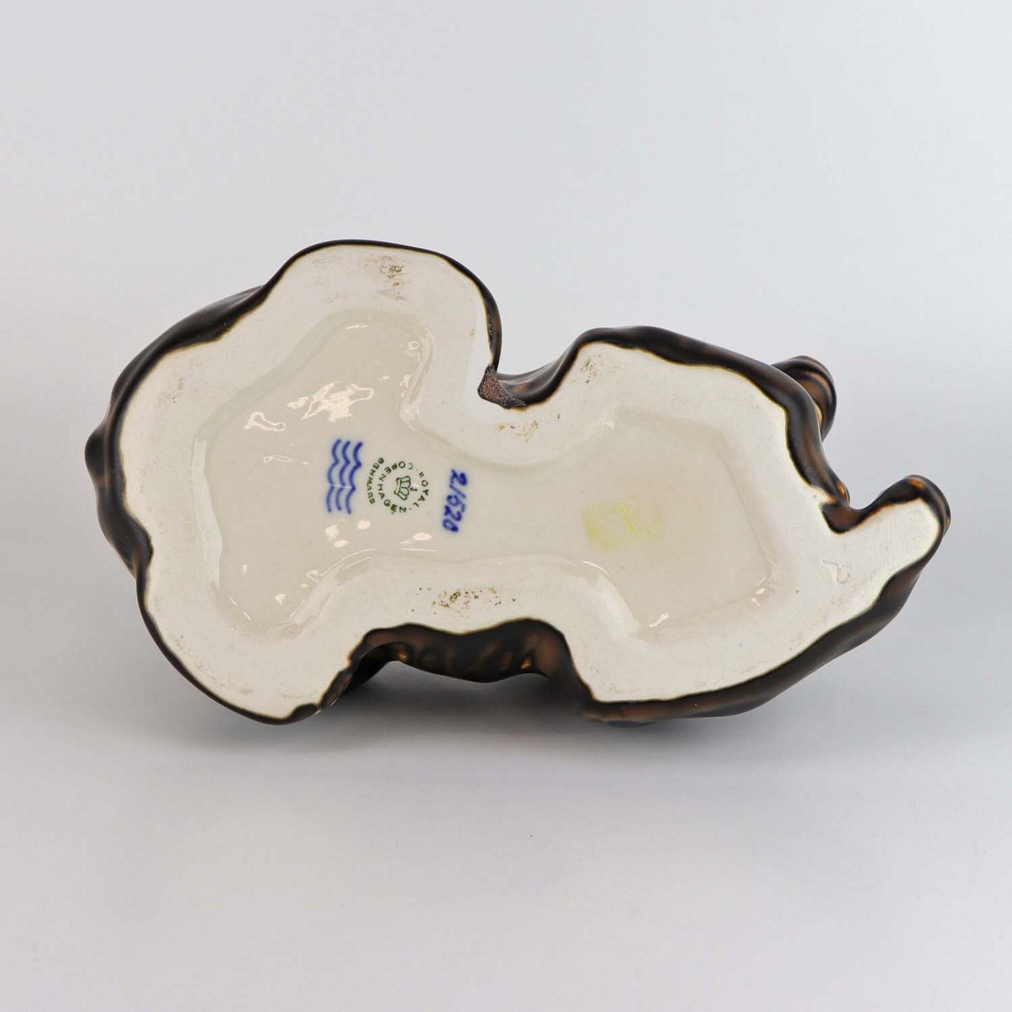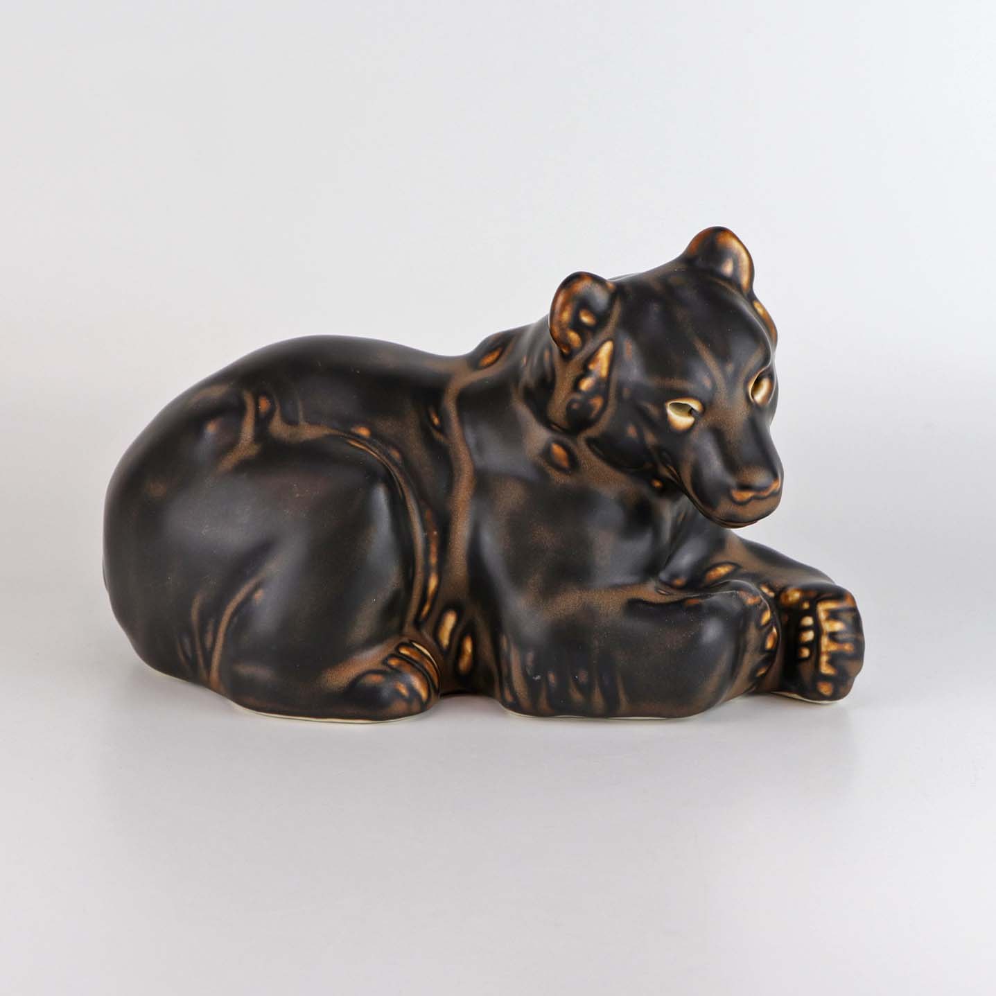 Figur i porcelæn med motiv af en liggende brun bjørn. Nr. 2/520