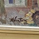Oliemaleri på lærred, sat i guldramme, med motiv af huse og træer uden blade.