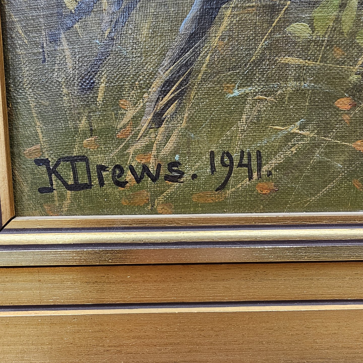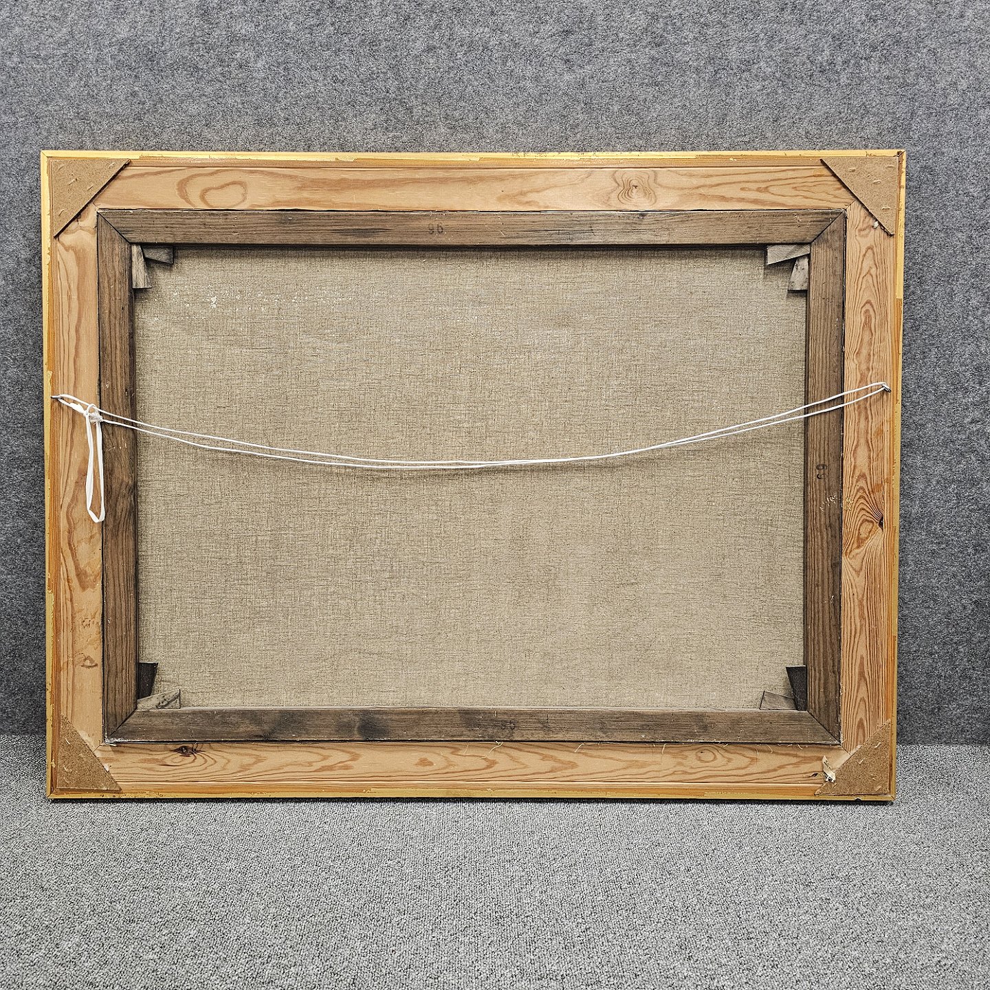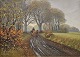 Oliemaleri på lærred, sat i guldramme, med motiv af en hestevogn som kører på en mudret vej gennem en skov.
