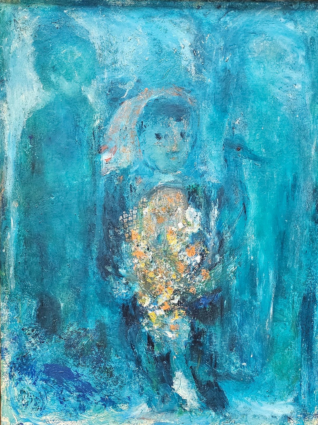 Oliemaleri på lærred, sat i træramme, med motiv af en kvinde med blomster i favnen, i blå nuancer.