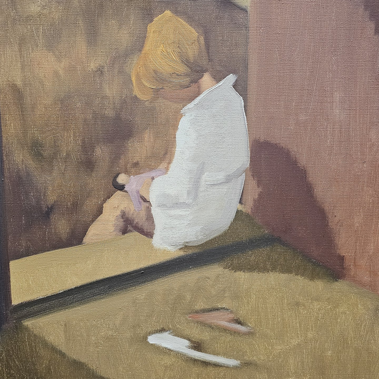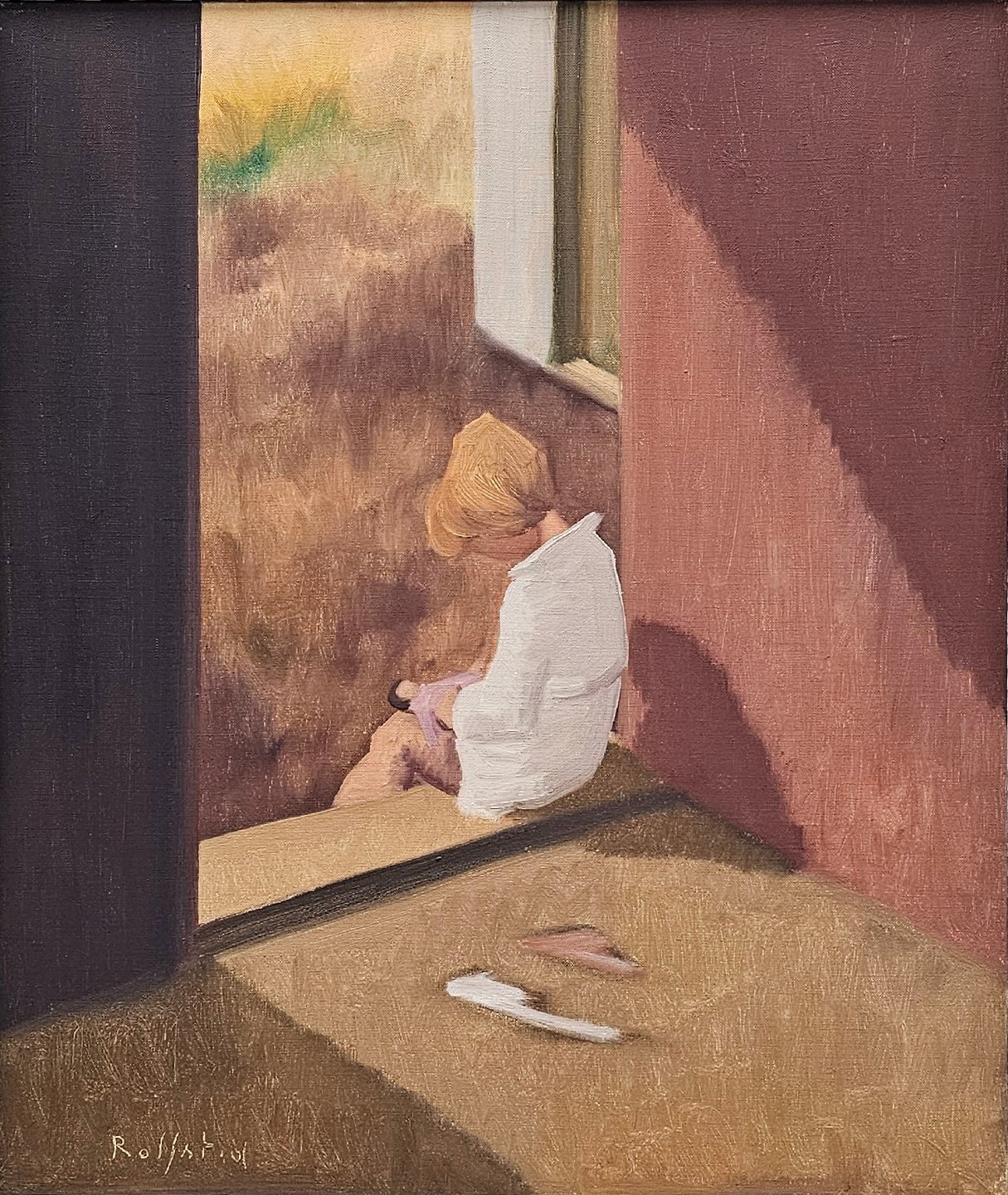 Oliemaleri på lærred, sat i træramme, med motiv af et barn der sidder i en døråbning med en dukke.