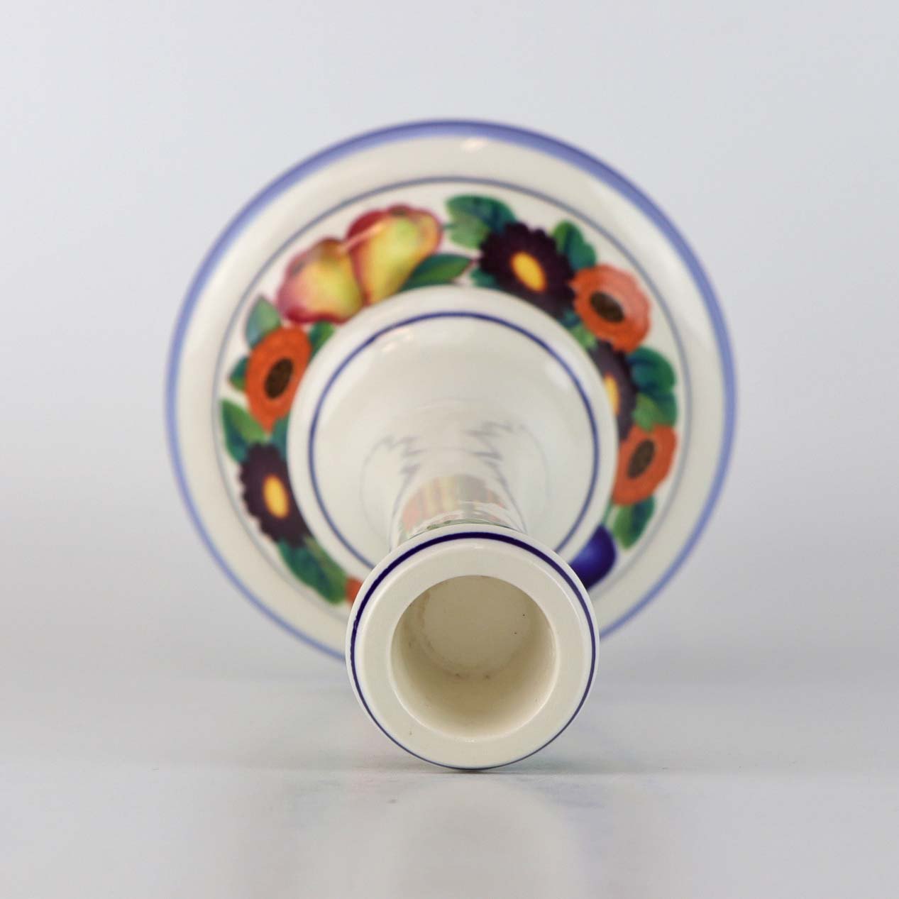 Tallerken i glat hvidt porcelæn med blå kant og dekoreret med sommerblomster og frugter