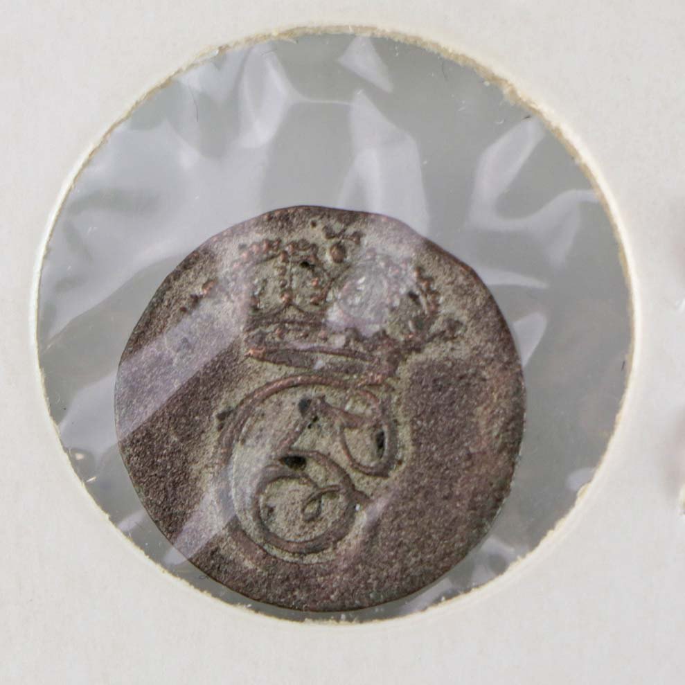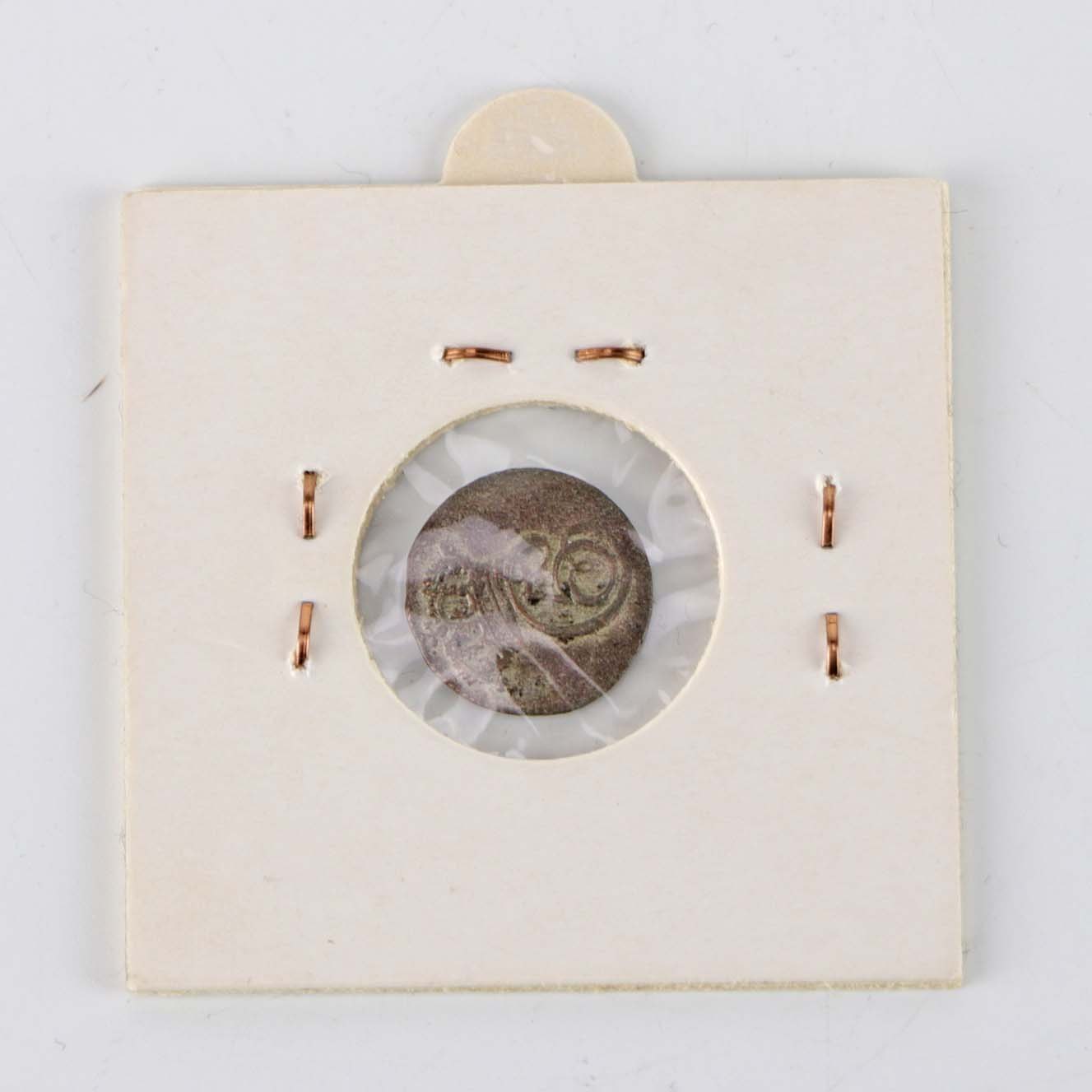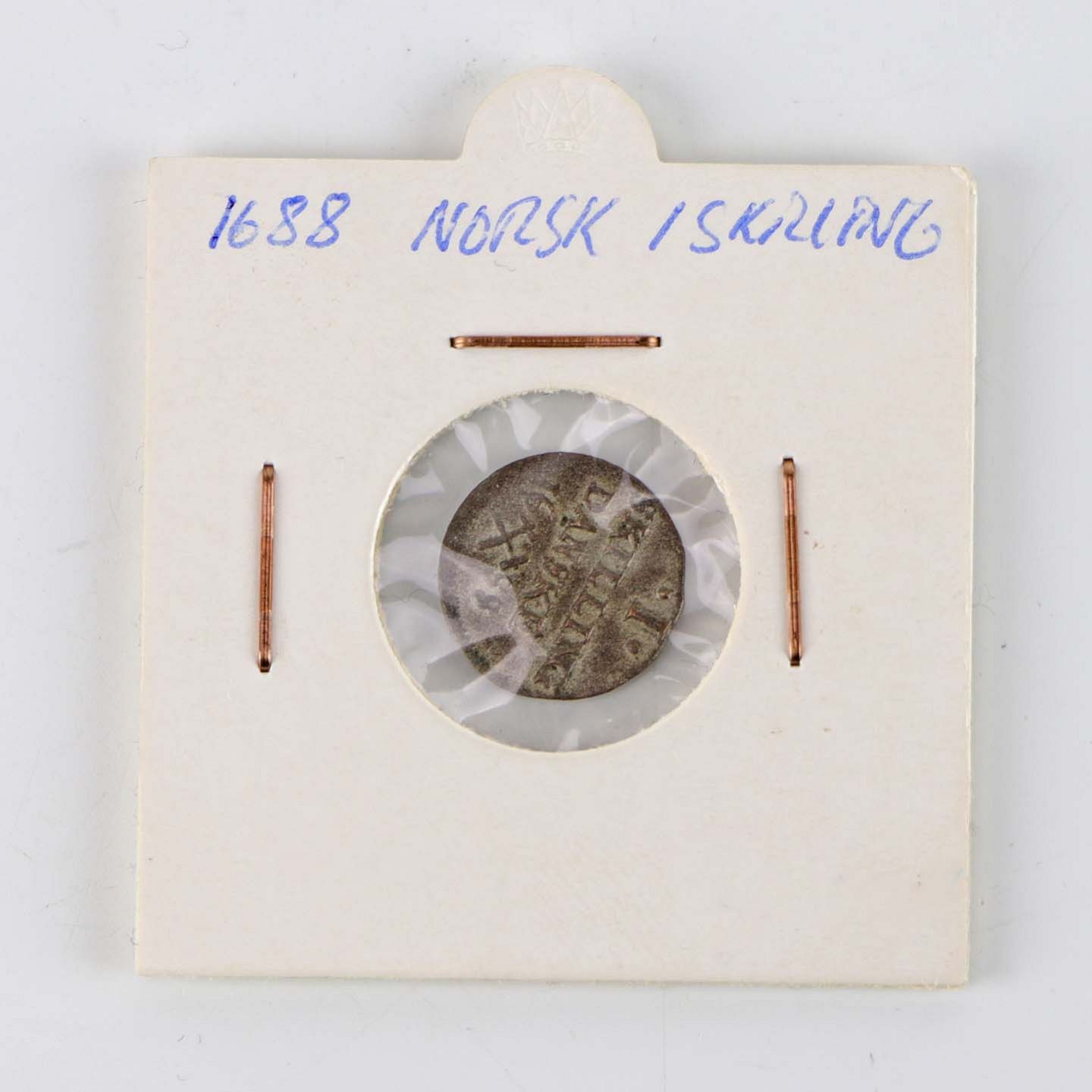 Antik mønt fra år 1688 med teksten 1 skilling Danske 1688 samt krone og monogram på bagsiden. Mønten er lavet på Kongsberg og har sølvmærket med 2 hamre på kryds