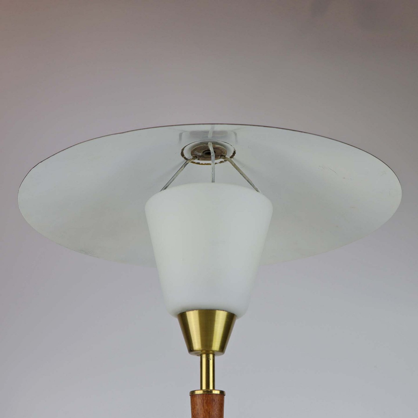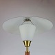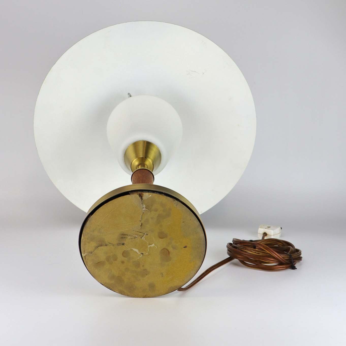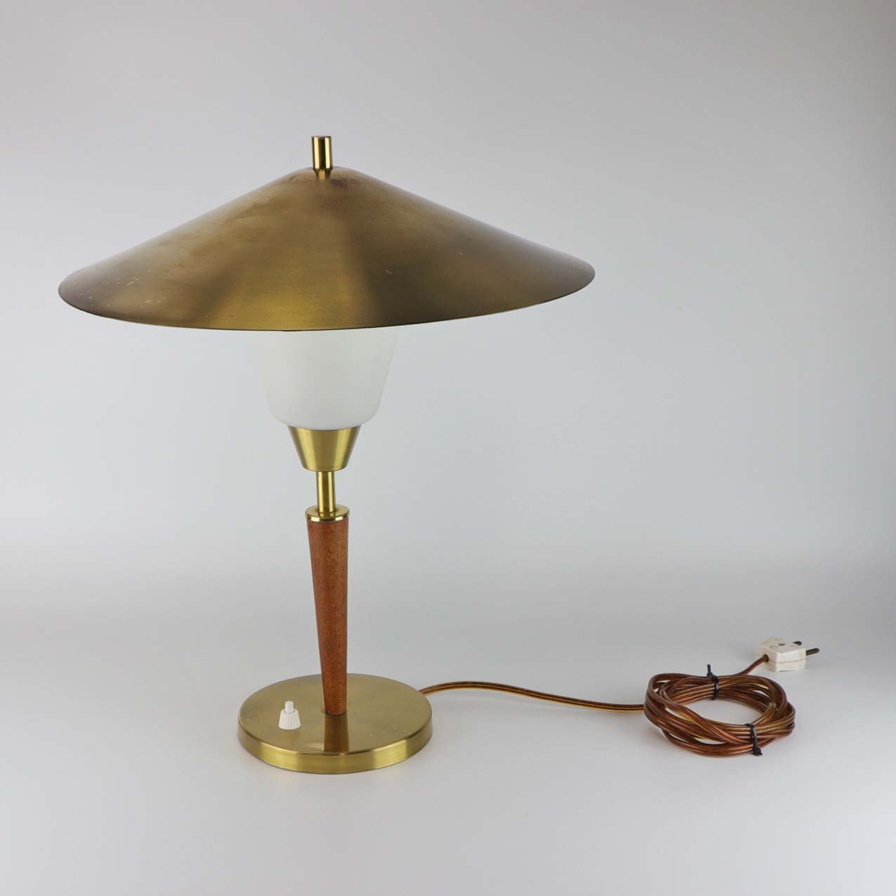 Ældre bordlampe med skærm og fod i messing, stamme af teaktræ samt opalhvid glasindsats.