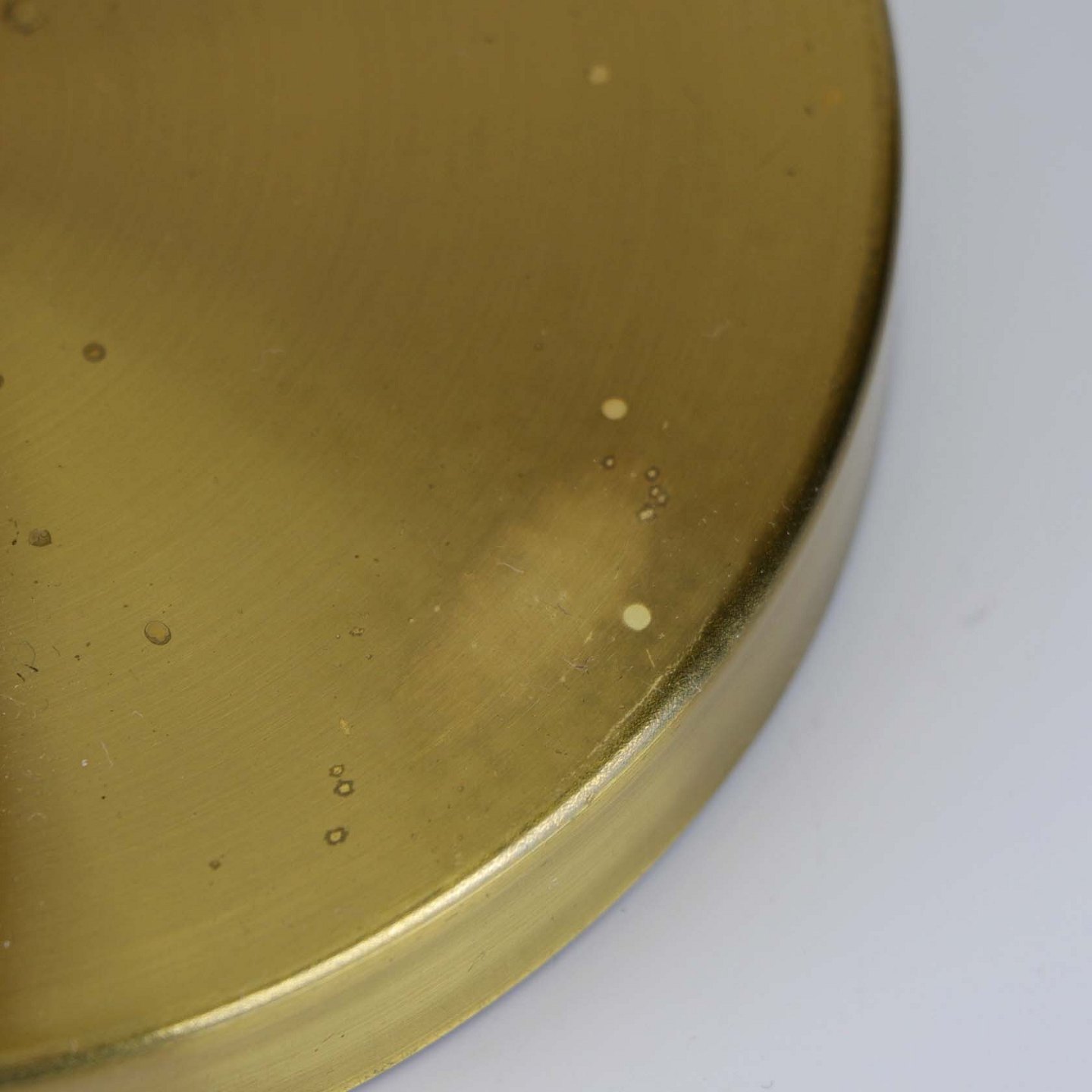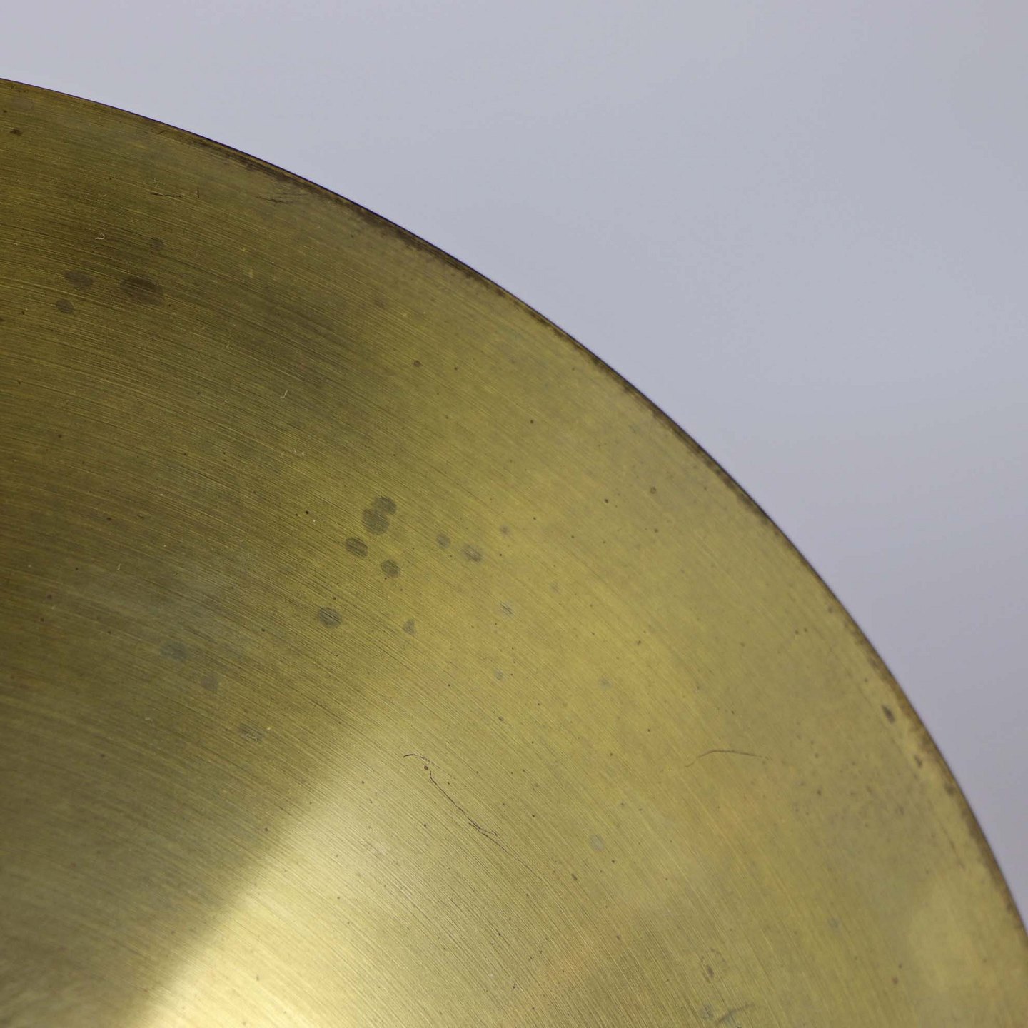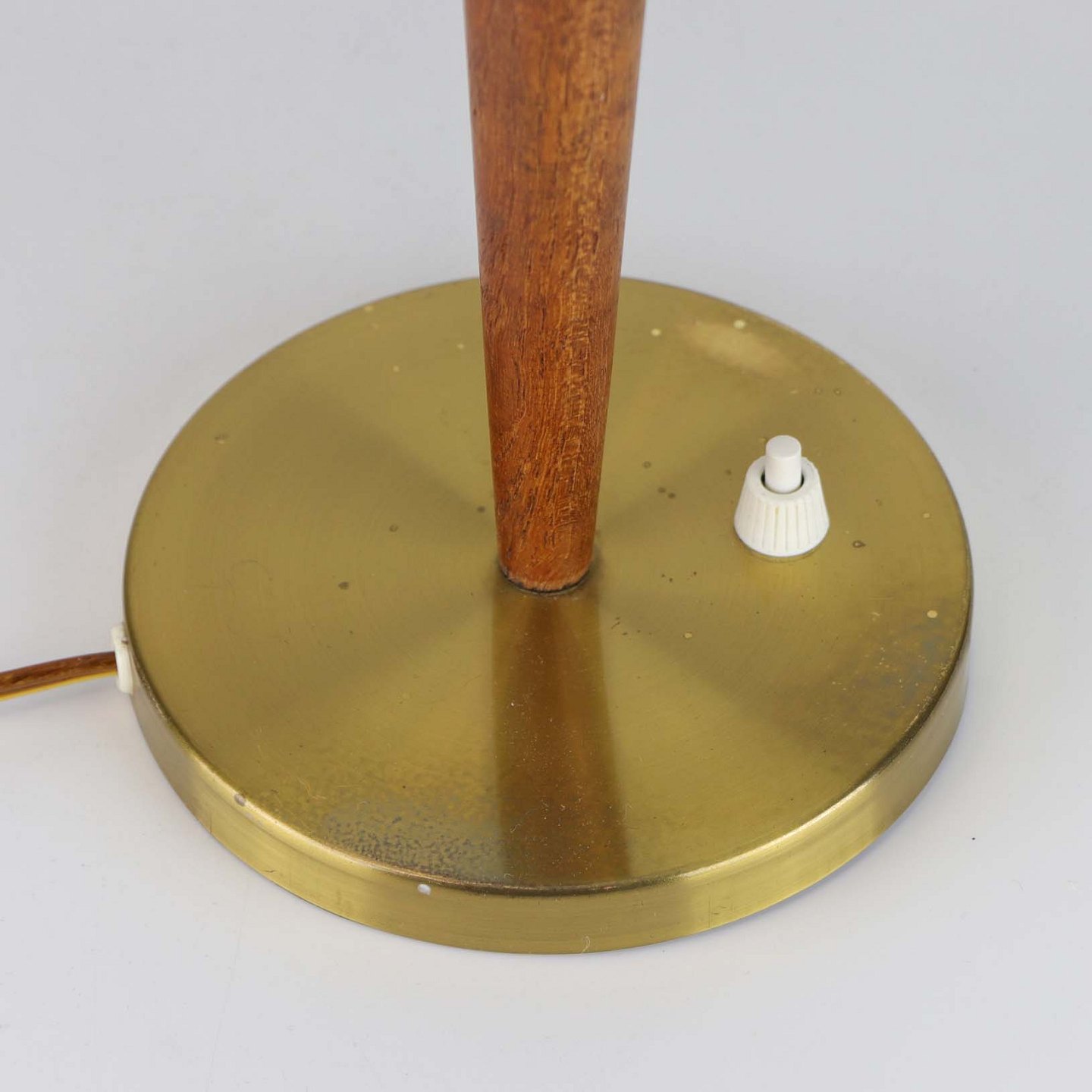 Ældre bordlampe med skærm og fod i messing, stamme af teaktræ samt opalhvid glasindsats.