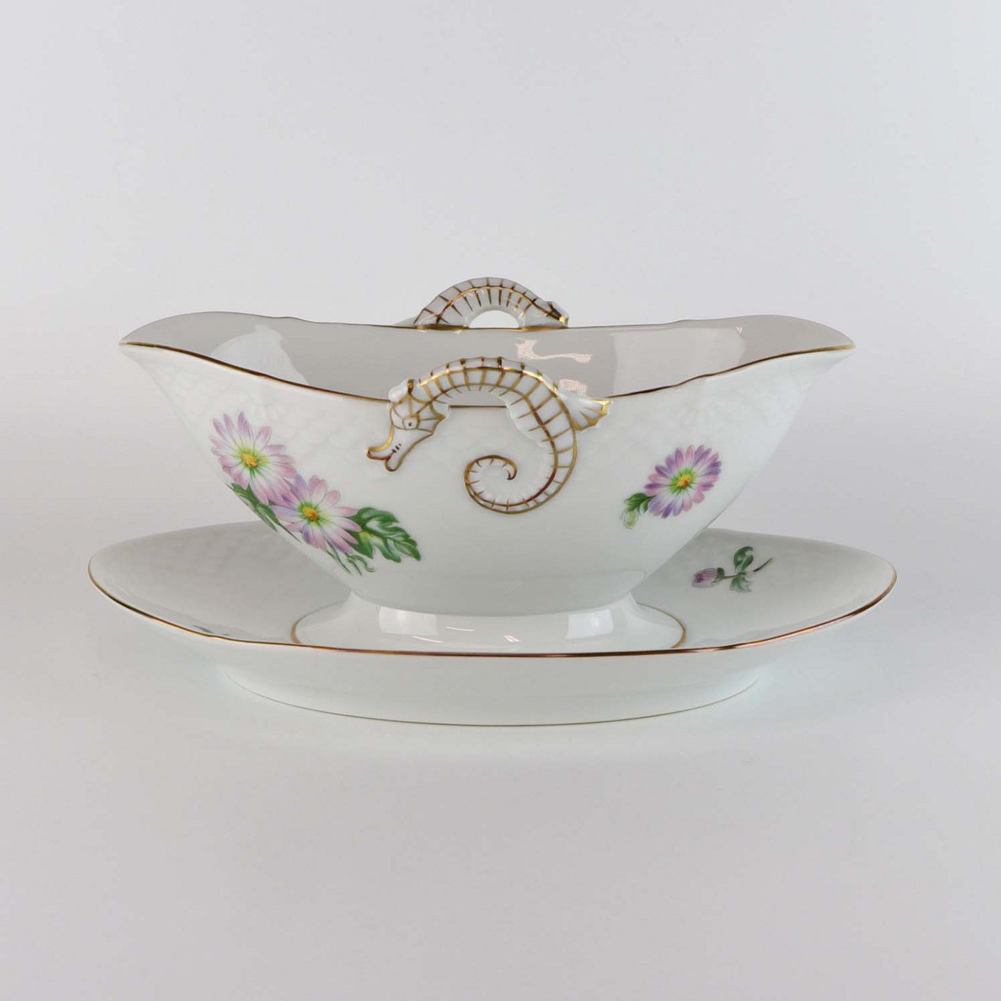 Stellet Krysantemum er af hvidt porcelæn, dekoreret med lys lilla blomst, grønne blade og guldfarvet kant.