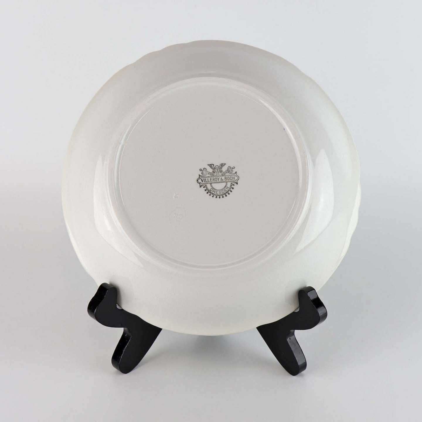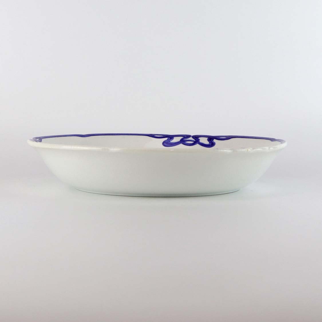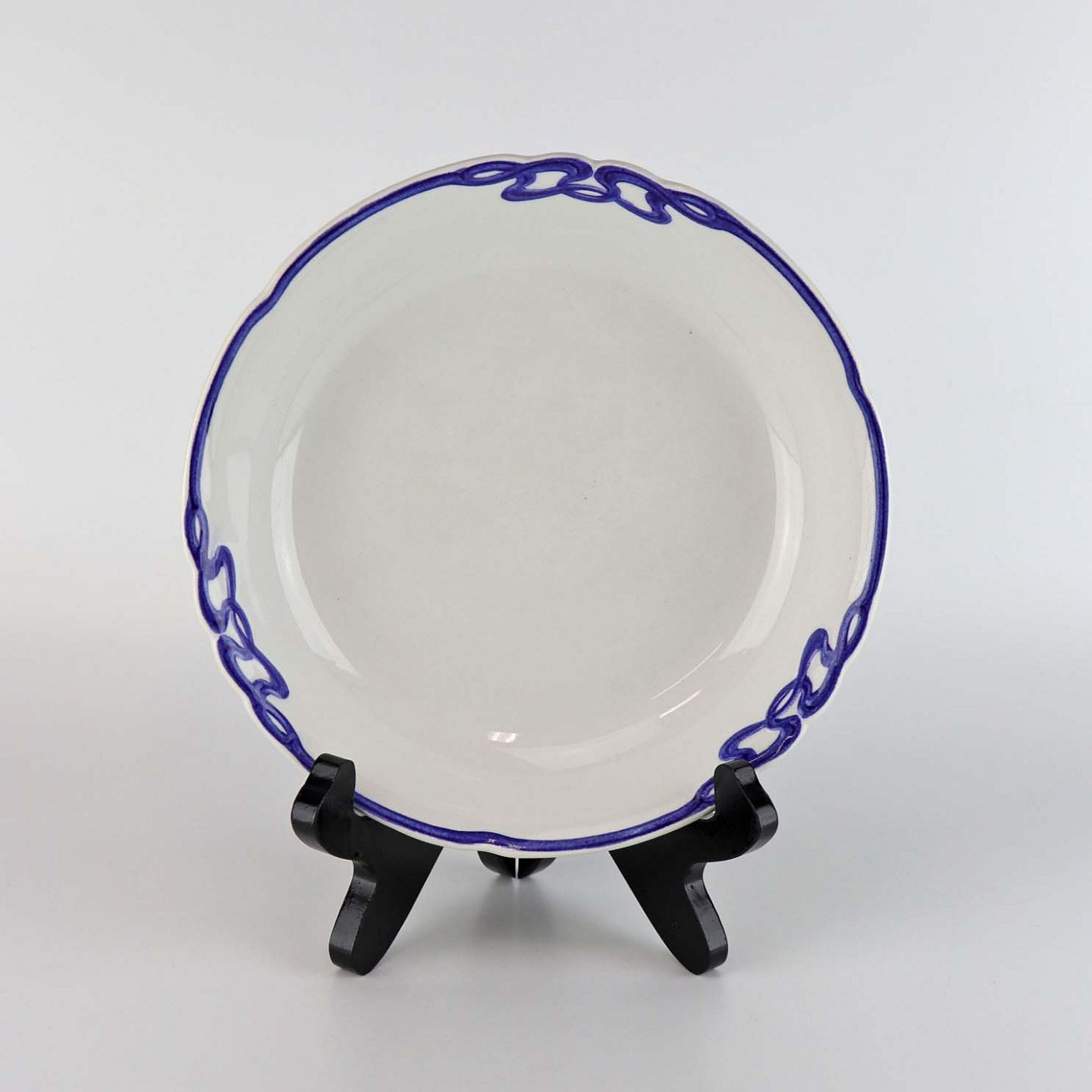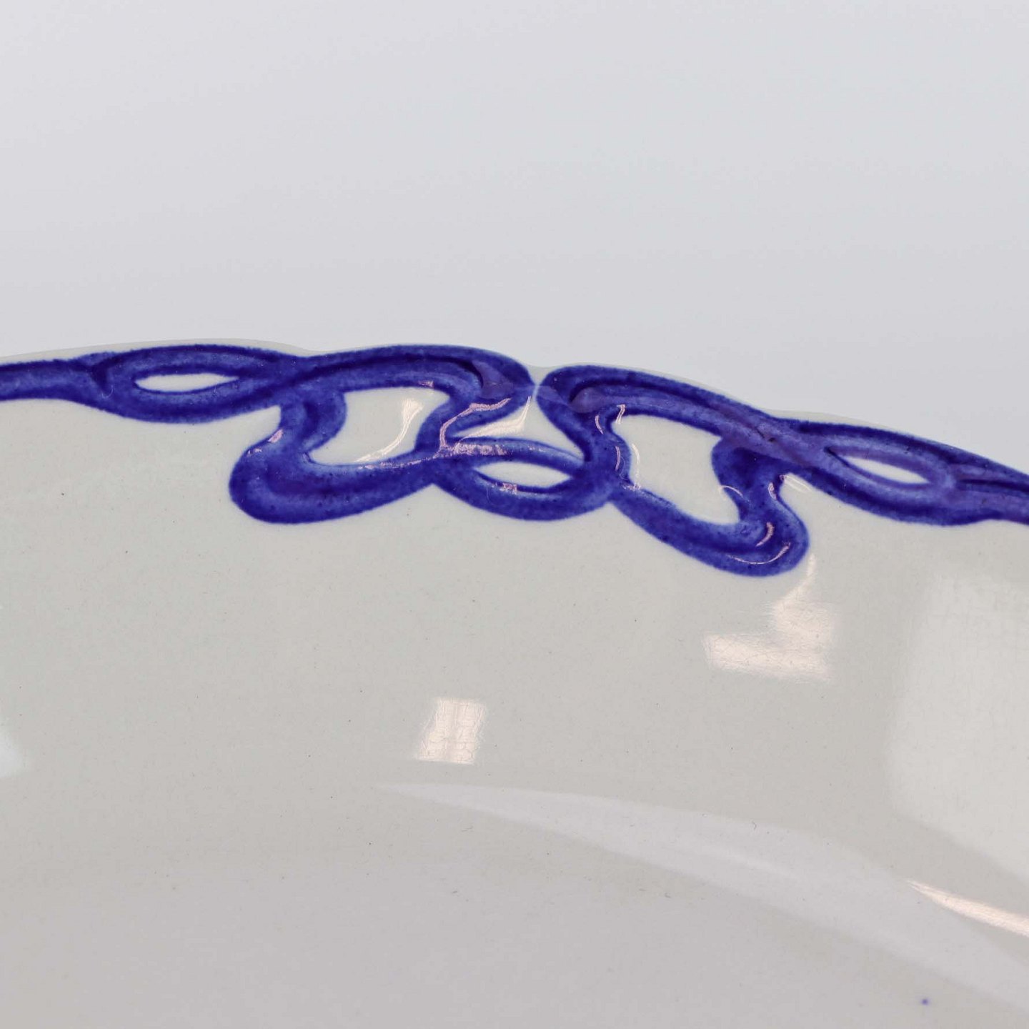Blå Olga er hvid fajance dekoreret med blå abstrakt mønster langs kanten