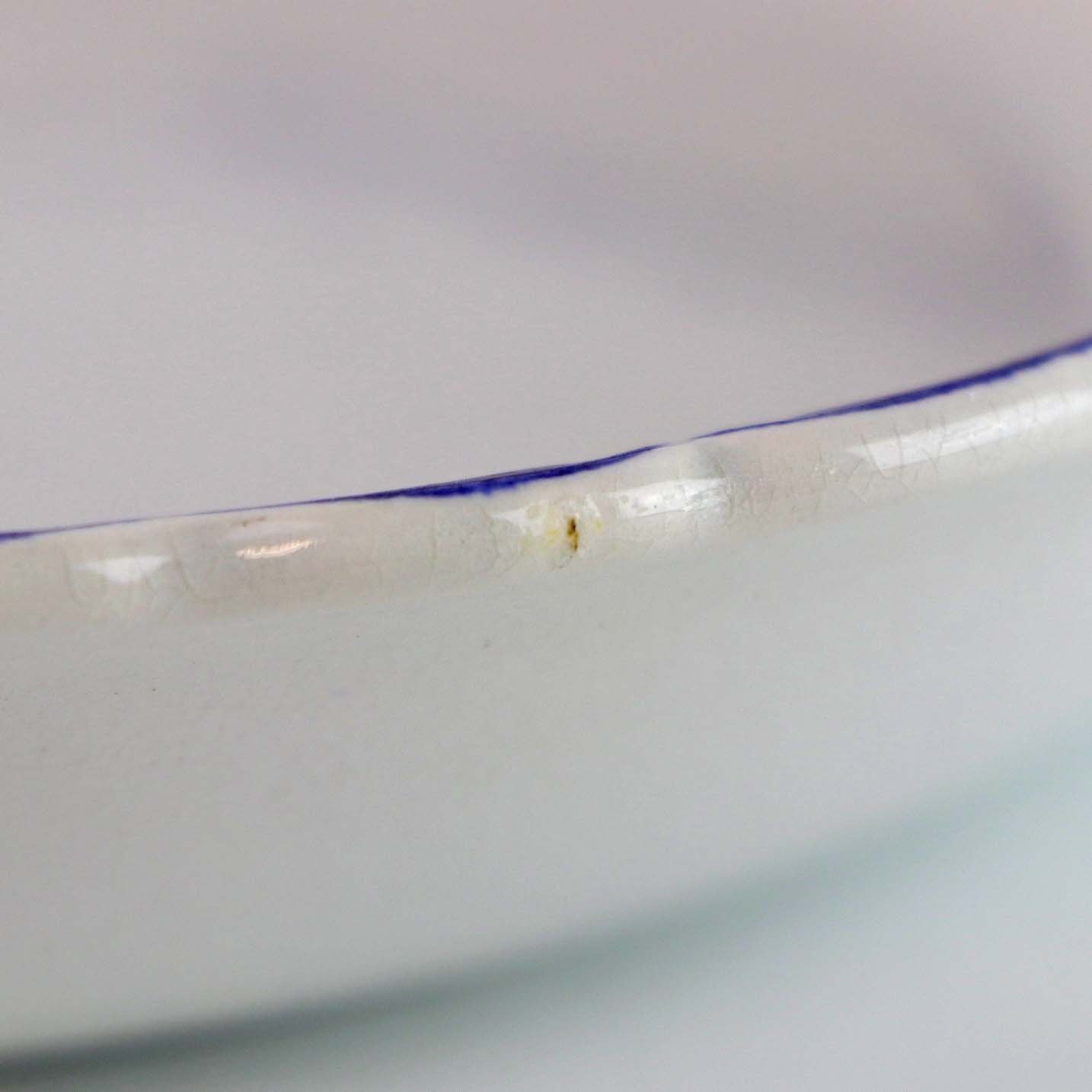 Fremstår med krakeleringer i glasuren og mindre misfarvning ved kant.