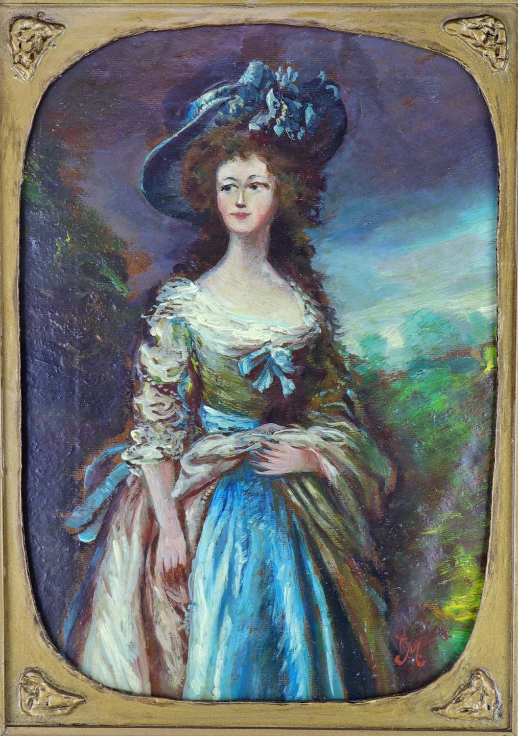 Gammel maleri på plade i malet gipsramme. Reproduktion af Thomas Gainsborough's portræt af Sophia Charlotte Digby, Lady Sheffield