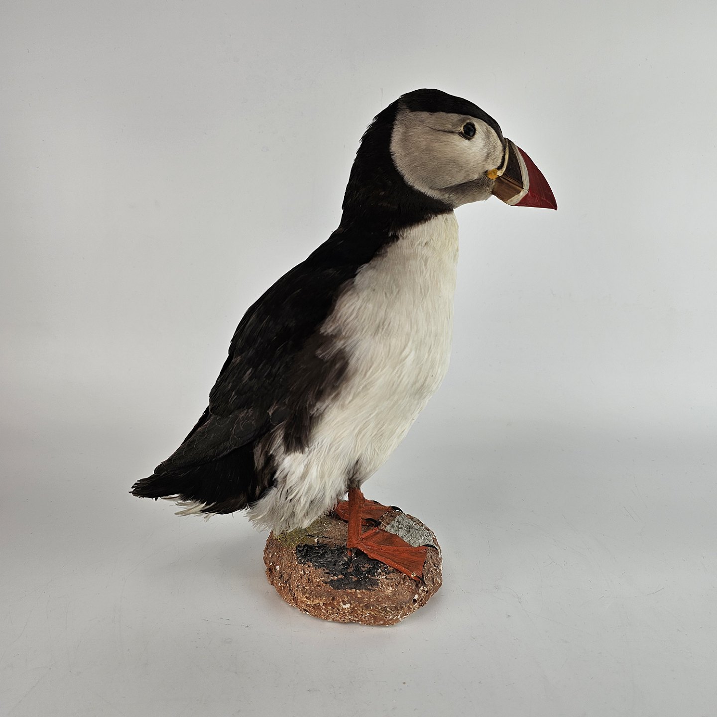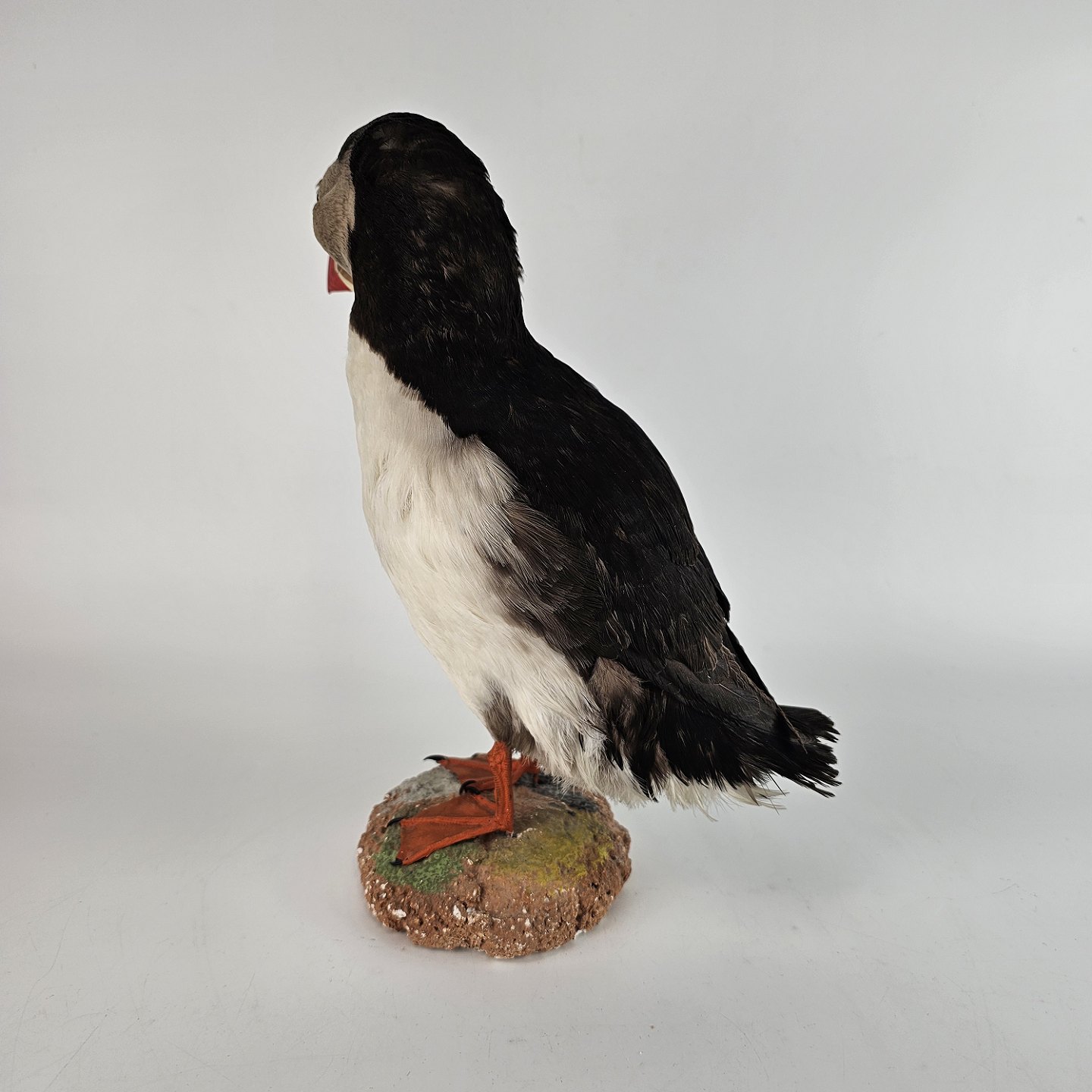 Udstoppet Lunde, kaldet søpapegøje. Fuglen er monteret på fod.