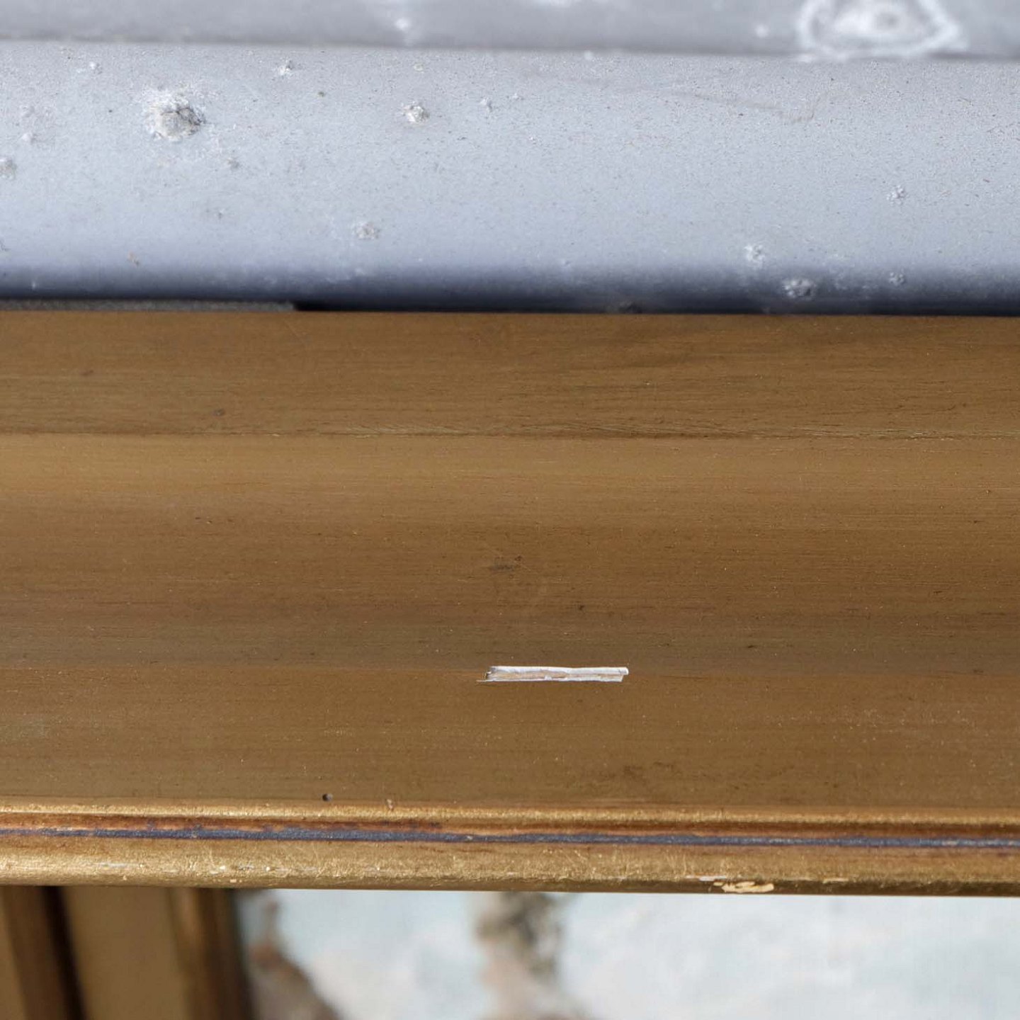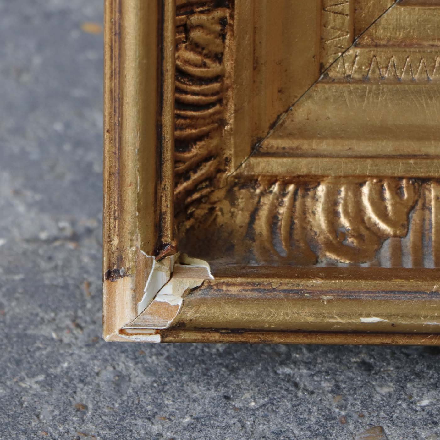 Oliemaleri på lærred i guldmalet træramme med dekoration. Vinterlig byskabsmaleri med to kvinder blandt gamle bygningsværker.