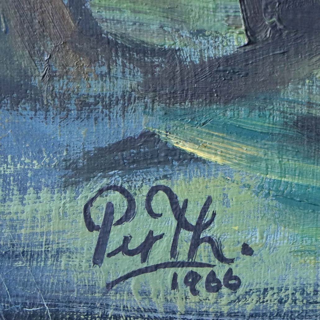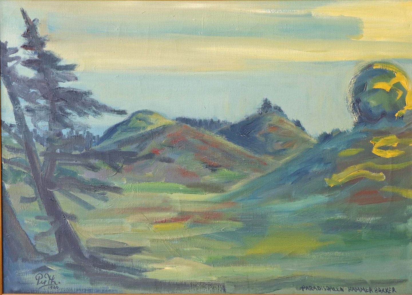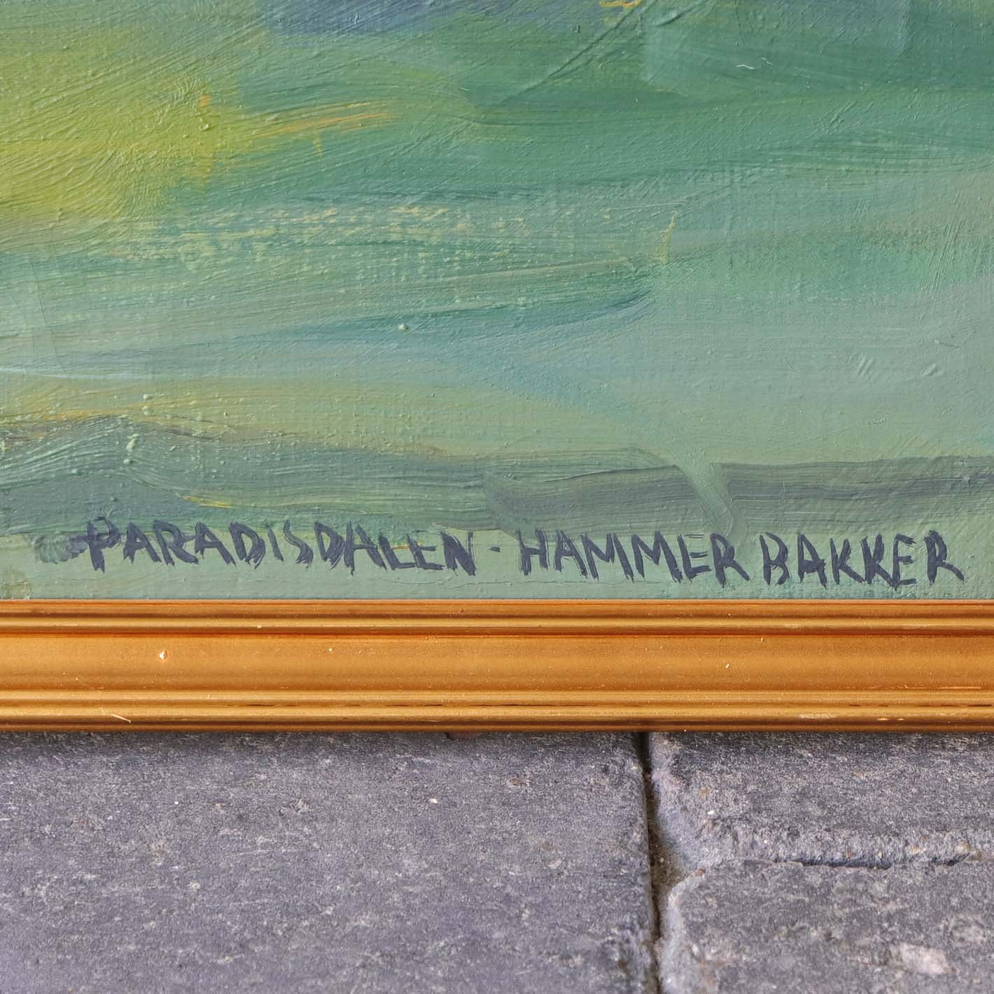 Oliemaleri på lærred i guldmalet træramme med motiv af Paradisdalen i Hammer bakker. Dateret 1966