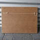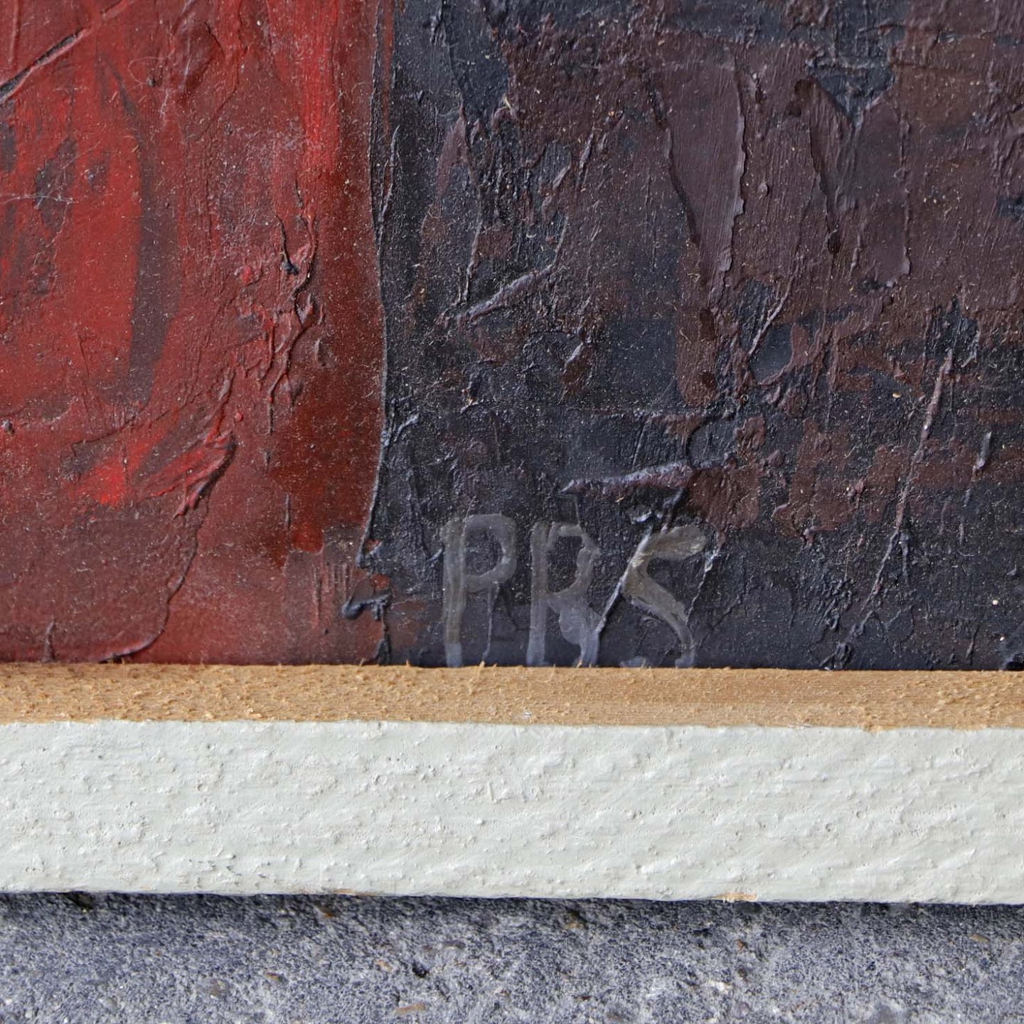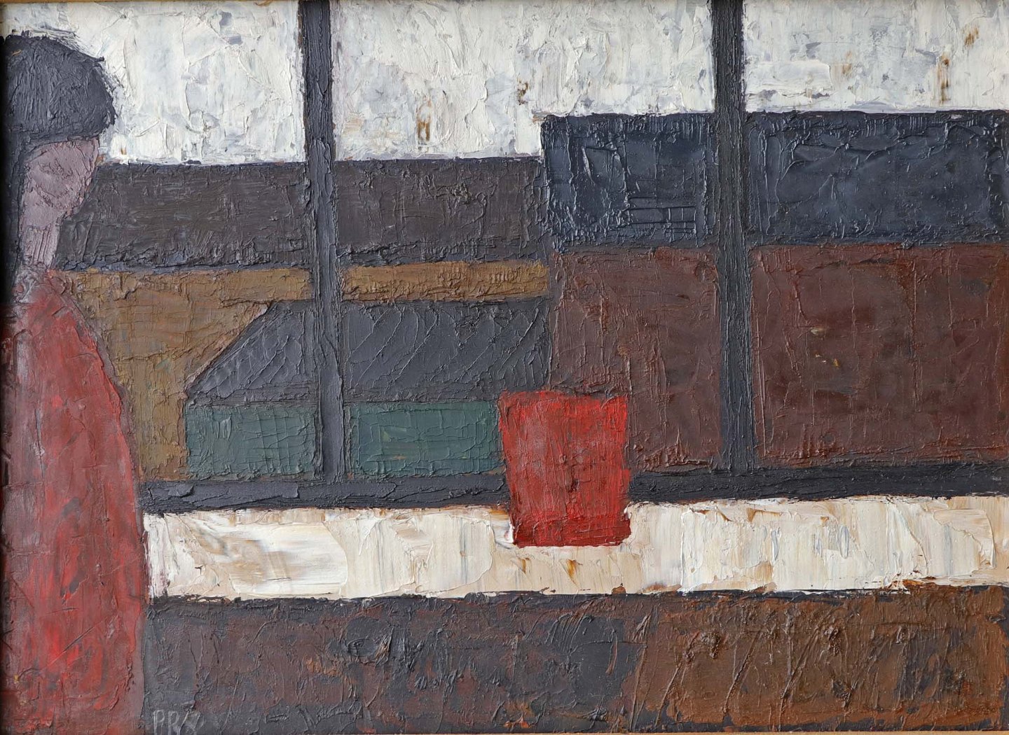 Oliemaleri på plade i hvidmalet træramme med motiv af kvinde i byskabsområde.