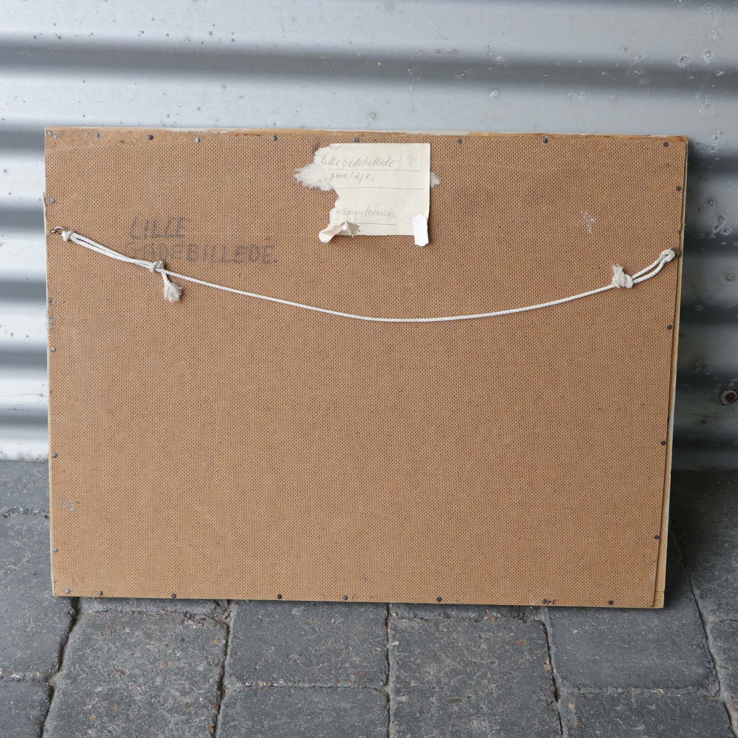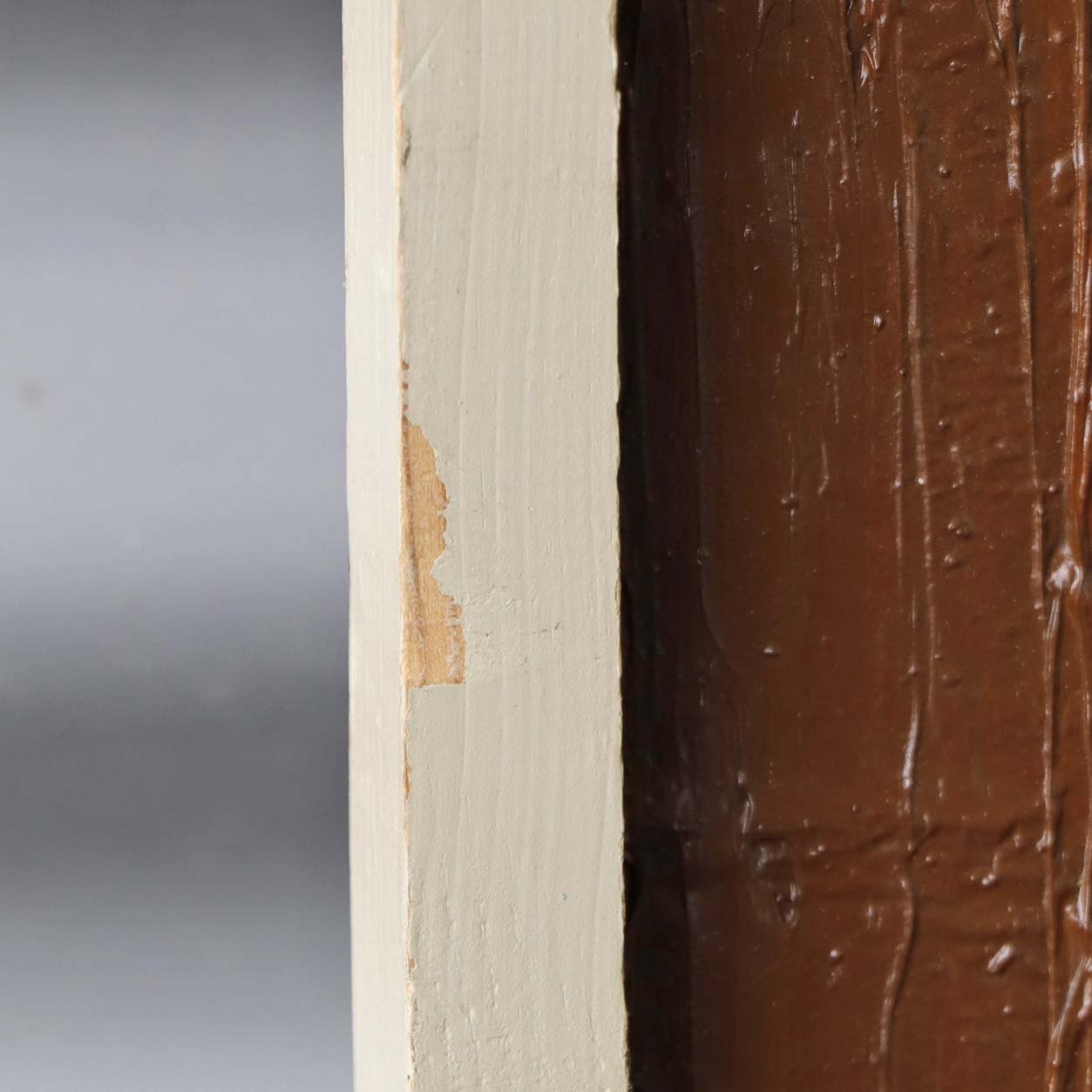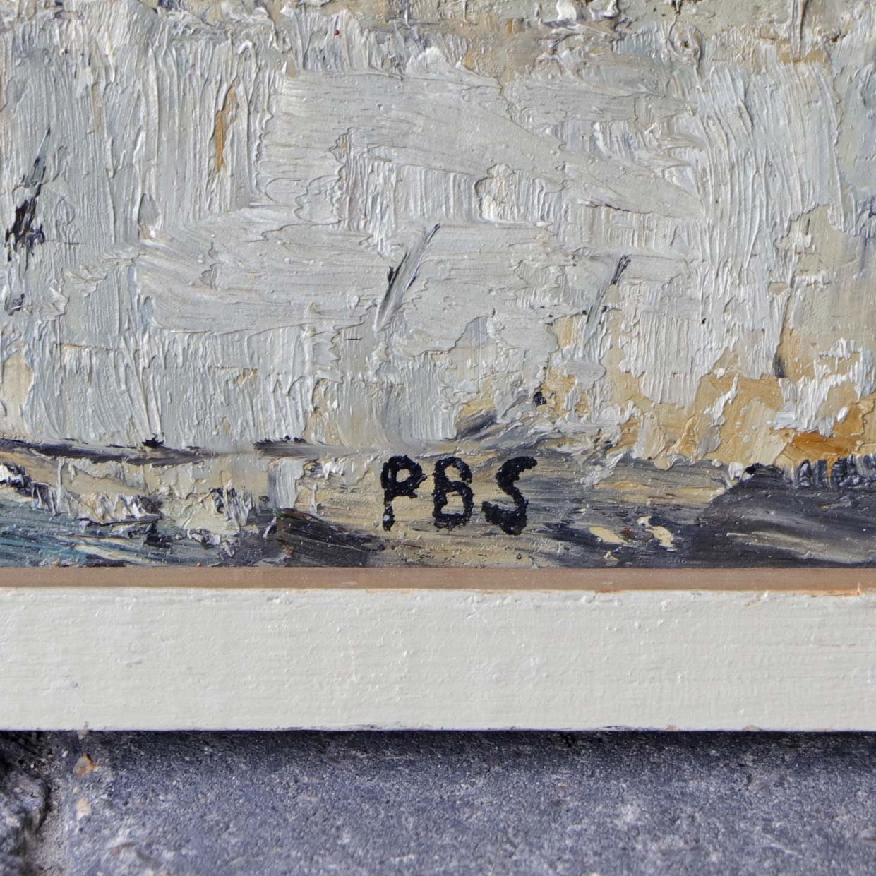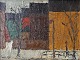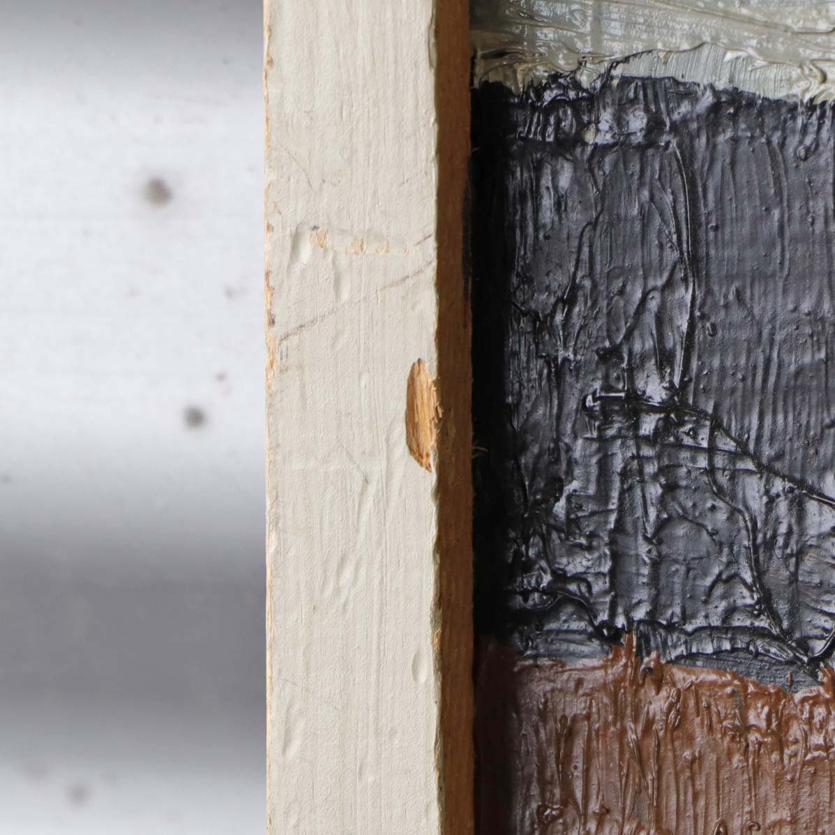 Oliemaleri på plade i hvidmalet træramme med byskabsmotiv af industriområde i struktureret maleteknik med titlen lille gadebillede.