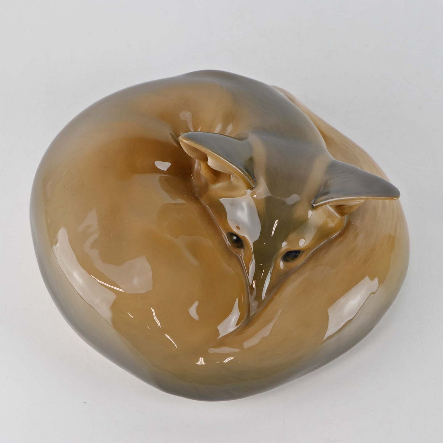 Figur i porcelæn med motiv af hvilende sammerullet ræv. Nr. 438