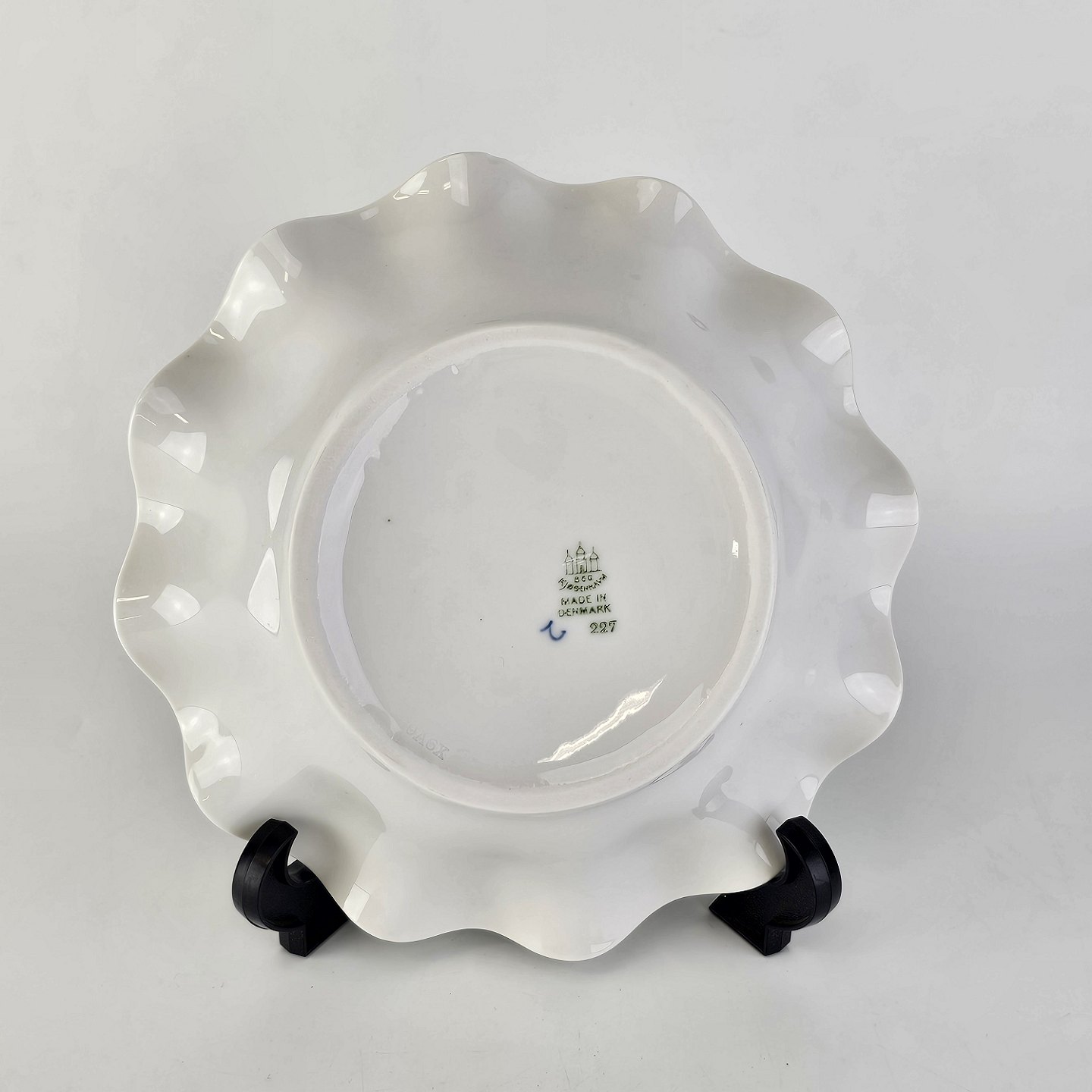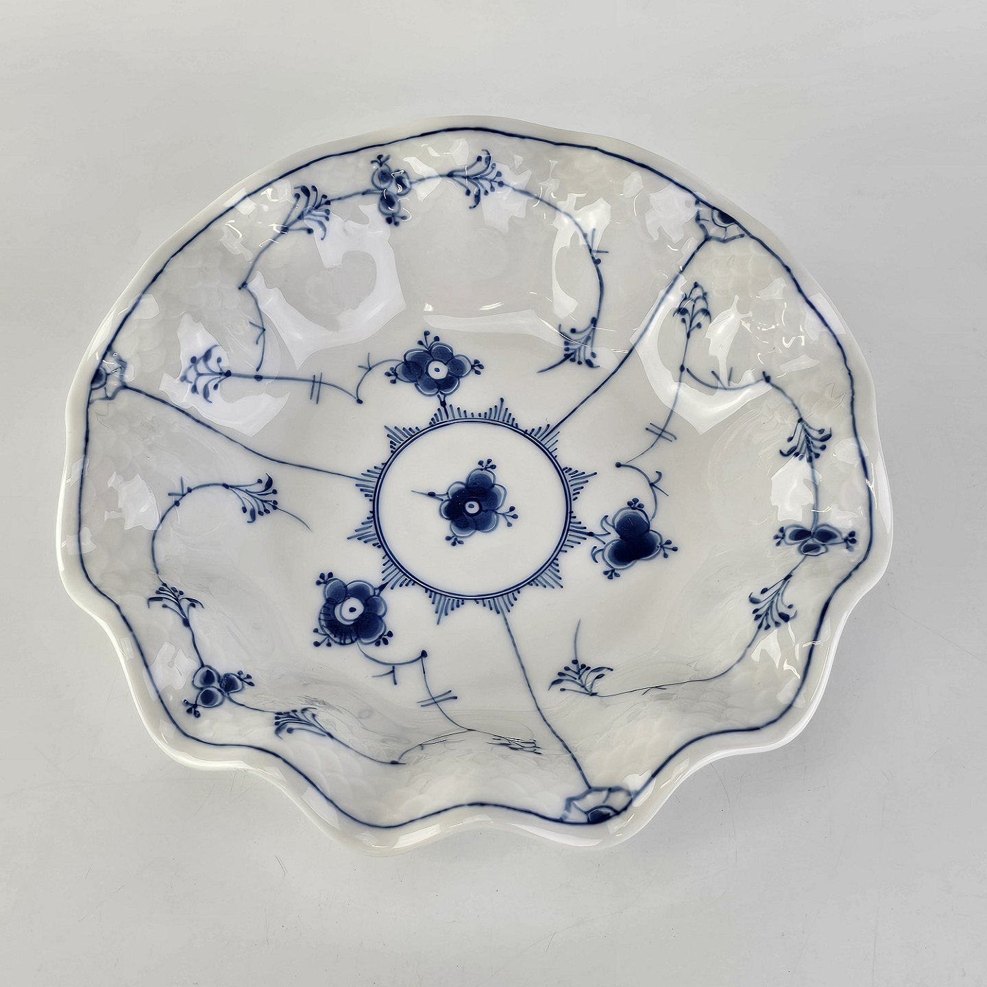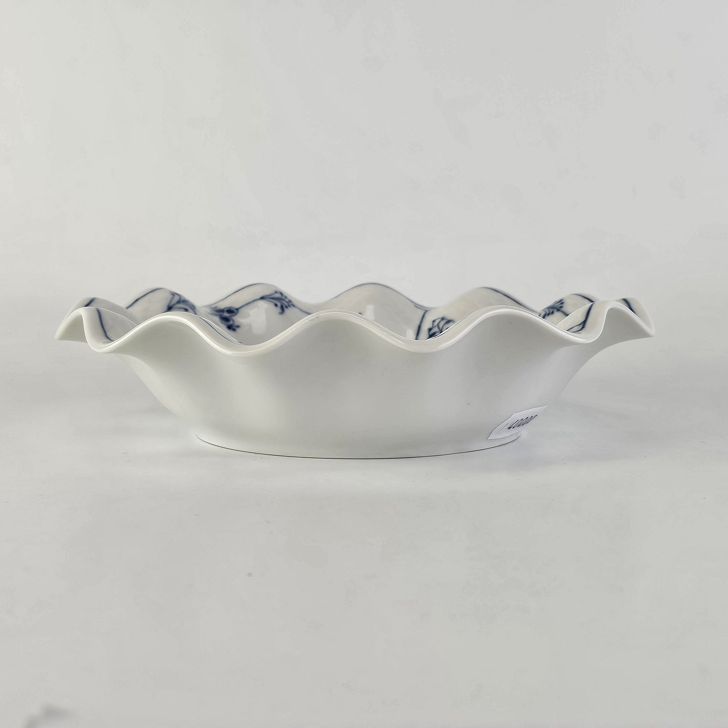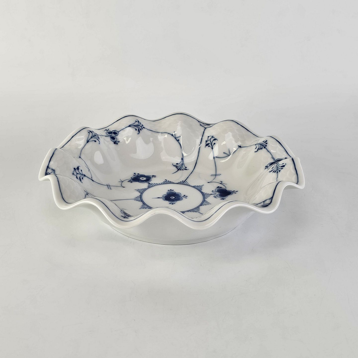 Skål med buet kant, af porcelæn, fra stellet Blåmalet med musselmalet mønster. Nr. 227.