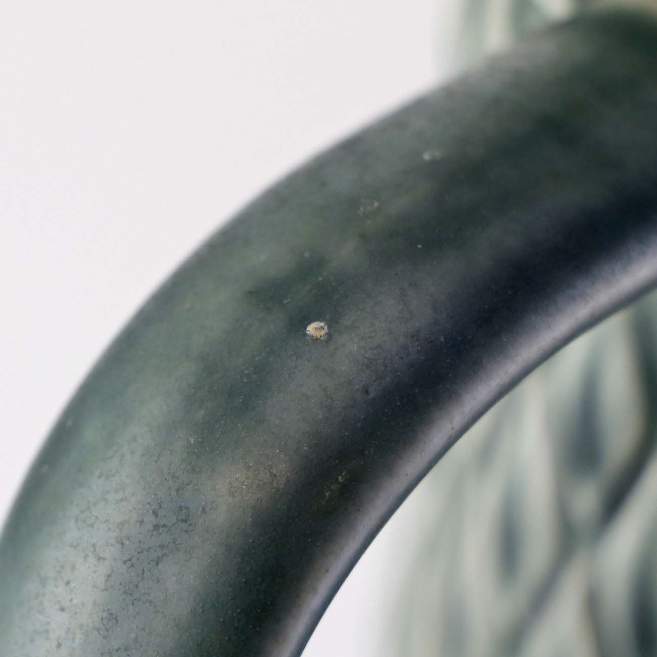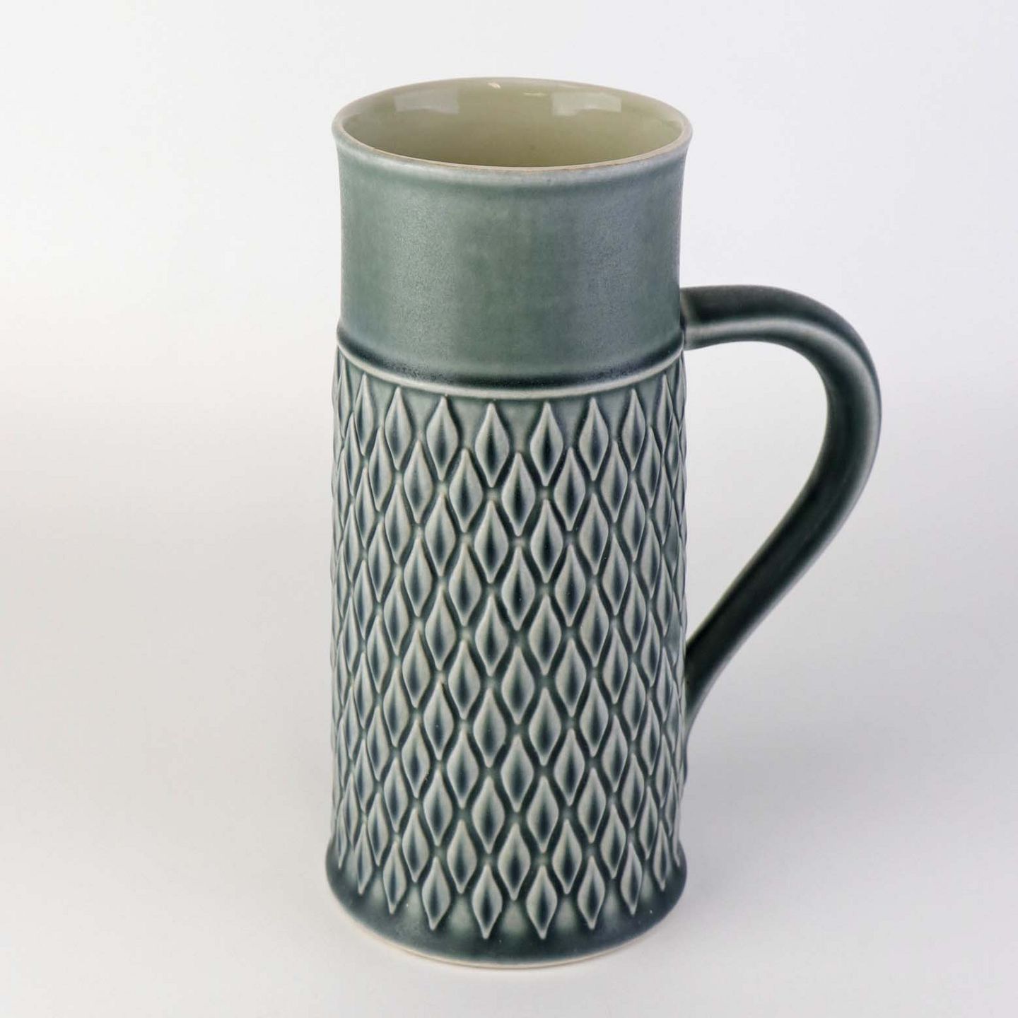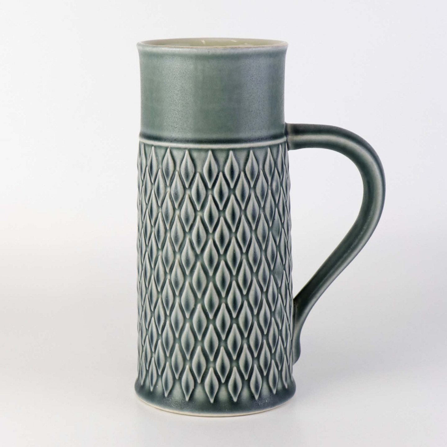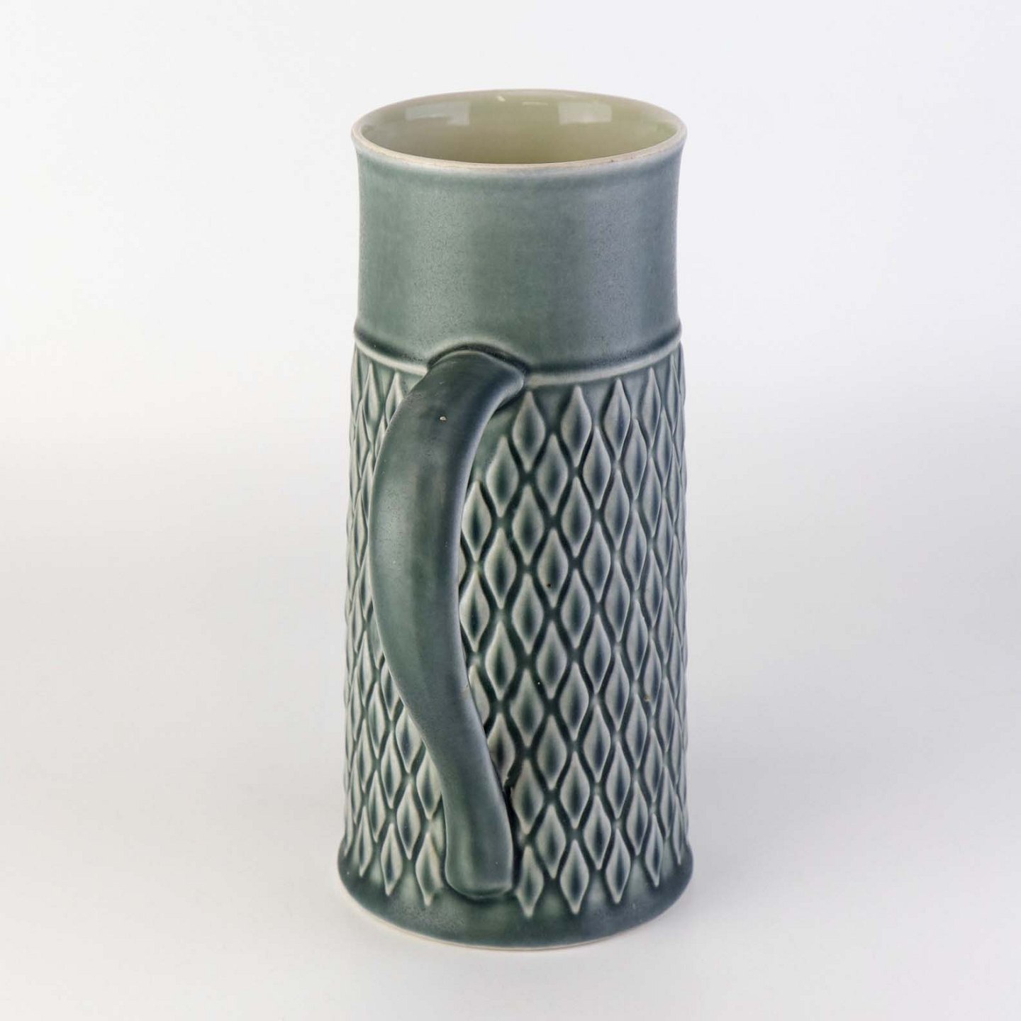 Ølkrus eller kande med hank i fajance fra serien relief men med motiv af ruder. I farven azurblå.