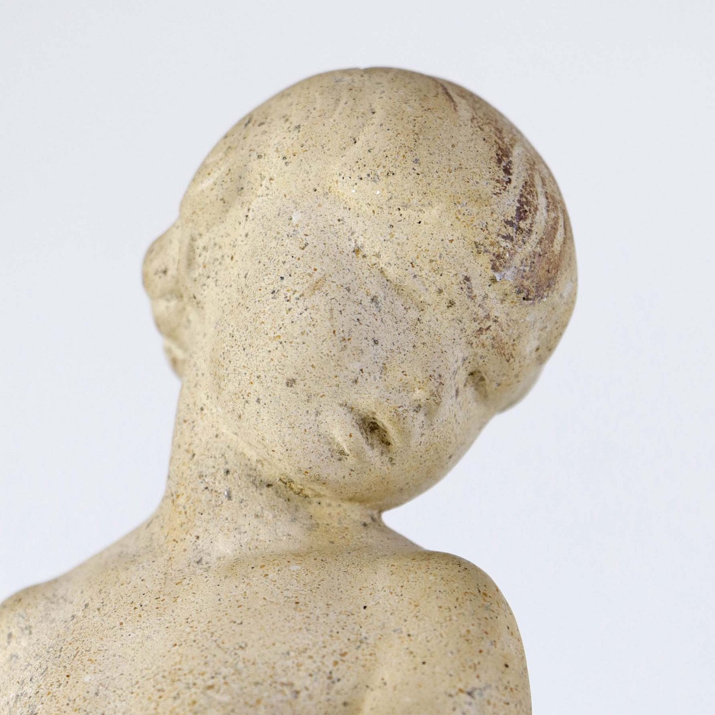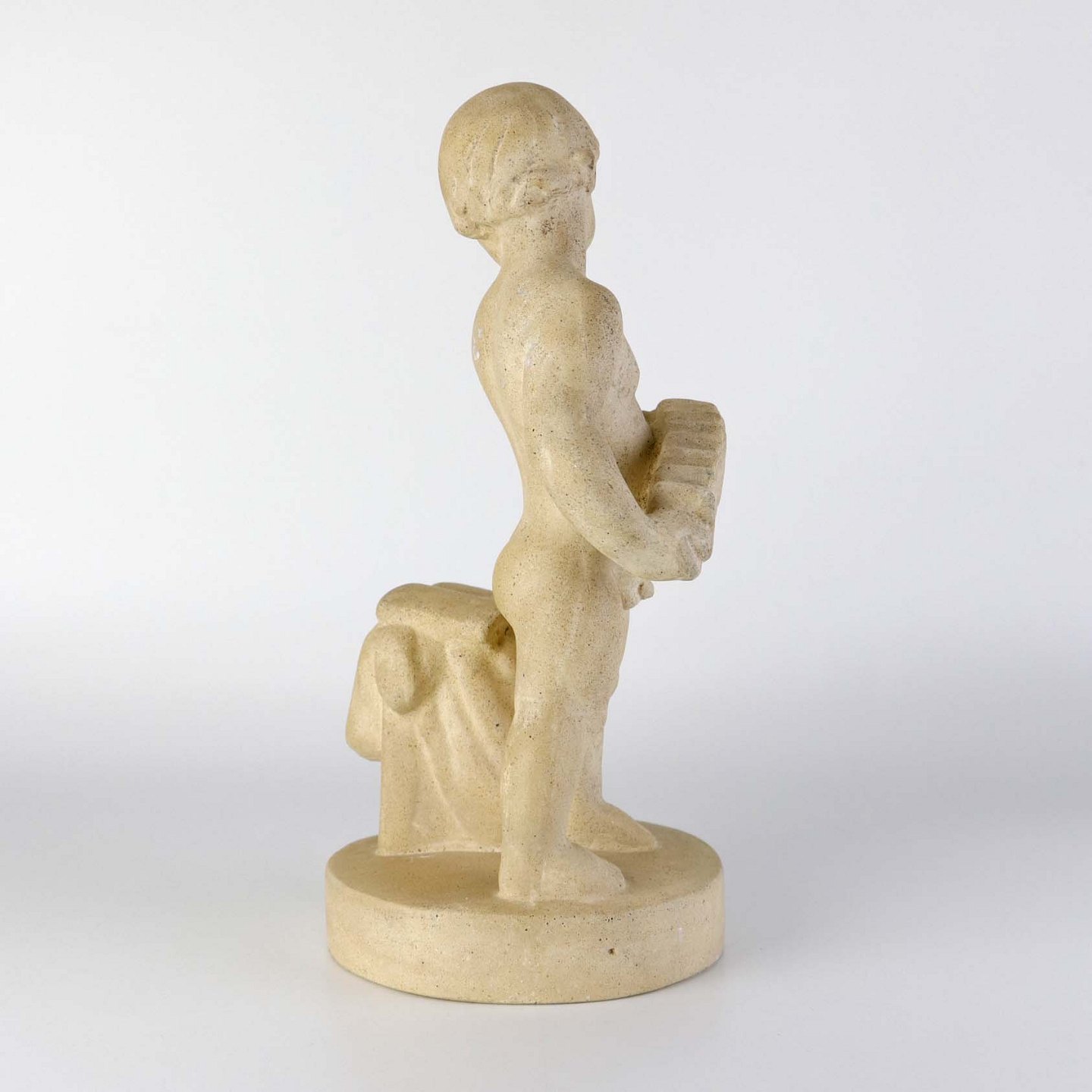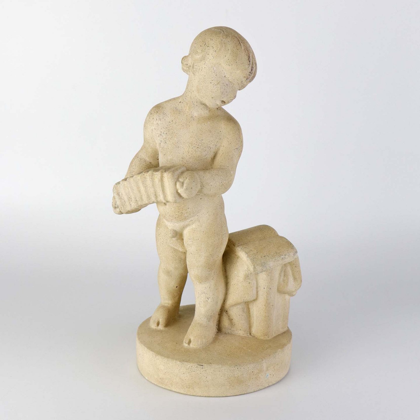 Figur i sandsten med motiv af dreng som spiller harmonika.