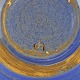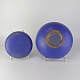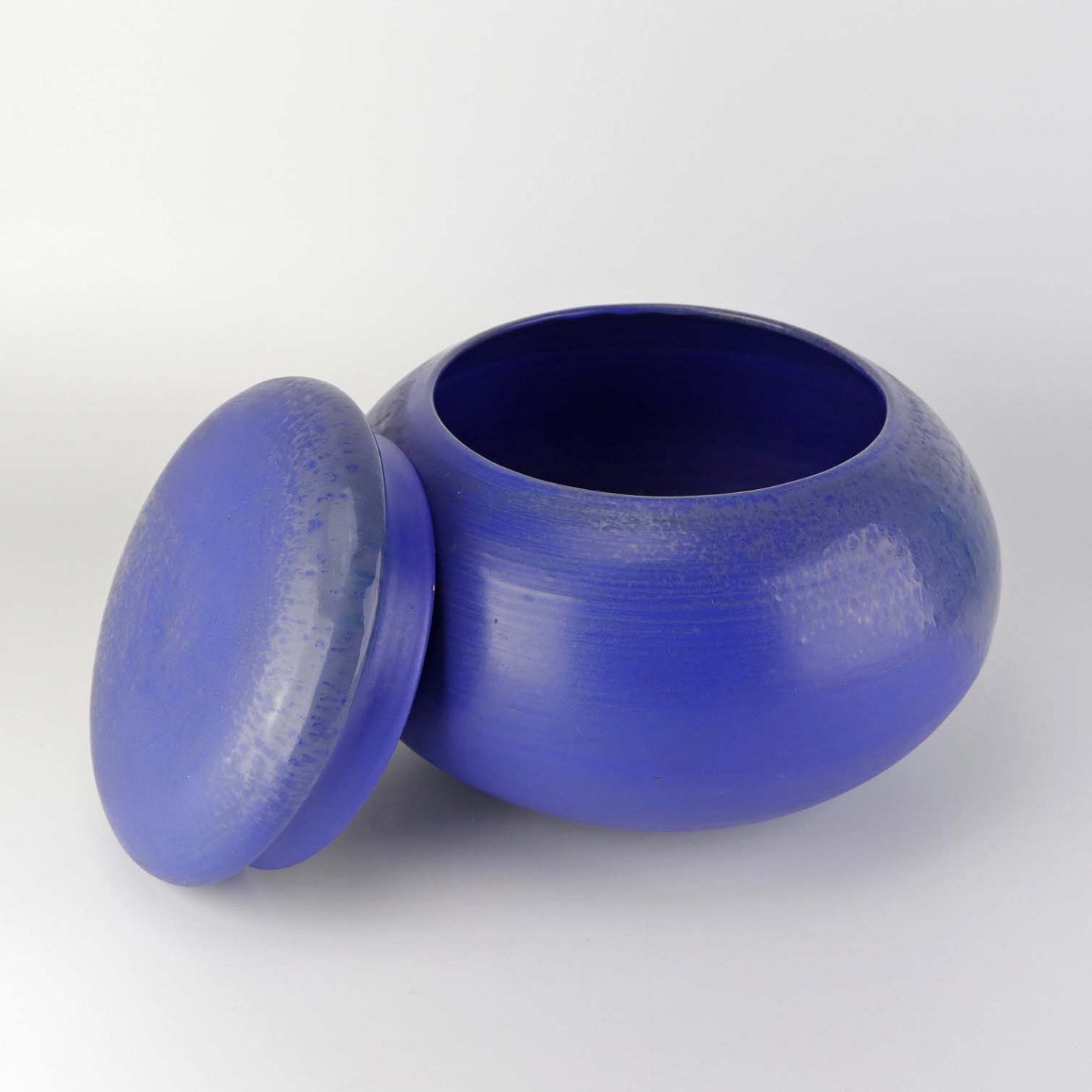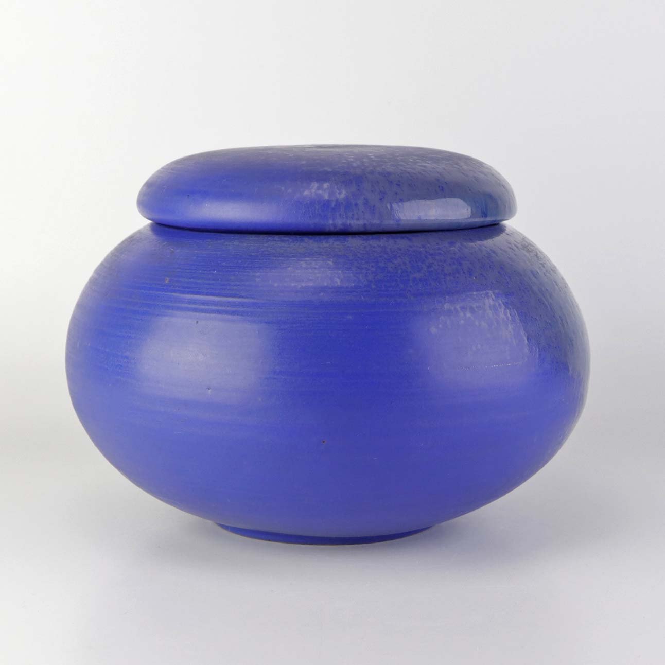 Rund krukke keramik med låg. Krukken er dekoreret med blå glasur.