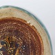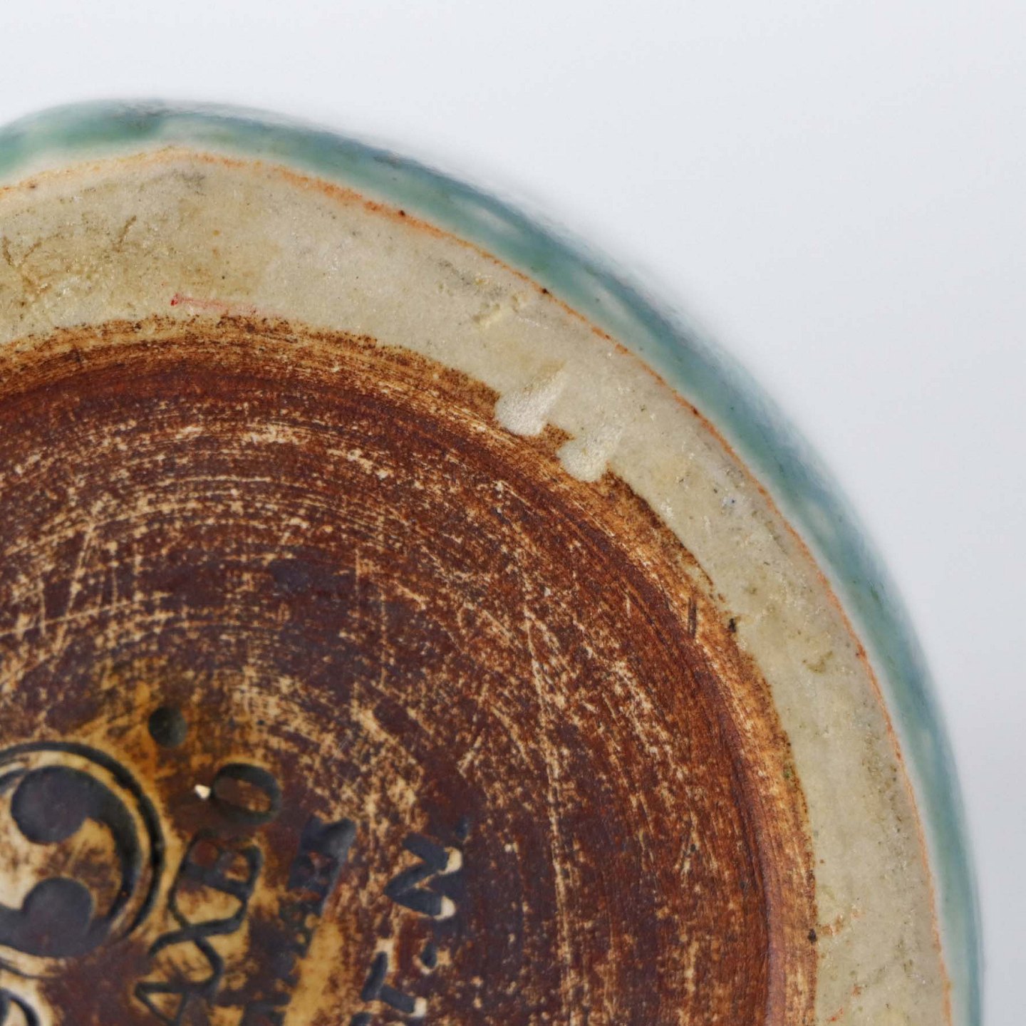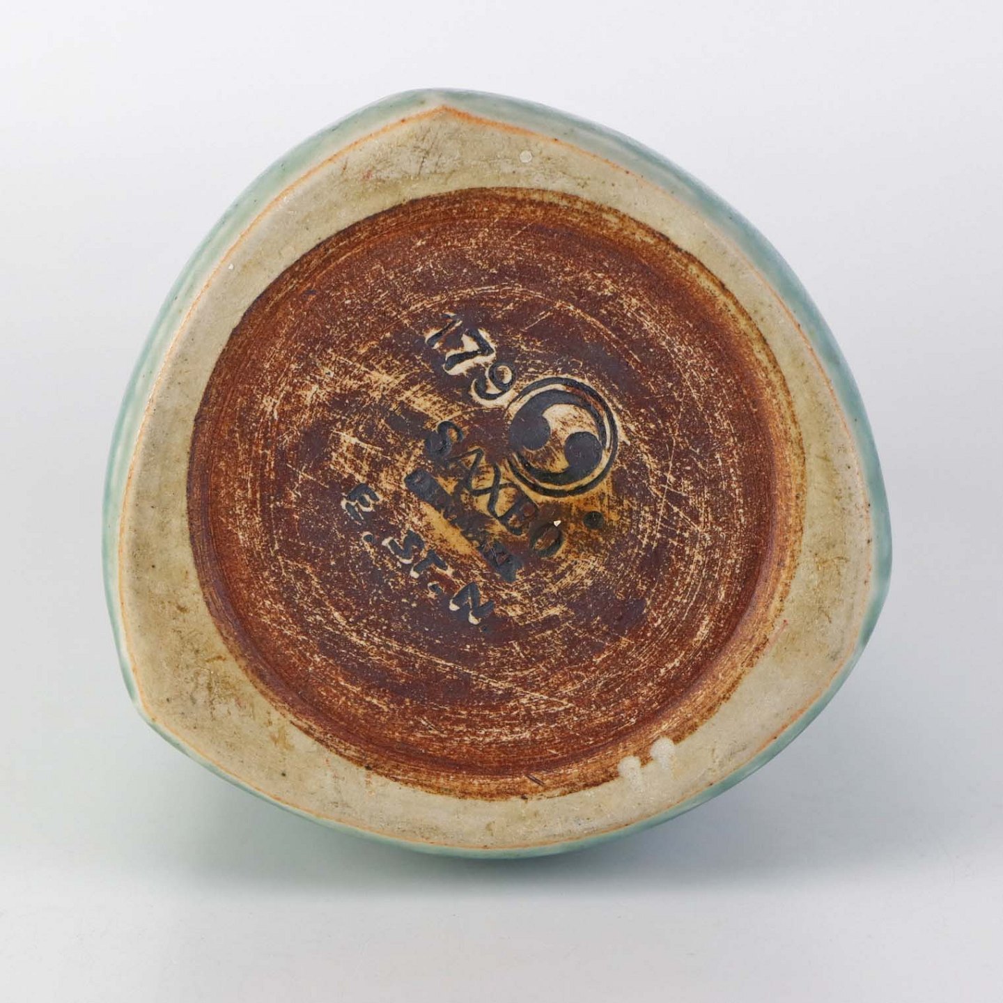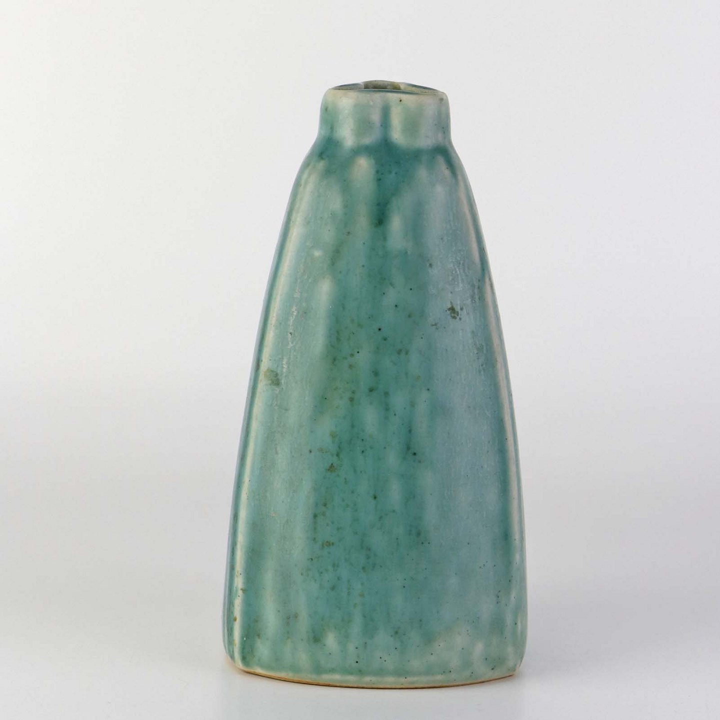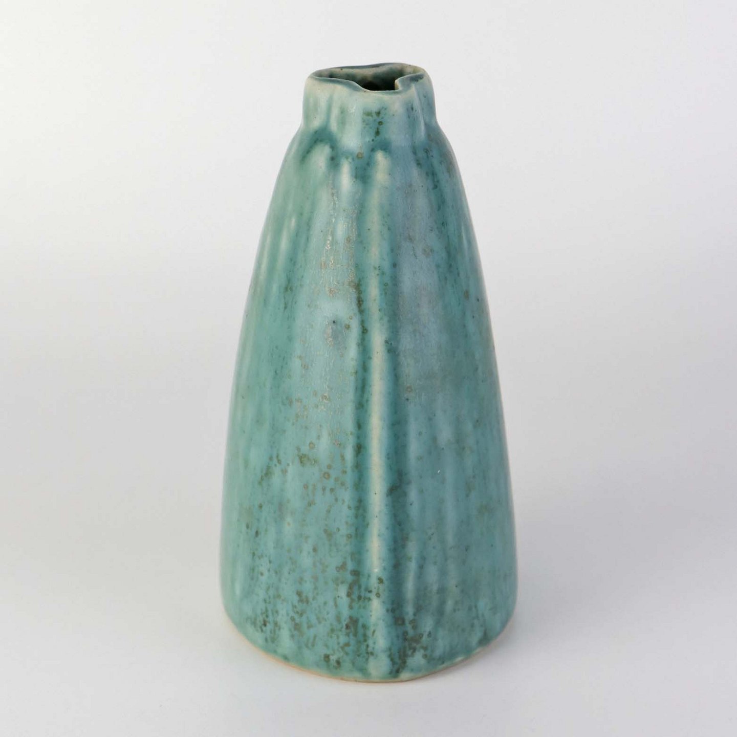 Trekantet vase i stentøj med blågrøn glasur. Nr. 179