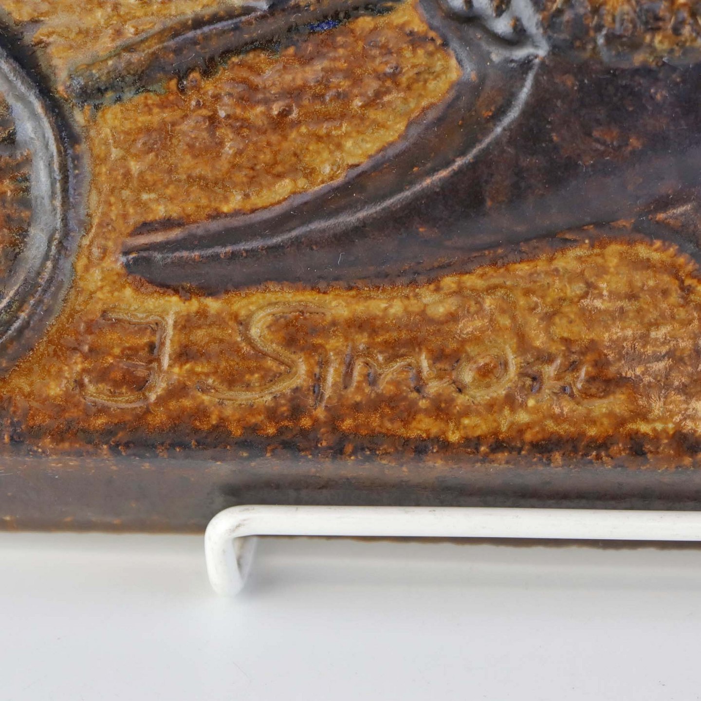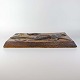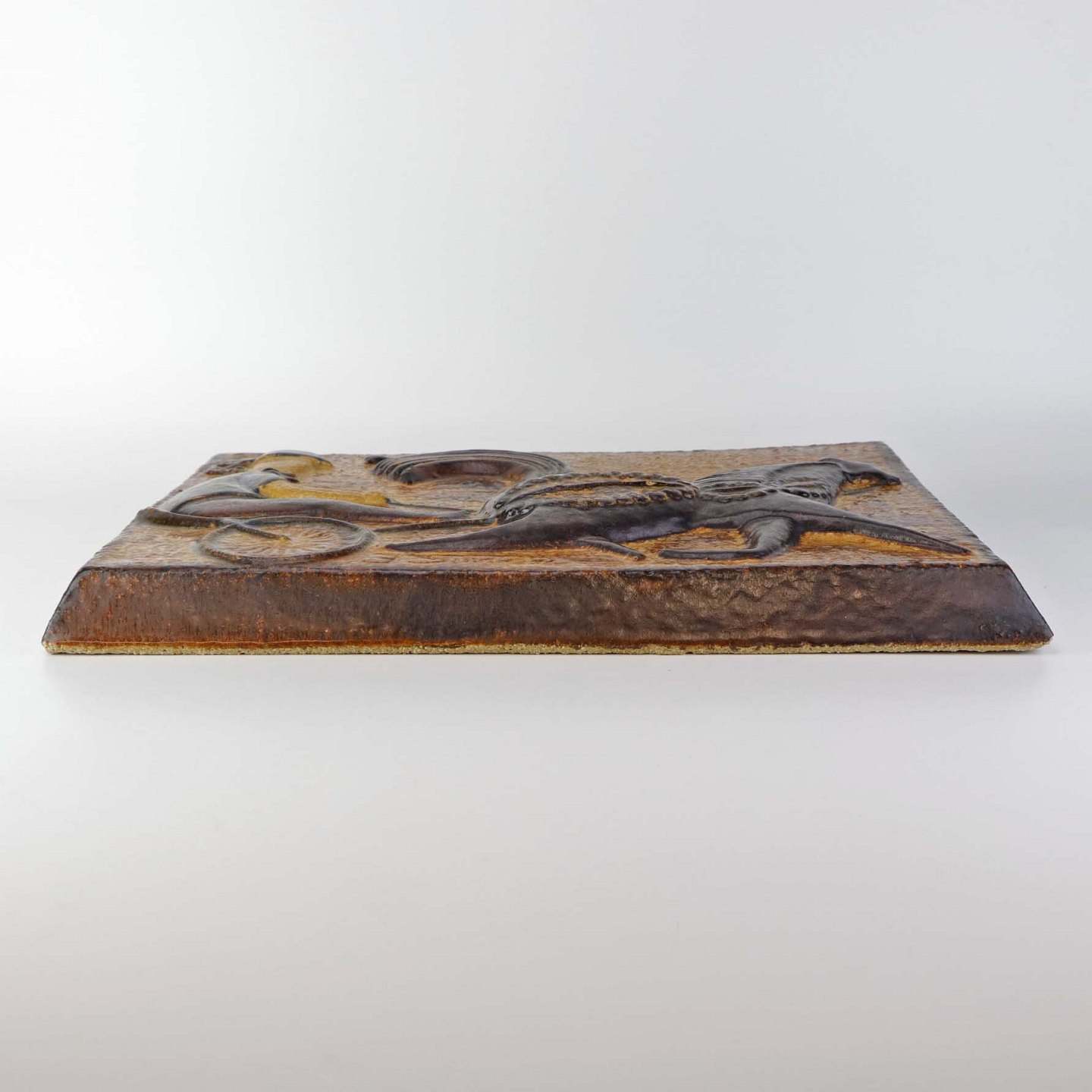 Relief i glaseret stentøj med motiv af travsport med jockey i sulky bag løbende travhest Nr. 3581
