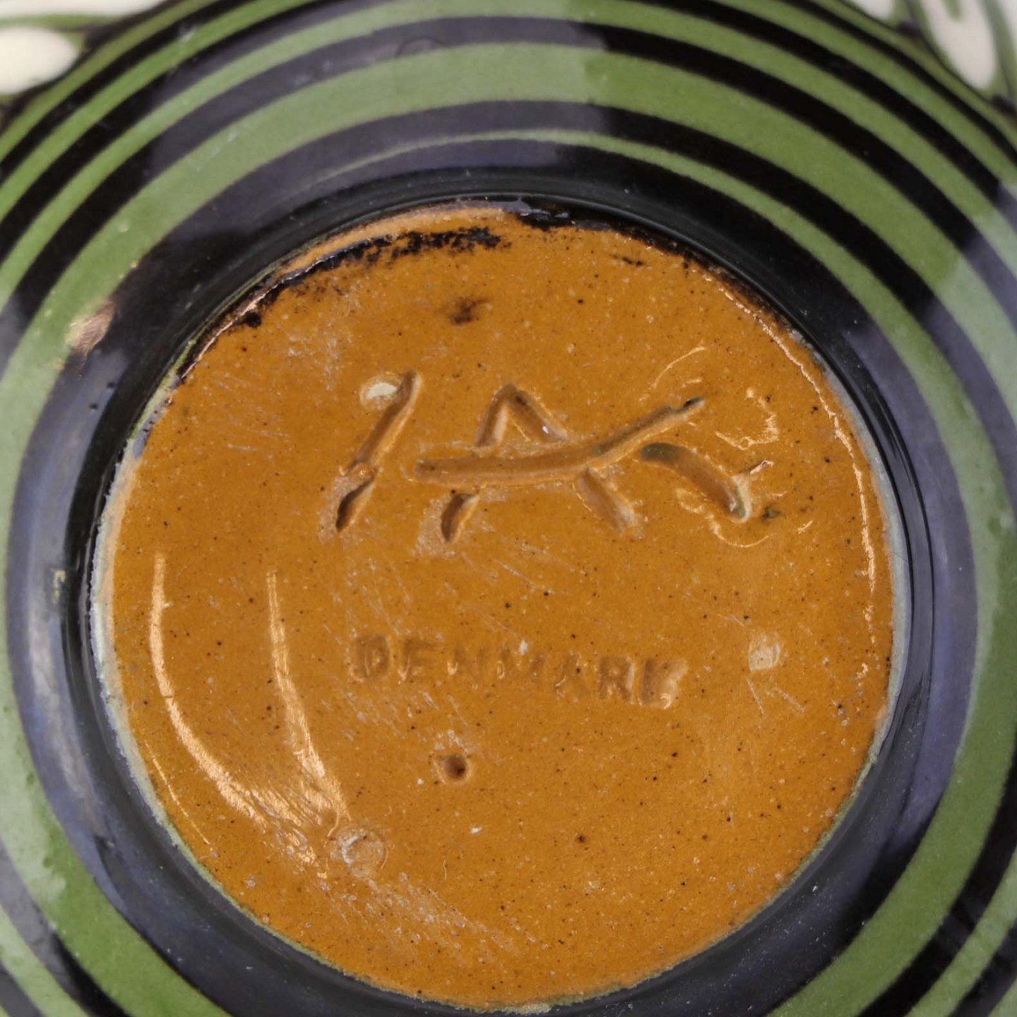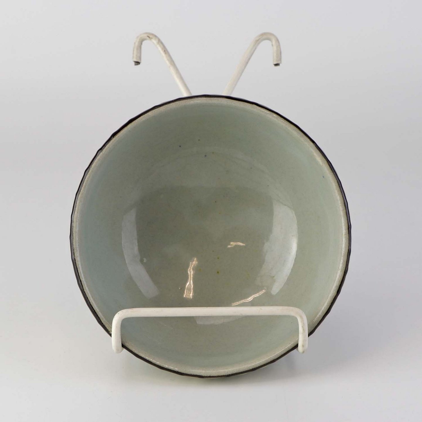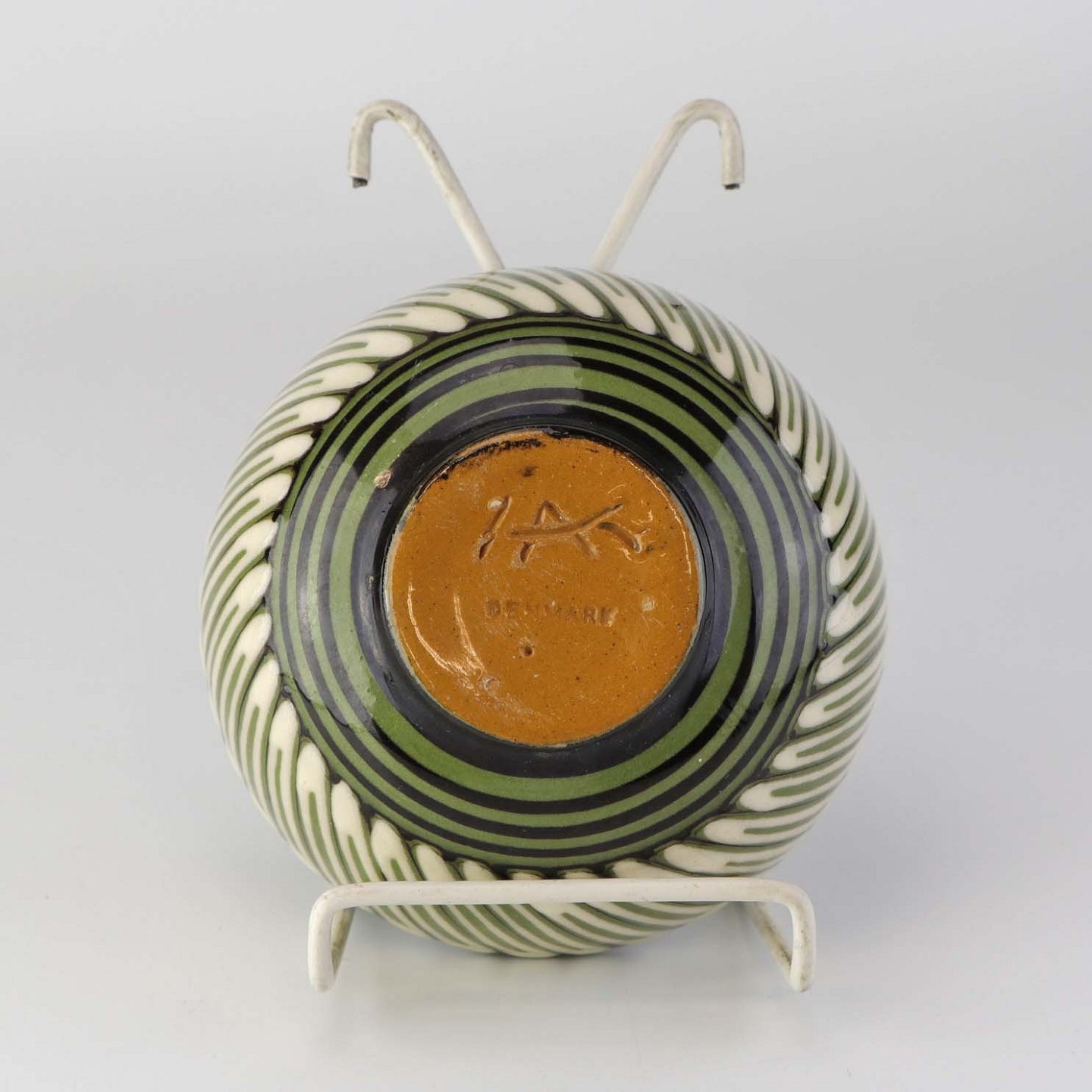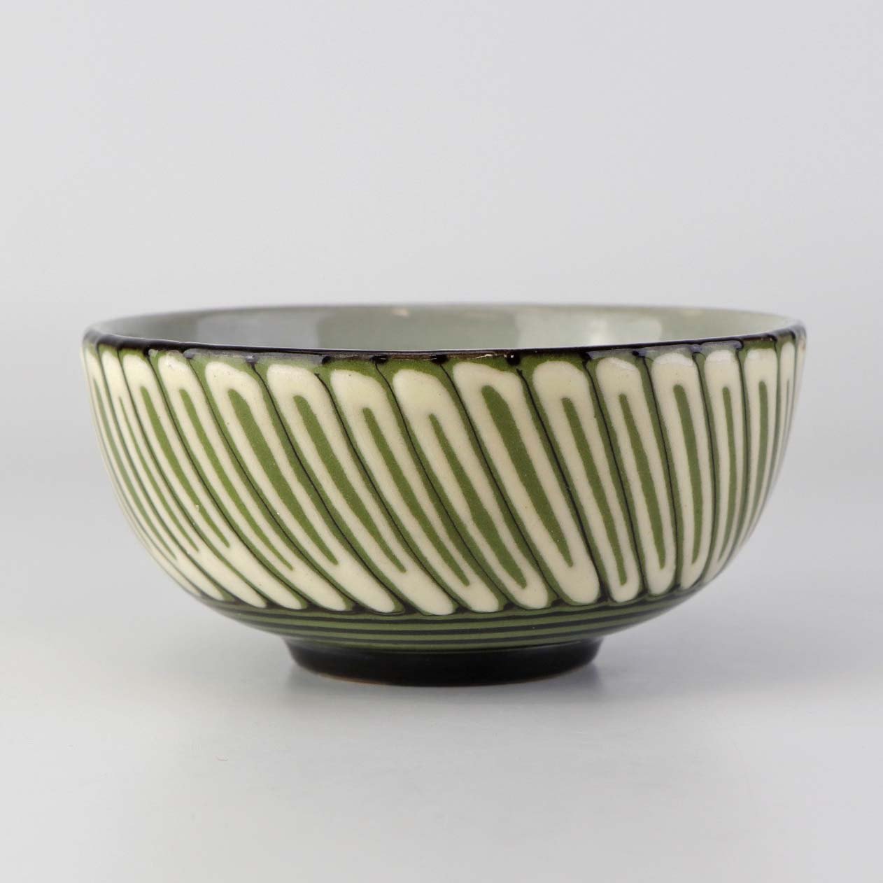 Mindre skål i glaseret keramik med stribet mønster i sort, hvid og grøn med grå inderside.