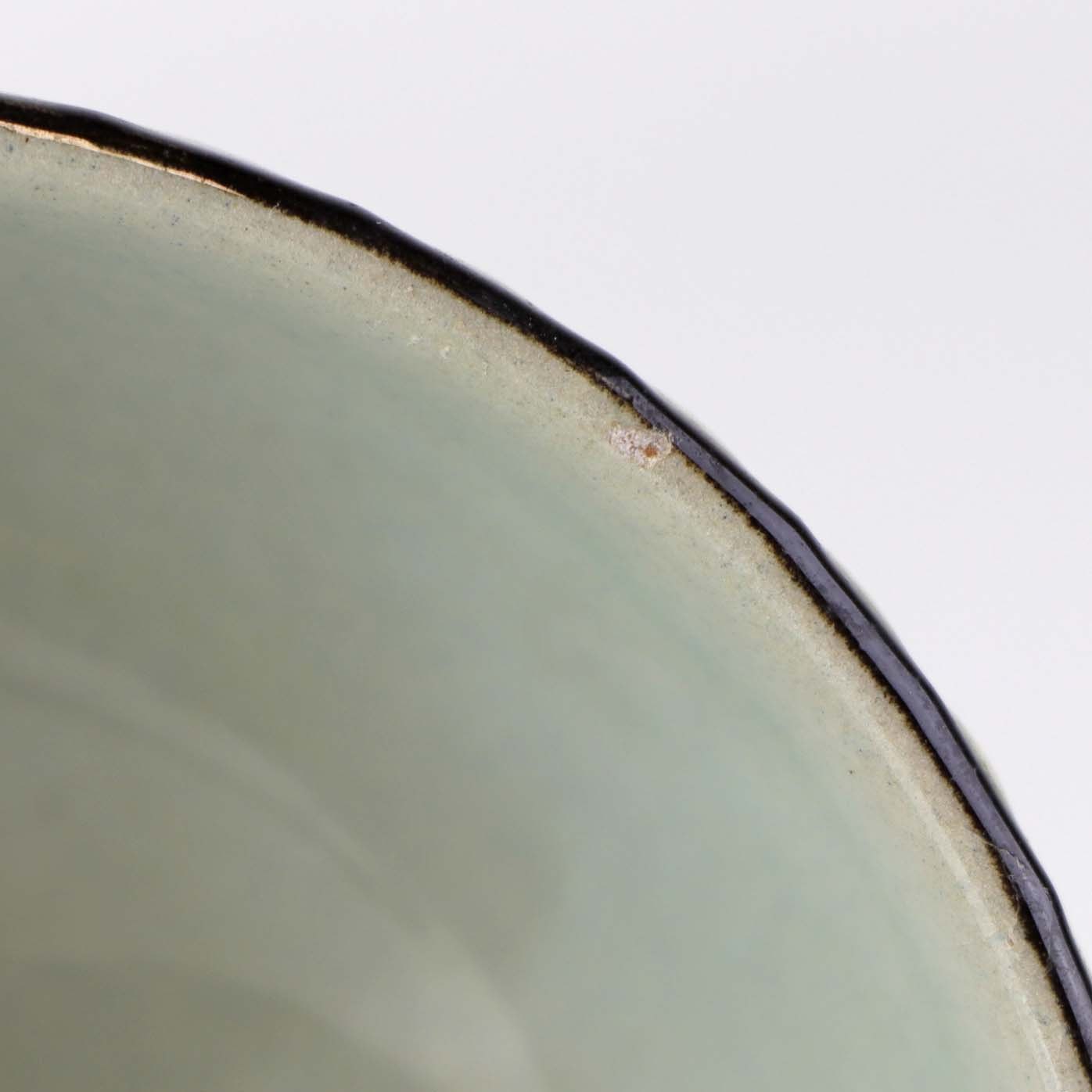 Fremstår med enkelte nøk i glasuren omkring topkanten på begge sider samt på undersiden af skålen.
