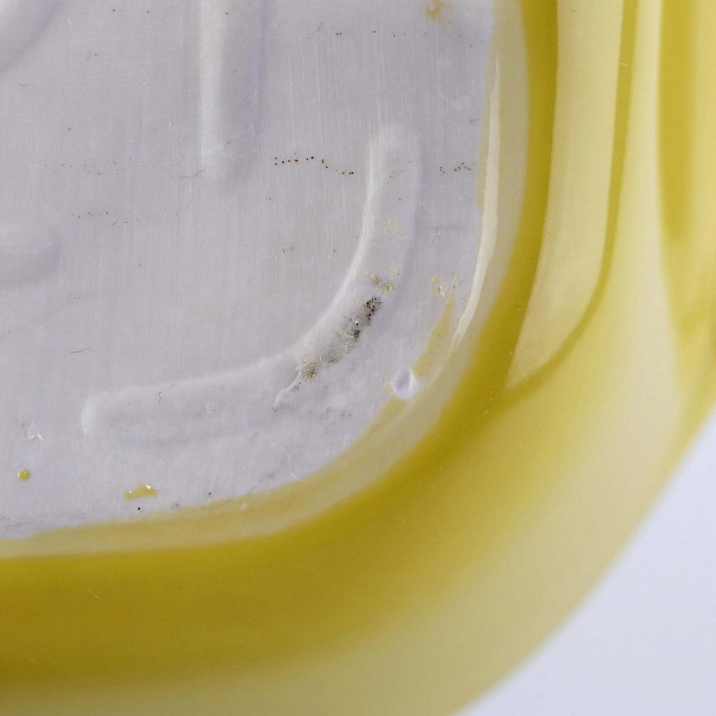 Stellet er fremstillet i ildfast glat porcelæn dekoreret med gul glaseret yderside og hvid glaseret inderside.