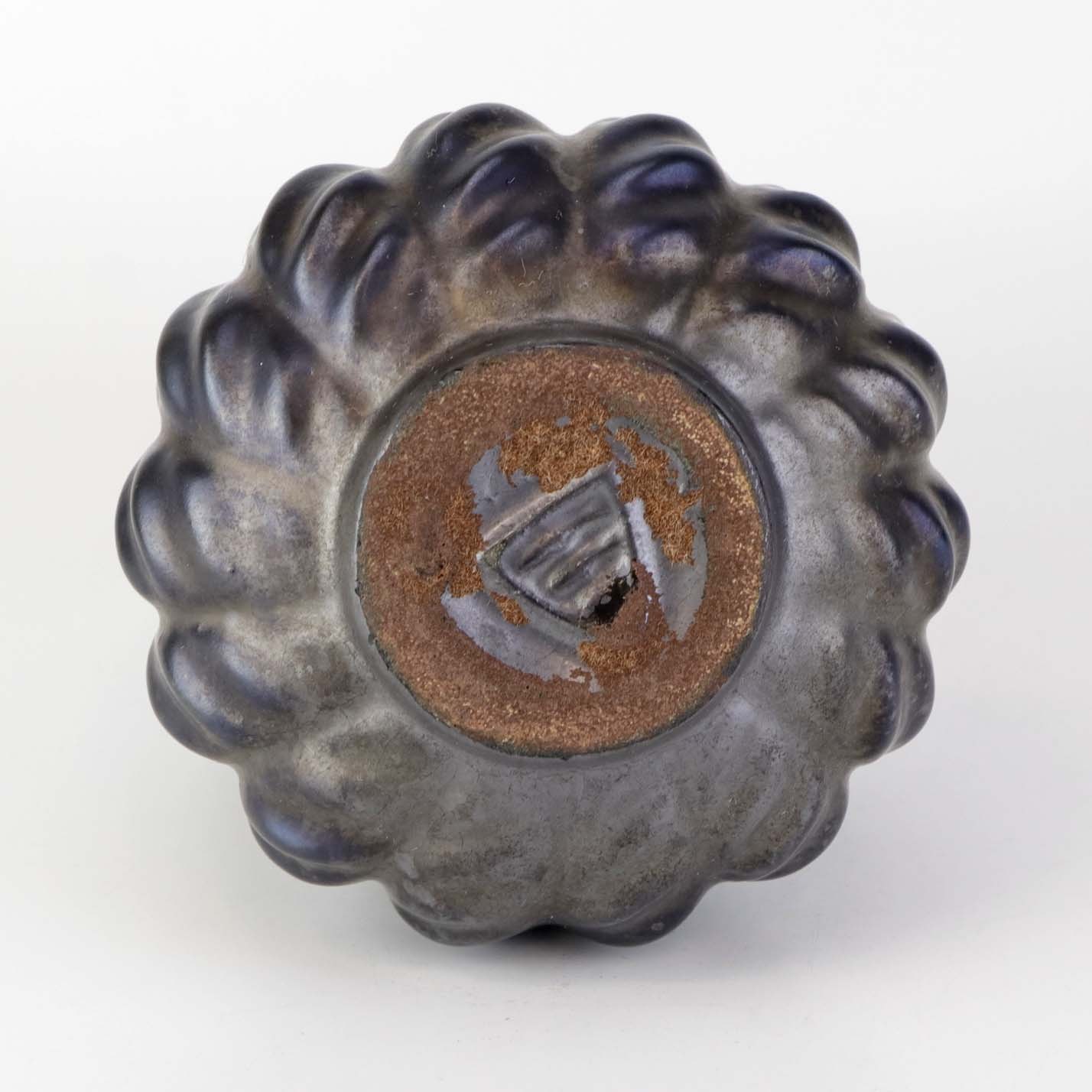 Kande i keramik med indvendig turkis glasering og udvendig mørk og delvist metallisk glasering.