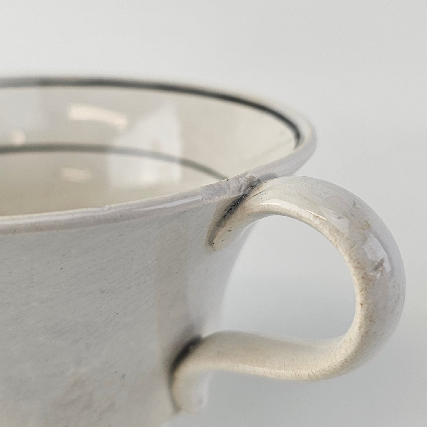 Kop og underkop af fajance med motiv af kong Frederik d. 6. af Danmark og tysk tekst. Formentlig tysk produceret til danske marked før der var en produktion i Danmark