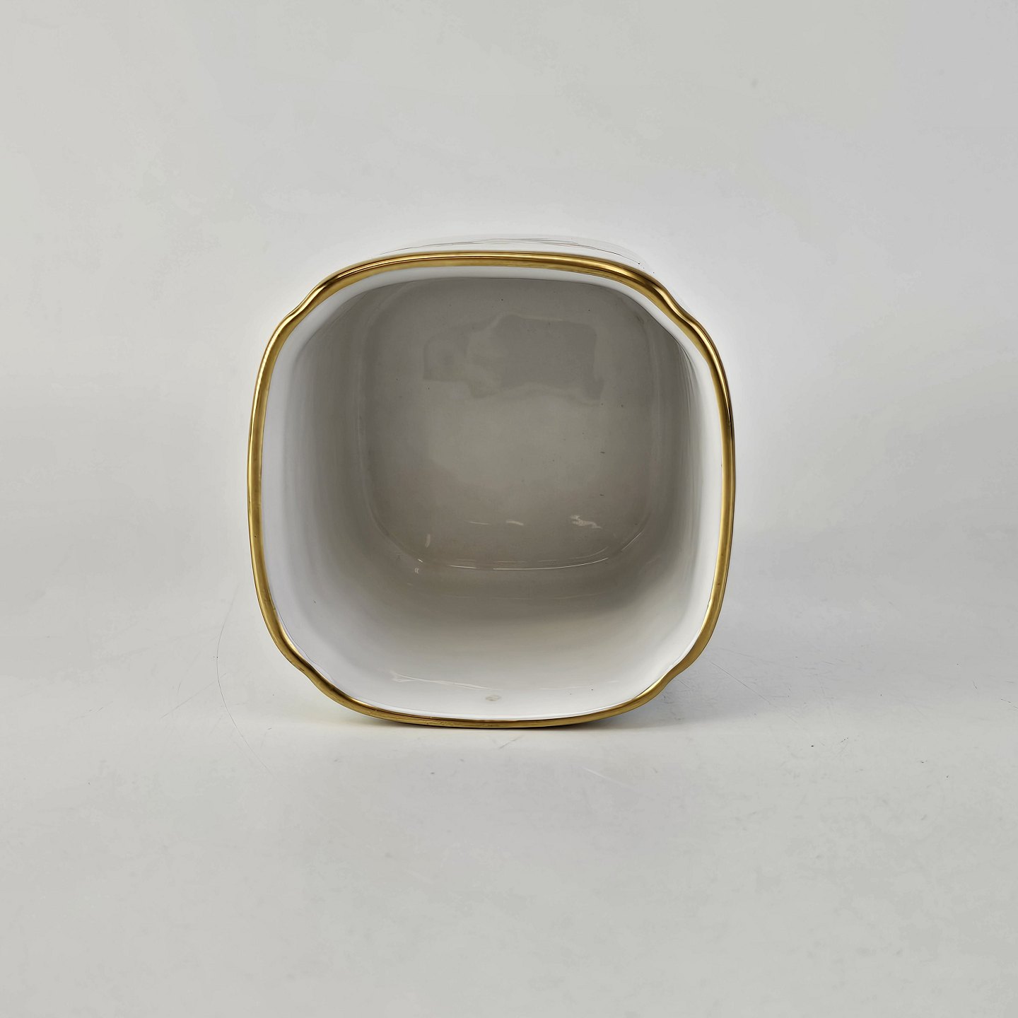 Stel i glat hvidt porcelæn dekoreret med brune roser og guldbort