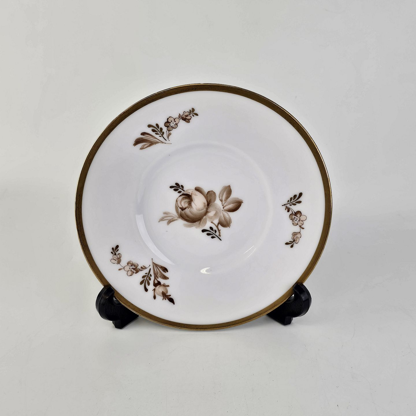 Stel i glat hvidt porcelæn dekoreret med brune roser og guldbort