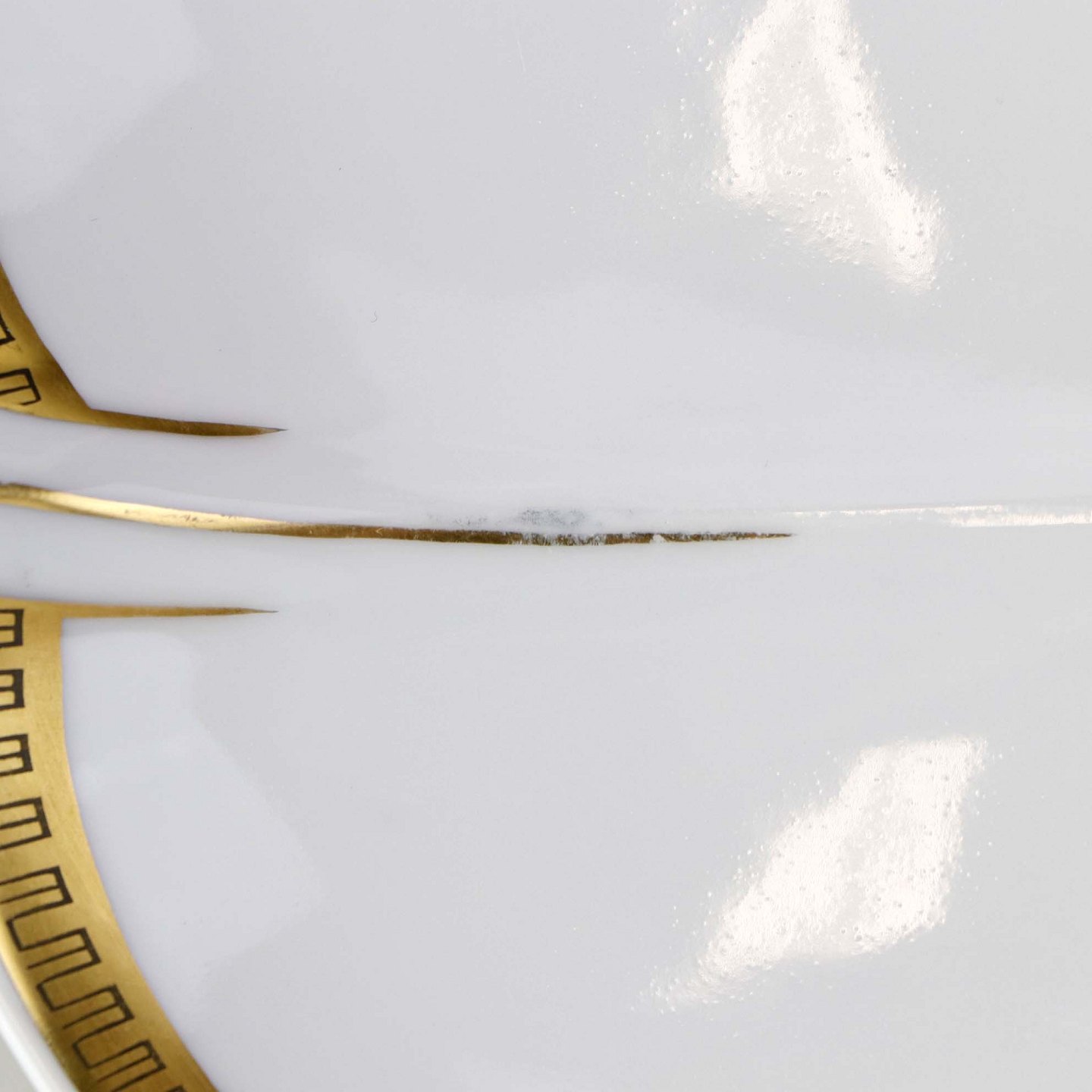 Fremstår med lettere brugsspor på guldbort, mindre slidtage på indersiden samt mindre mørkning under glasuren på bagsiden.