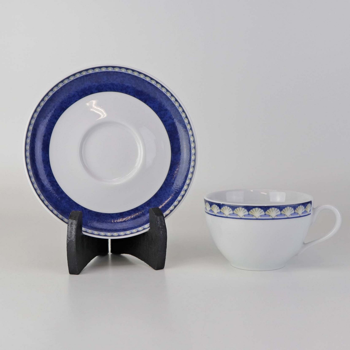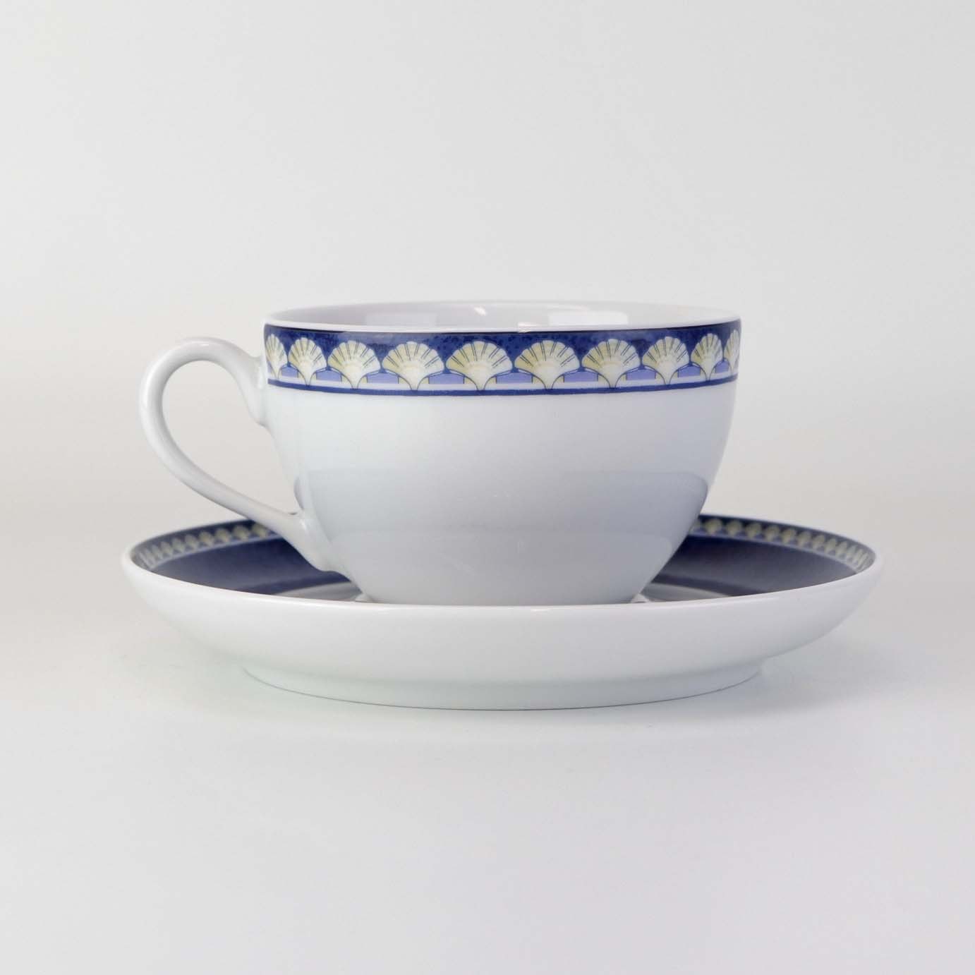 Service i glat hvid porcelæn med blåt bånd og dekoration af gule vifteformede strandskaller. Stellet kan gå i opvaskemaskinen.