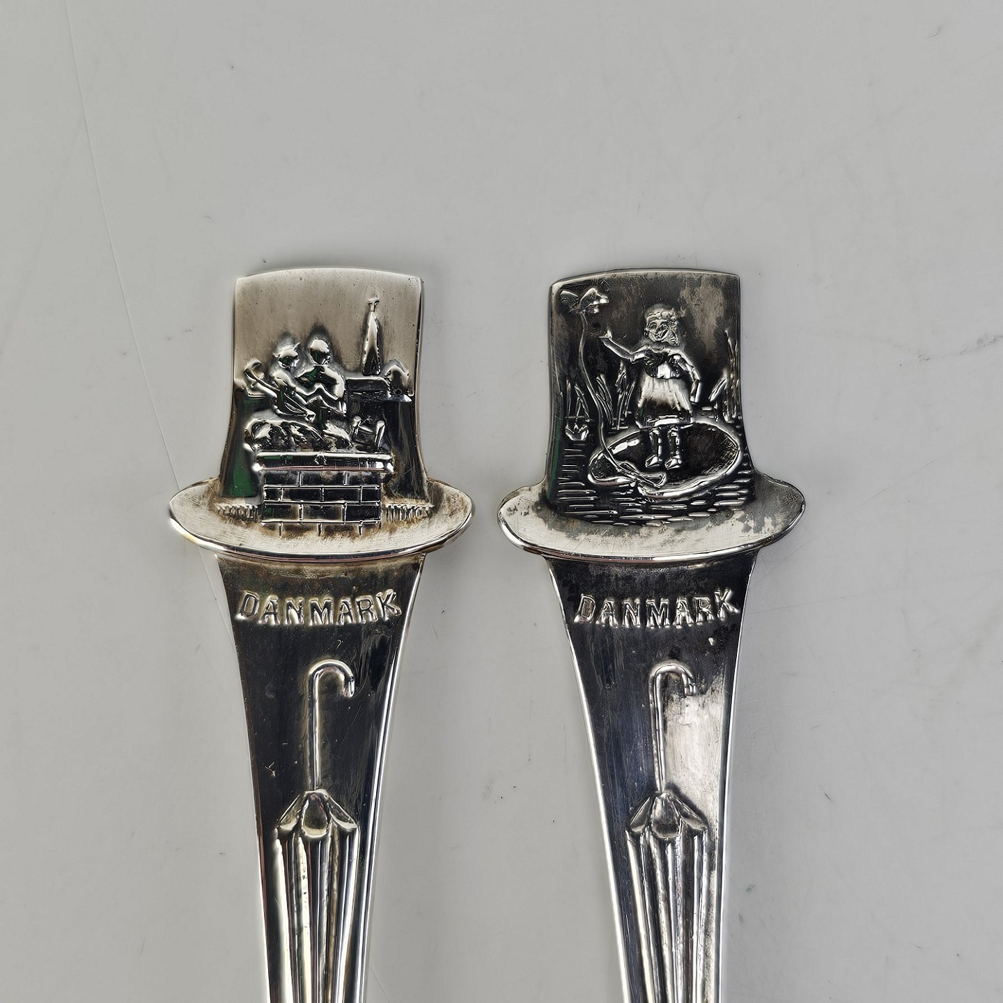 En lille bog med seks pletsølvskeer, alle med forskellige motiver fra H. C. Andersens eventyr
