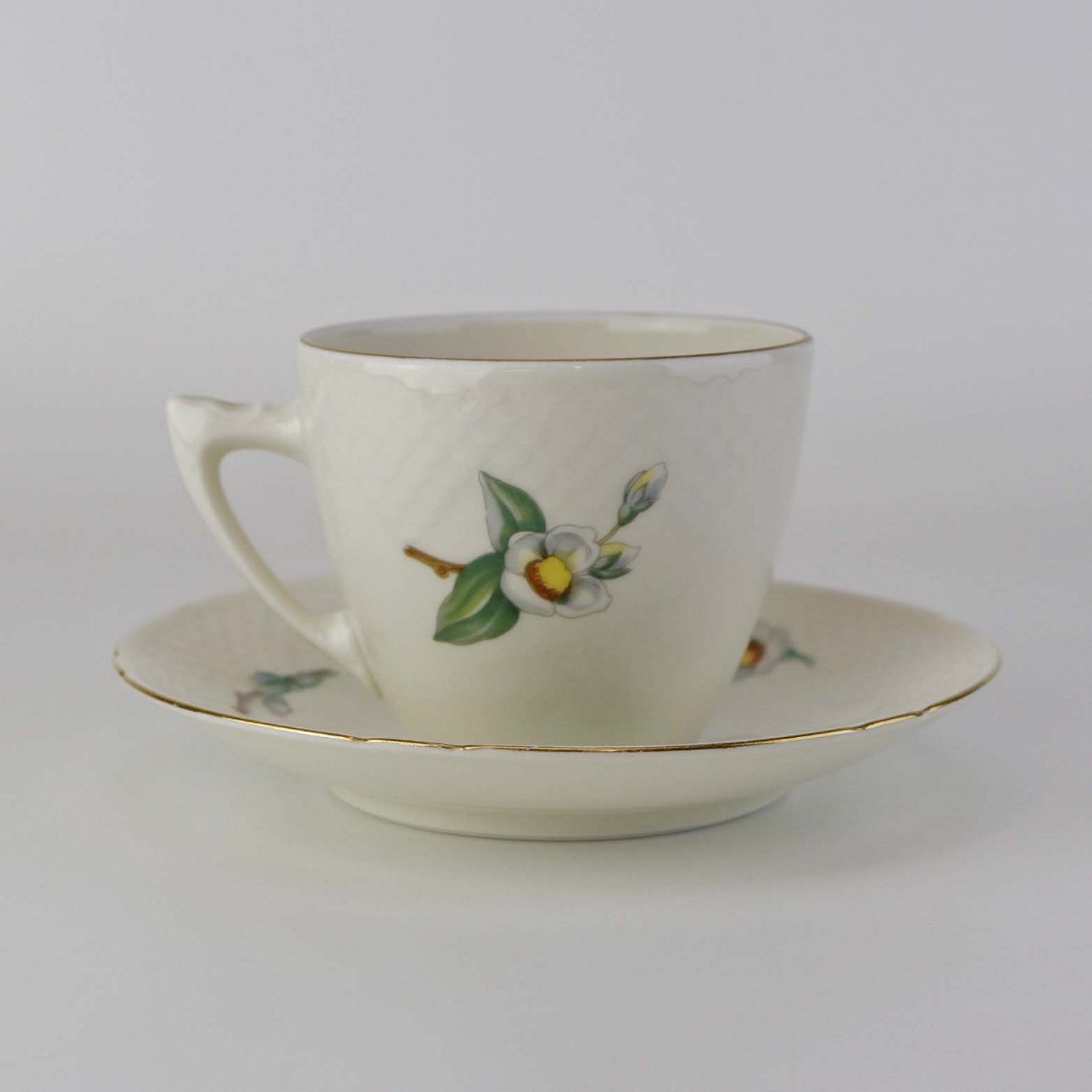 Heimdal er cremefarvet porcelæn i skælform, som dekoreret med jasminblomster, grene og en guldkant.
