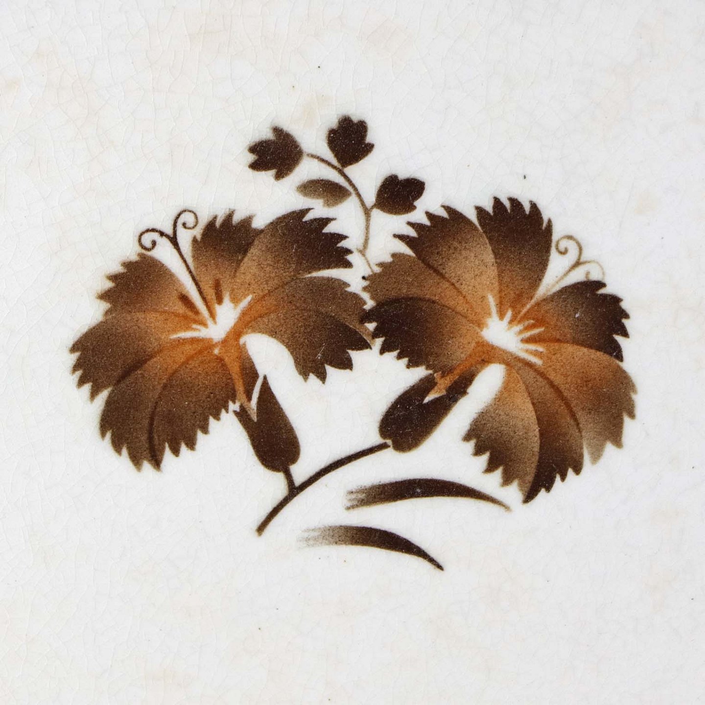 Stel i glat hvid fajance i stelform C med dekoration af brune nelliker og ranker. Stellet blev produceret i perioden år 1930-1941