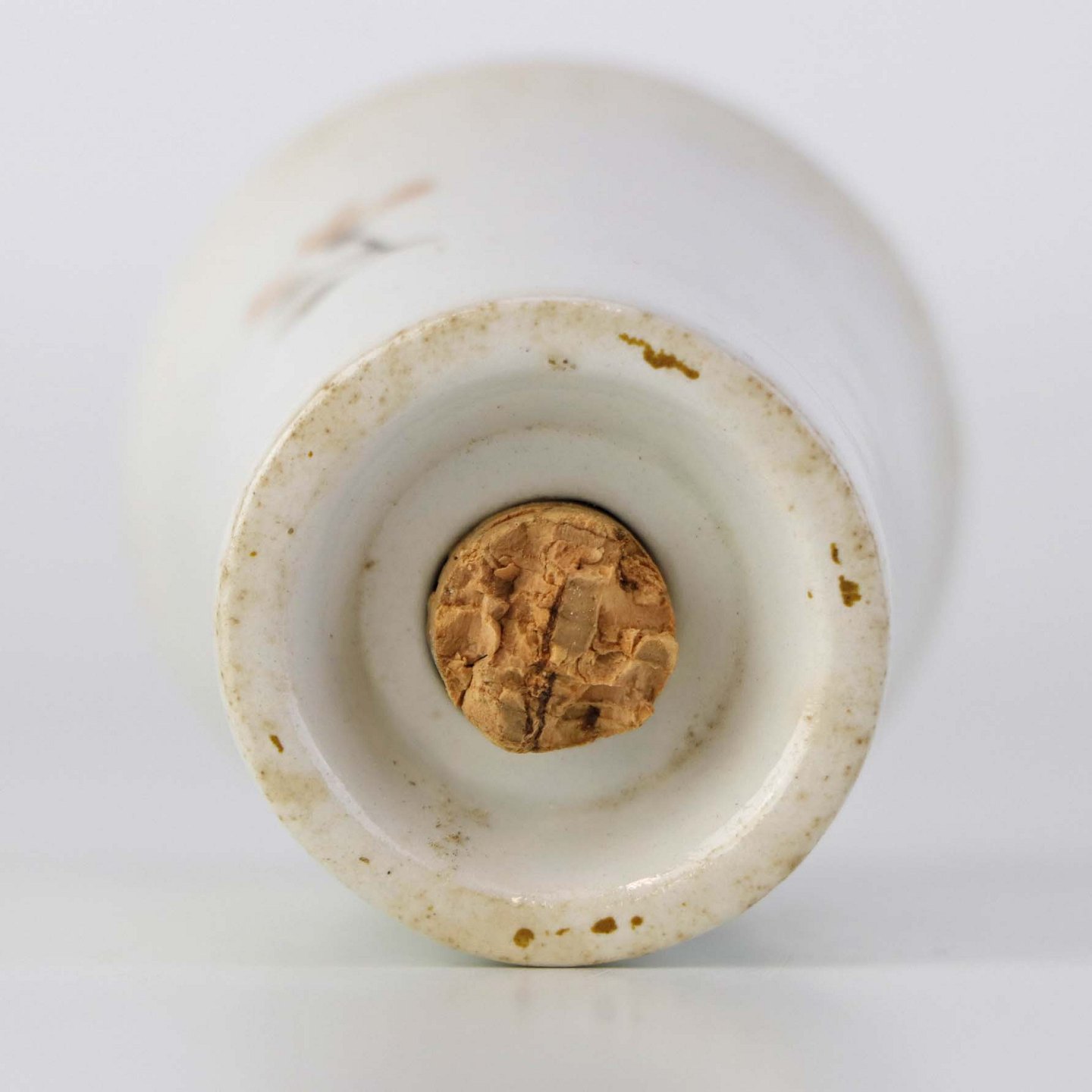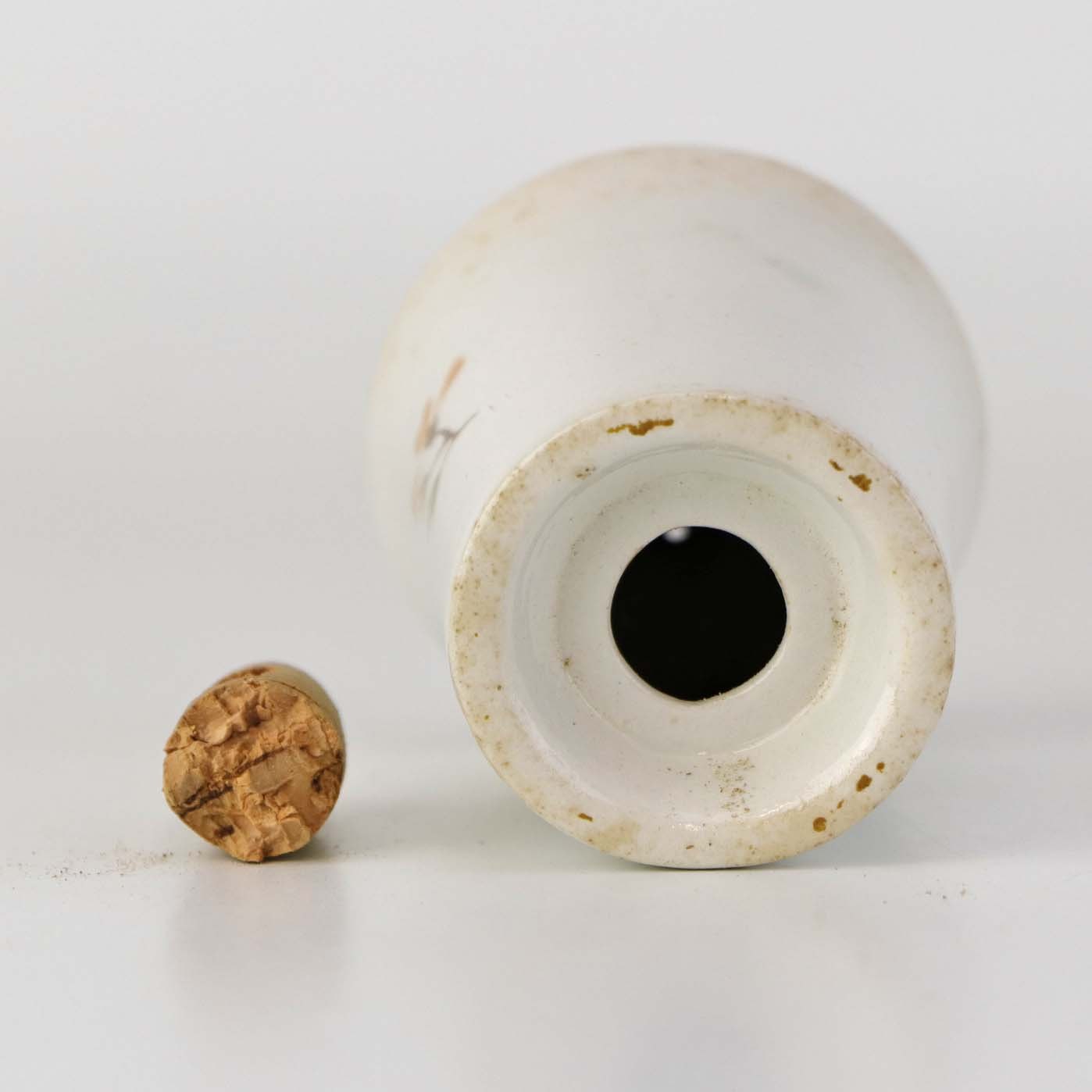 Fremstår med mørkninger under glasuren og brugsspor på korkproppen