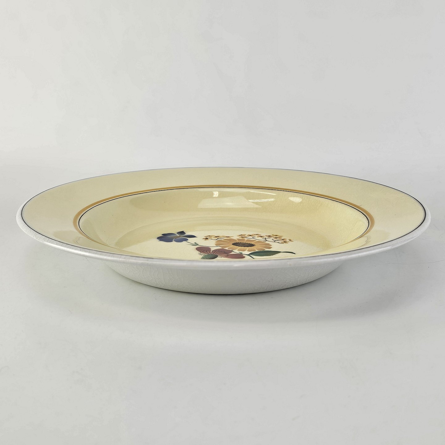 Stel i glat gul fajance med dekoration af farverige og forskelligartede blomster