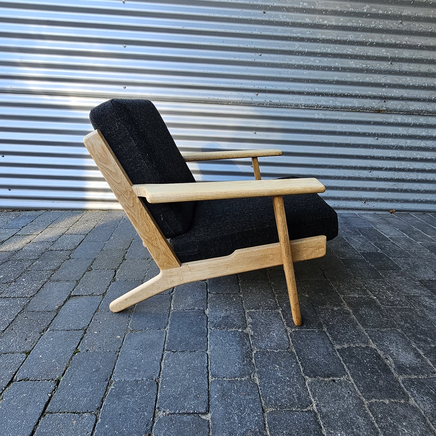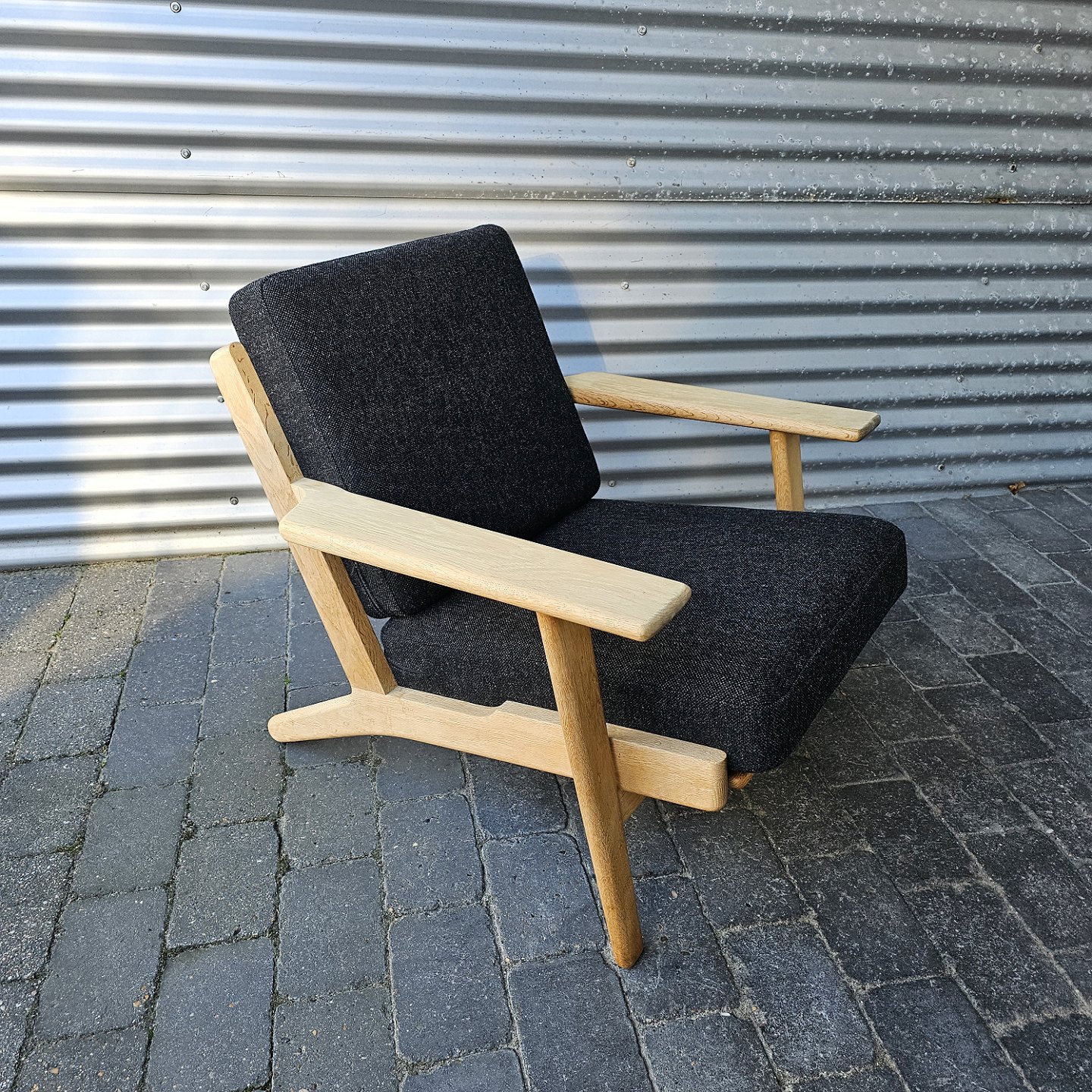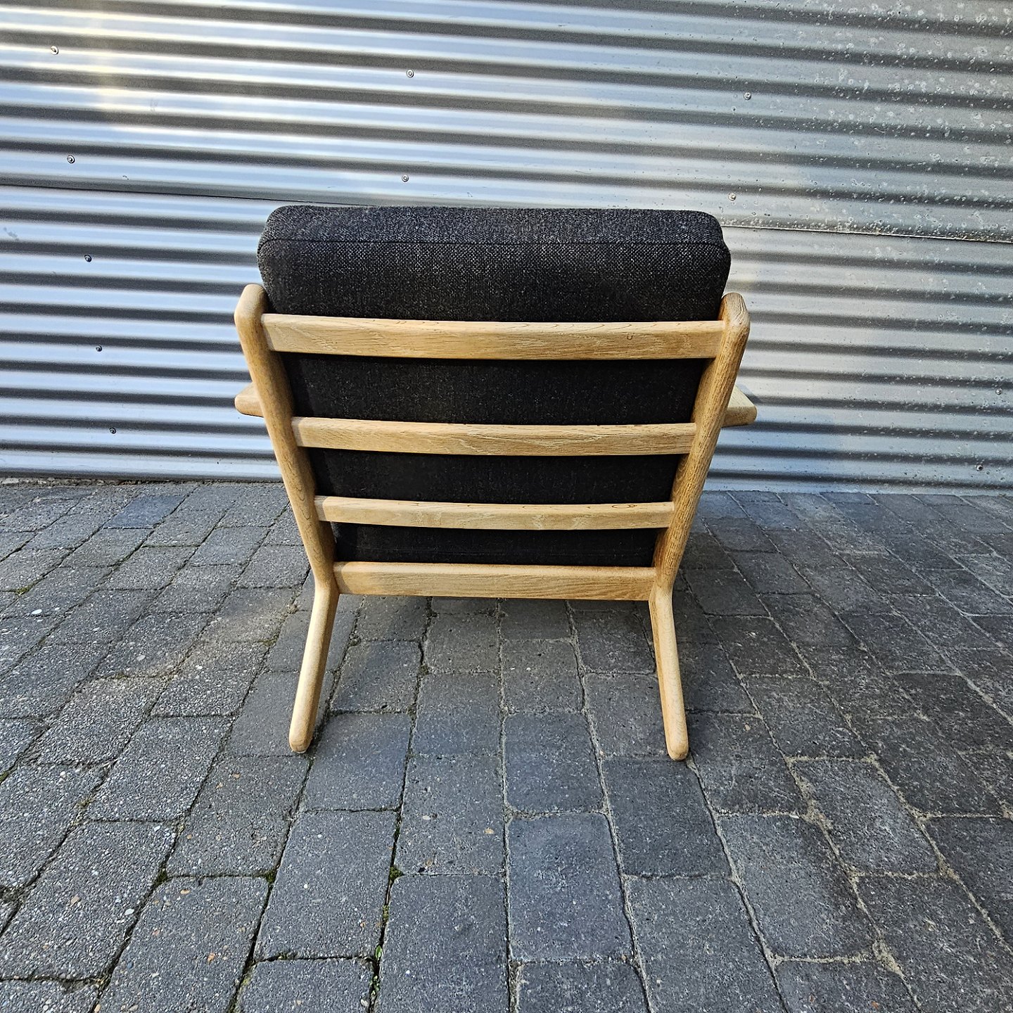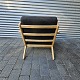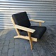 Lænestol med stel i lakeret egetræ og hynder med springfjeder. Hynderne er ny ombetrukket med mørk gråmeleret 180 Hallingdal uld. Model GE 290