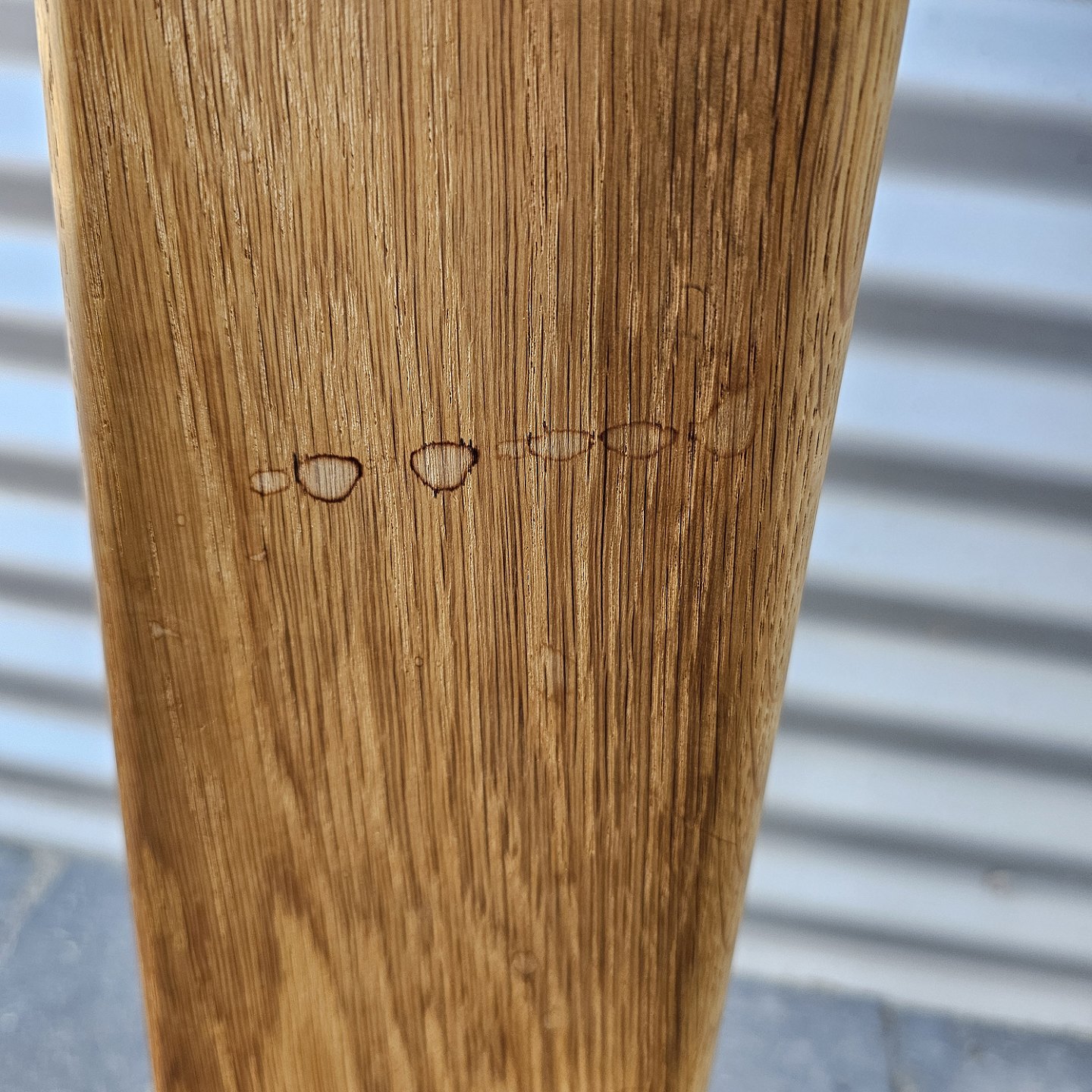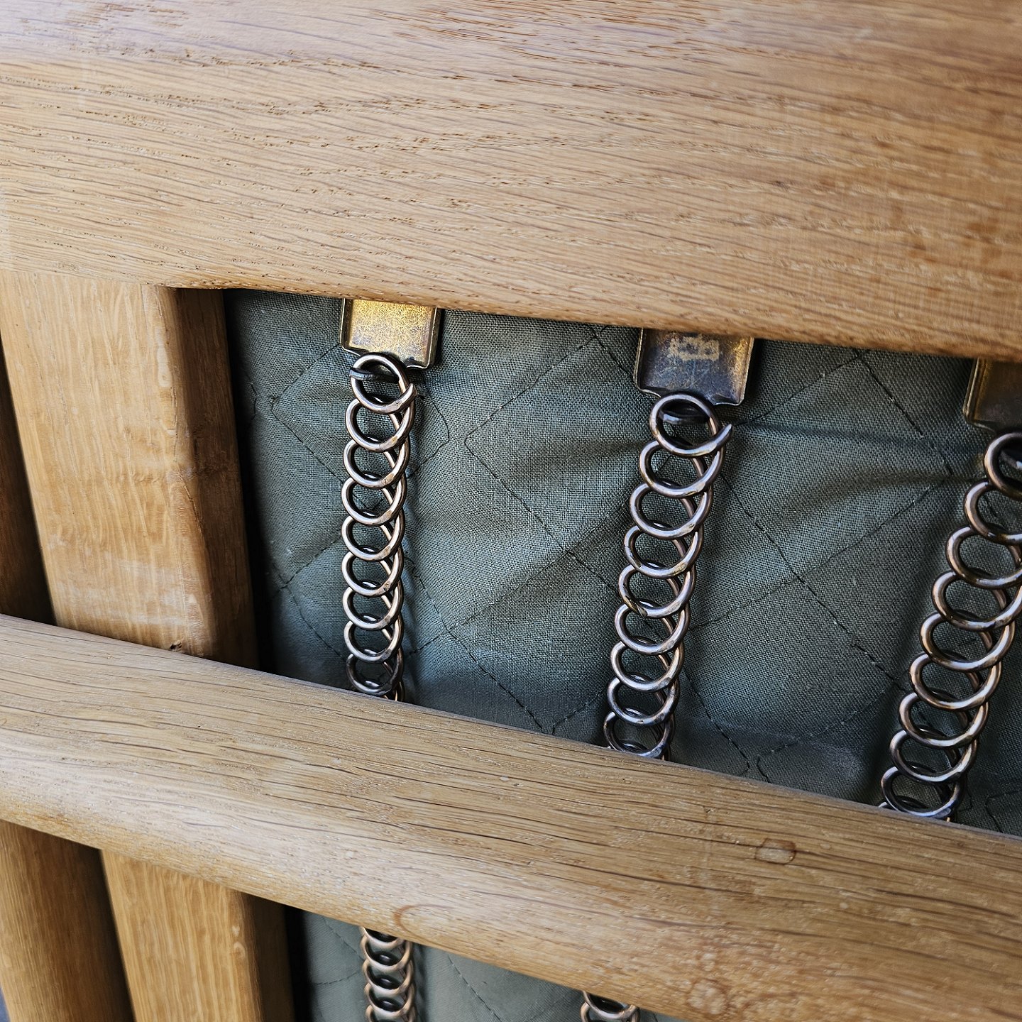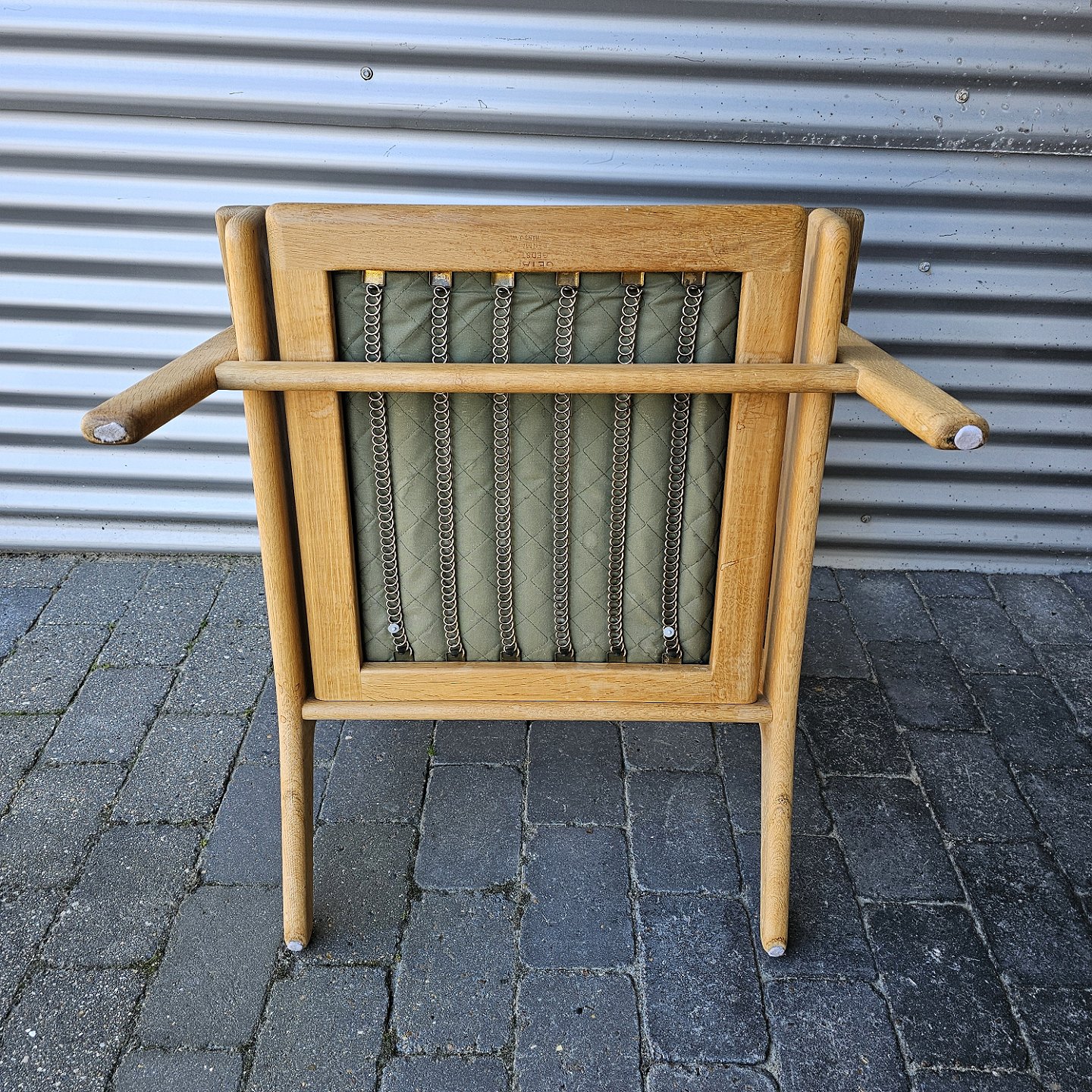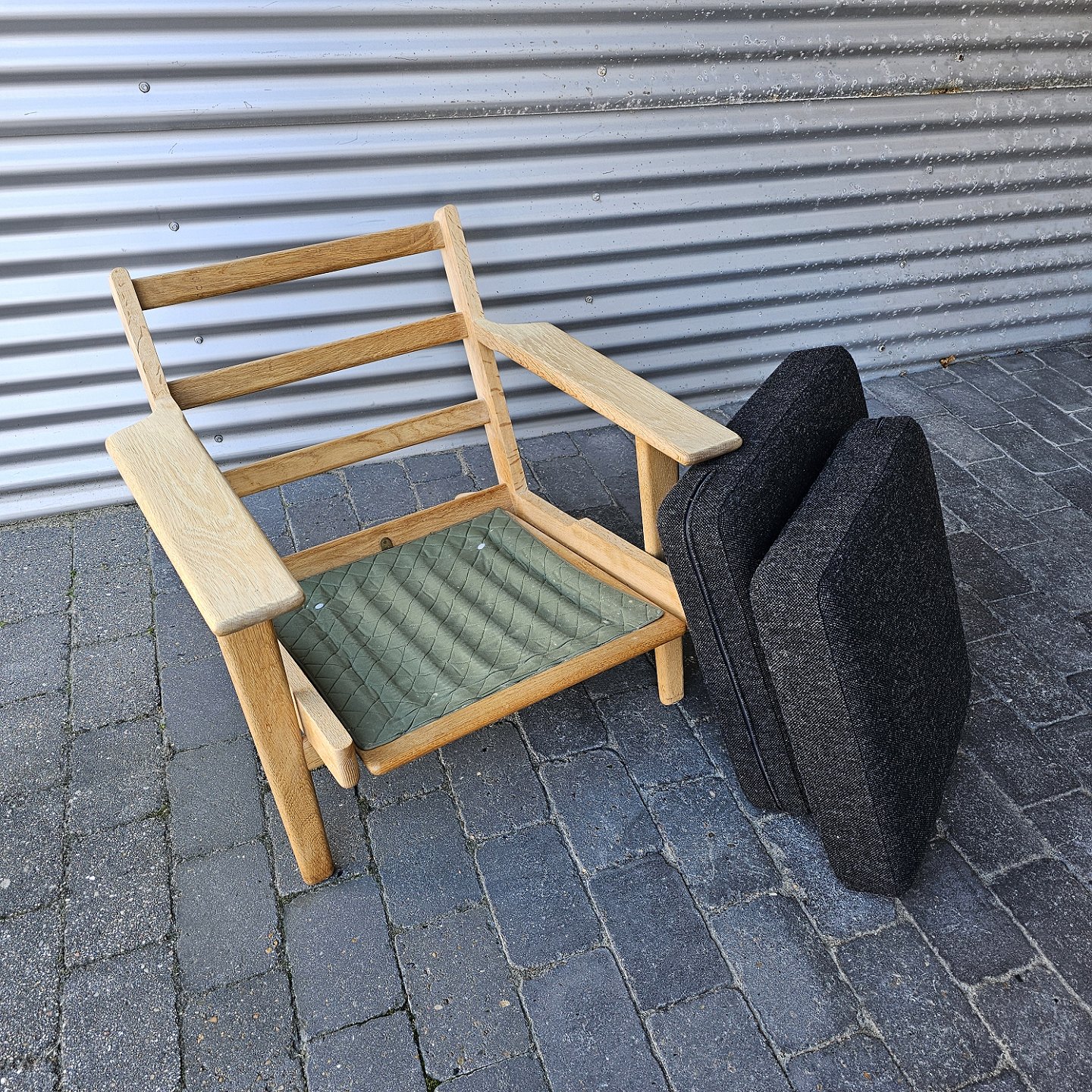 Lænestol med stel i lakeret egetræ og hynder med springfjeder. Hynderne er ny ombetrukket med mørk gråmeleret 180 Hallingdal uld. Model GE 290