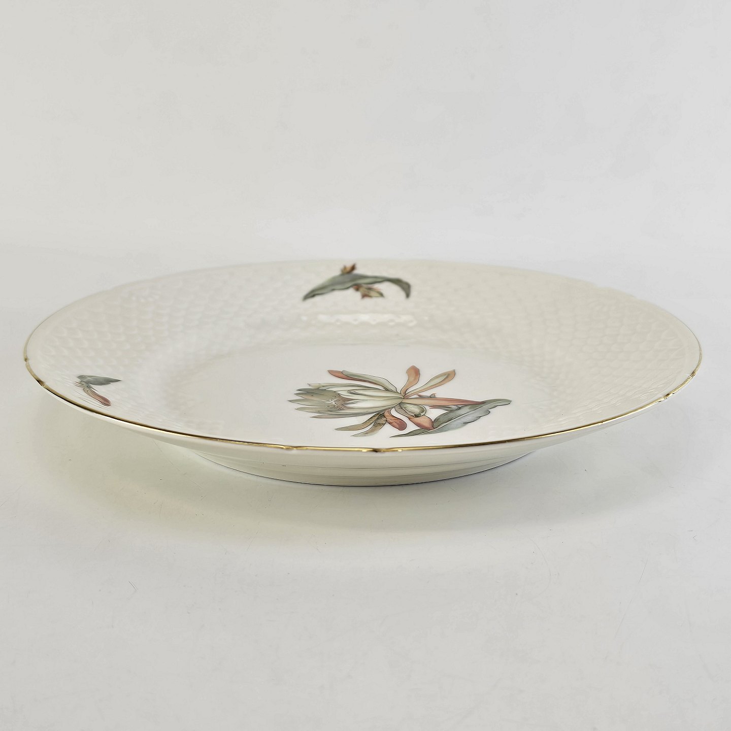 Kaktus er cremefarvet porcelæn i skælform, dekoreret med kaktusblomster og guldkant