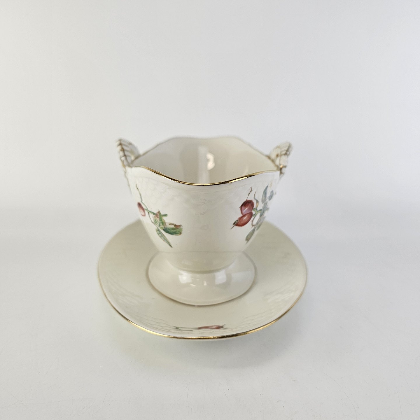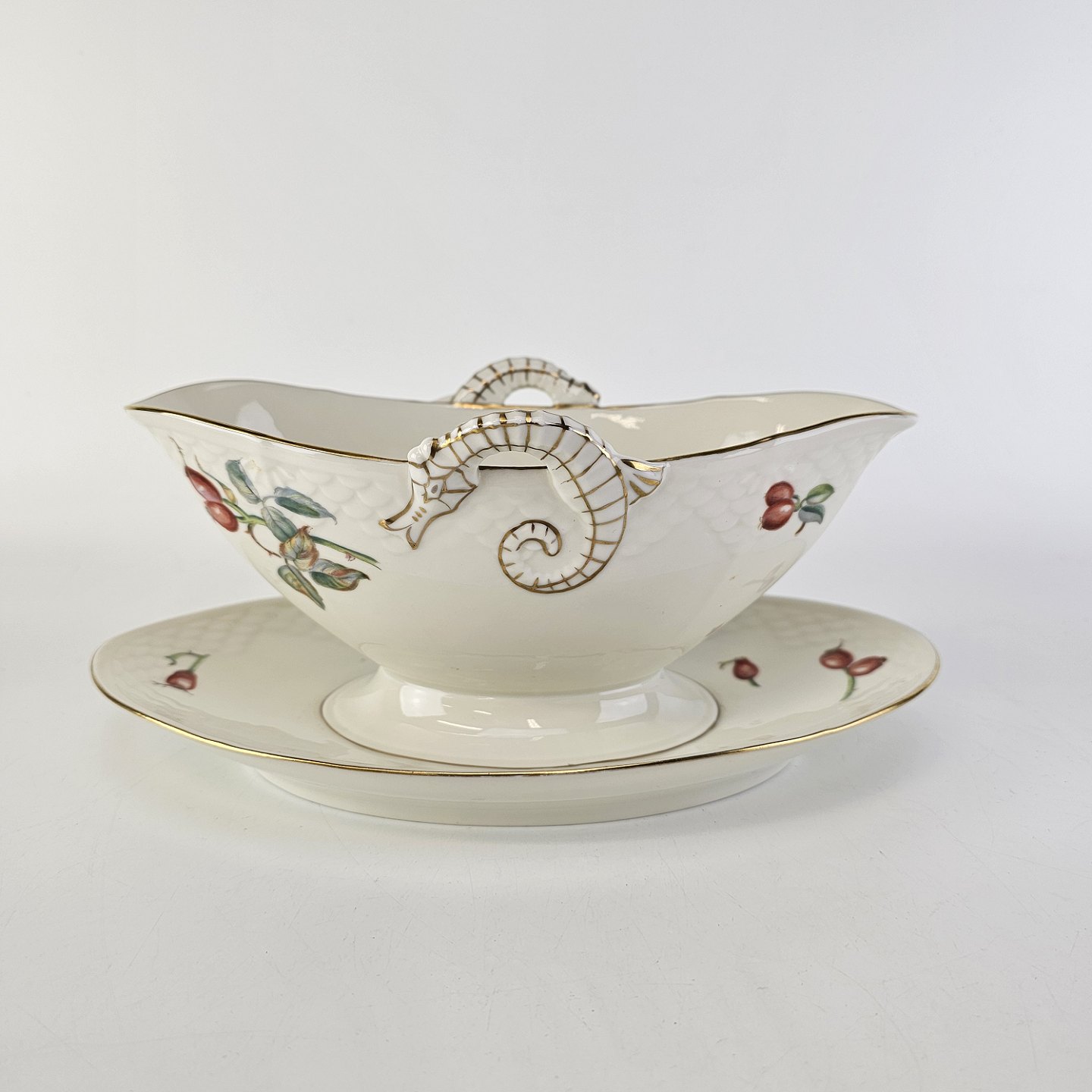 Balder er cremefarvet porcelæn i skælform, dekoreret med hyben og guldkant.