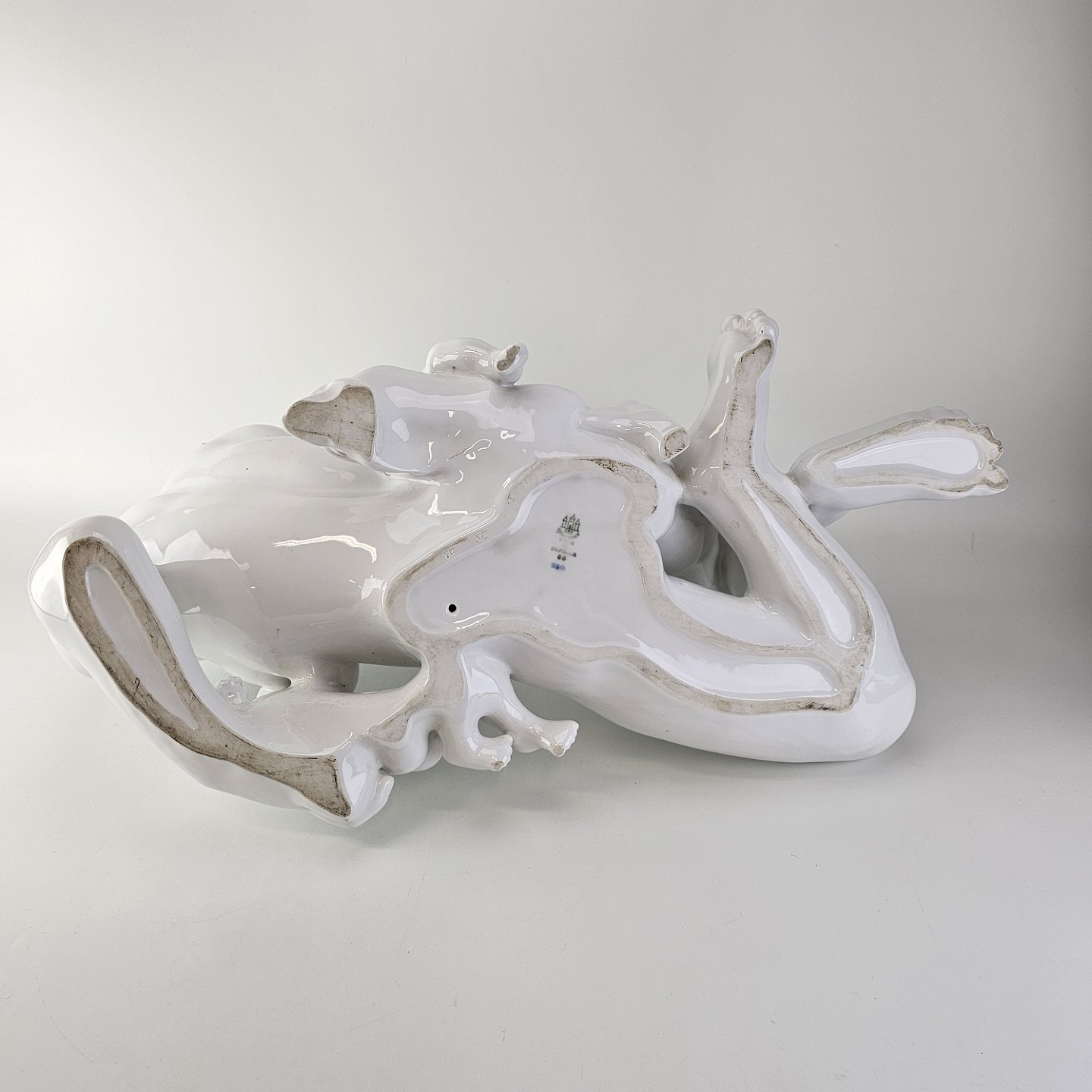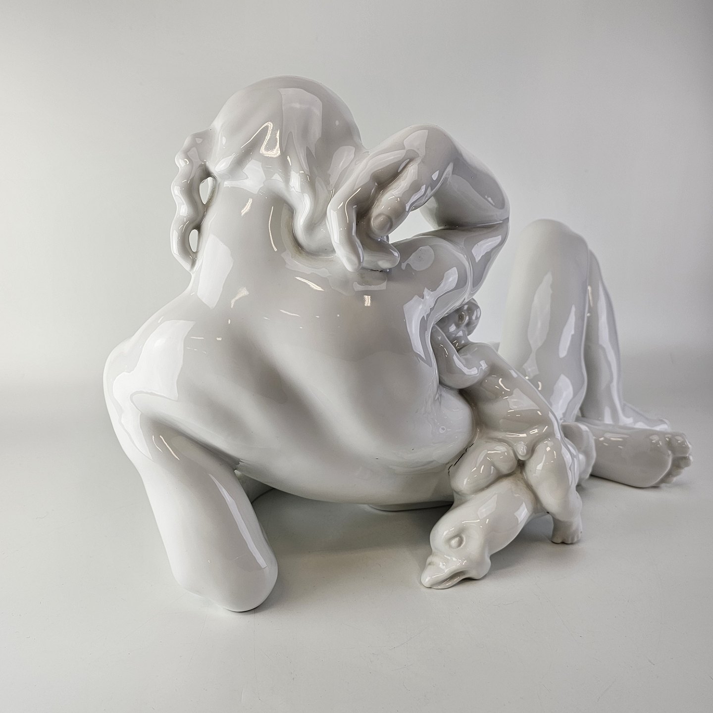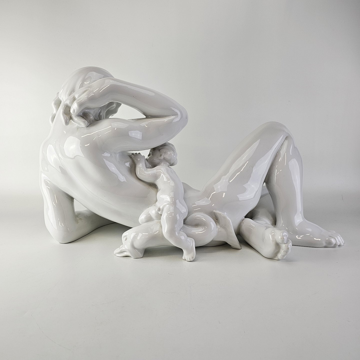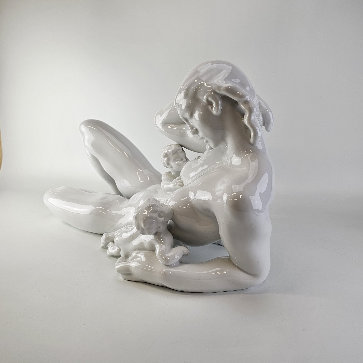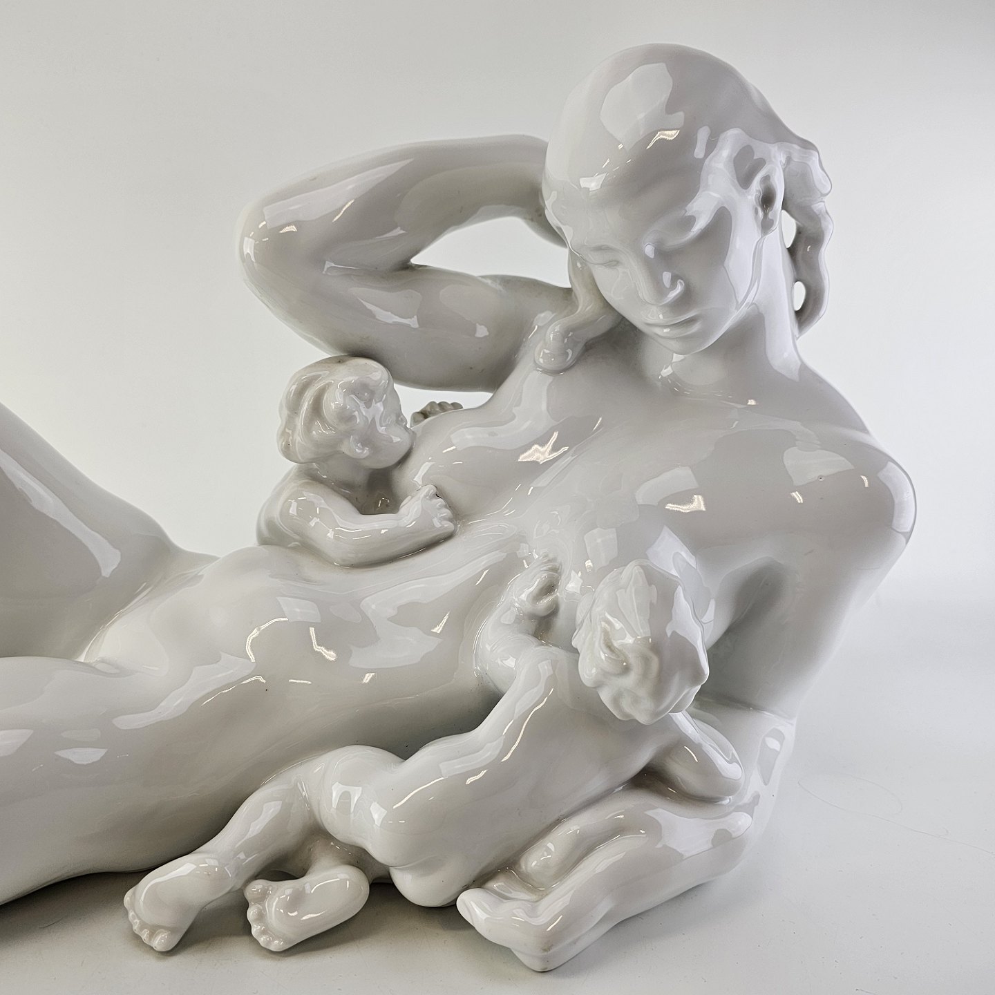 Figur i hvidt porcelæn med motiv af en kvinde som ligger med to små børn, kendt under navnene Vandmoderen og Caritas