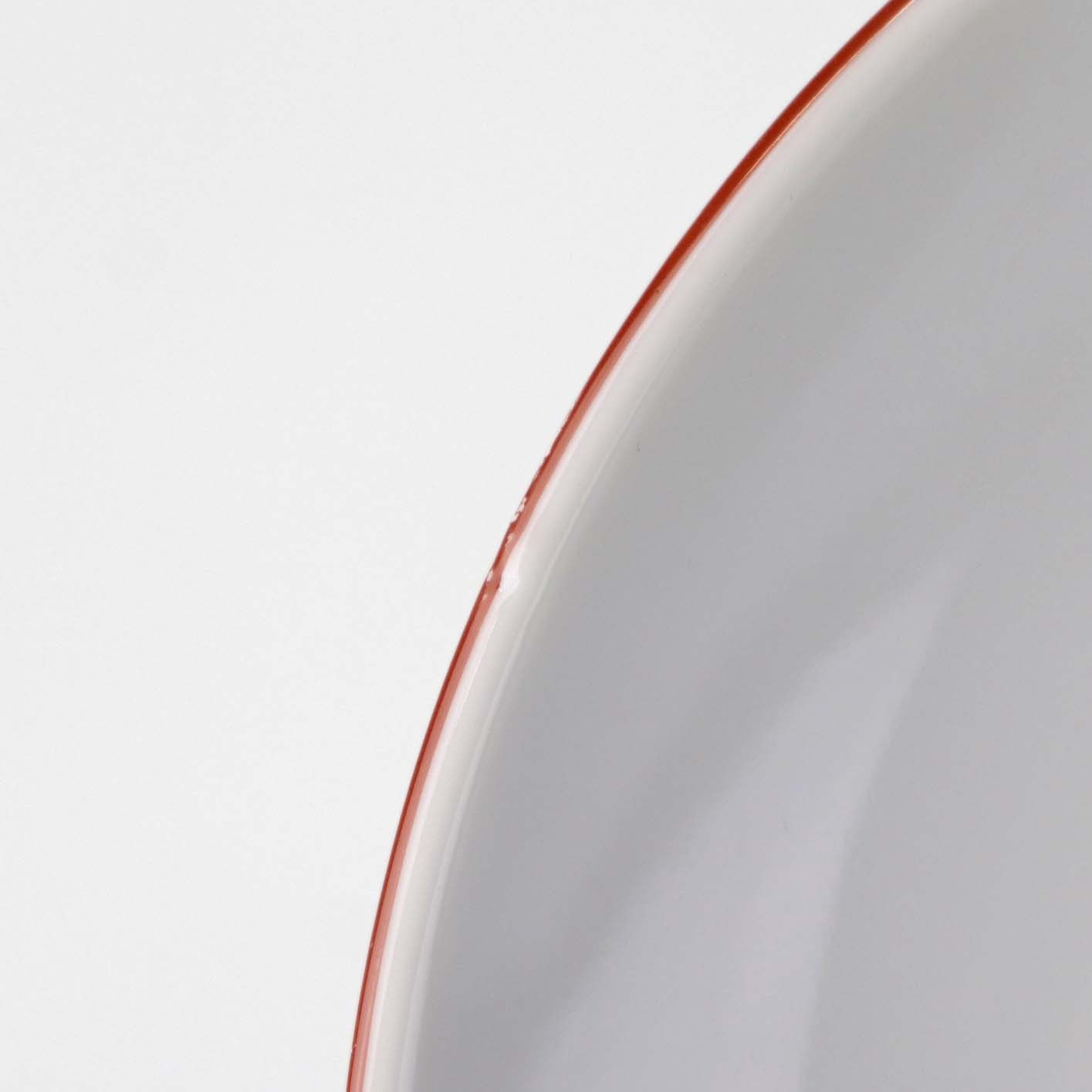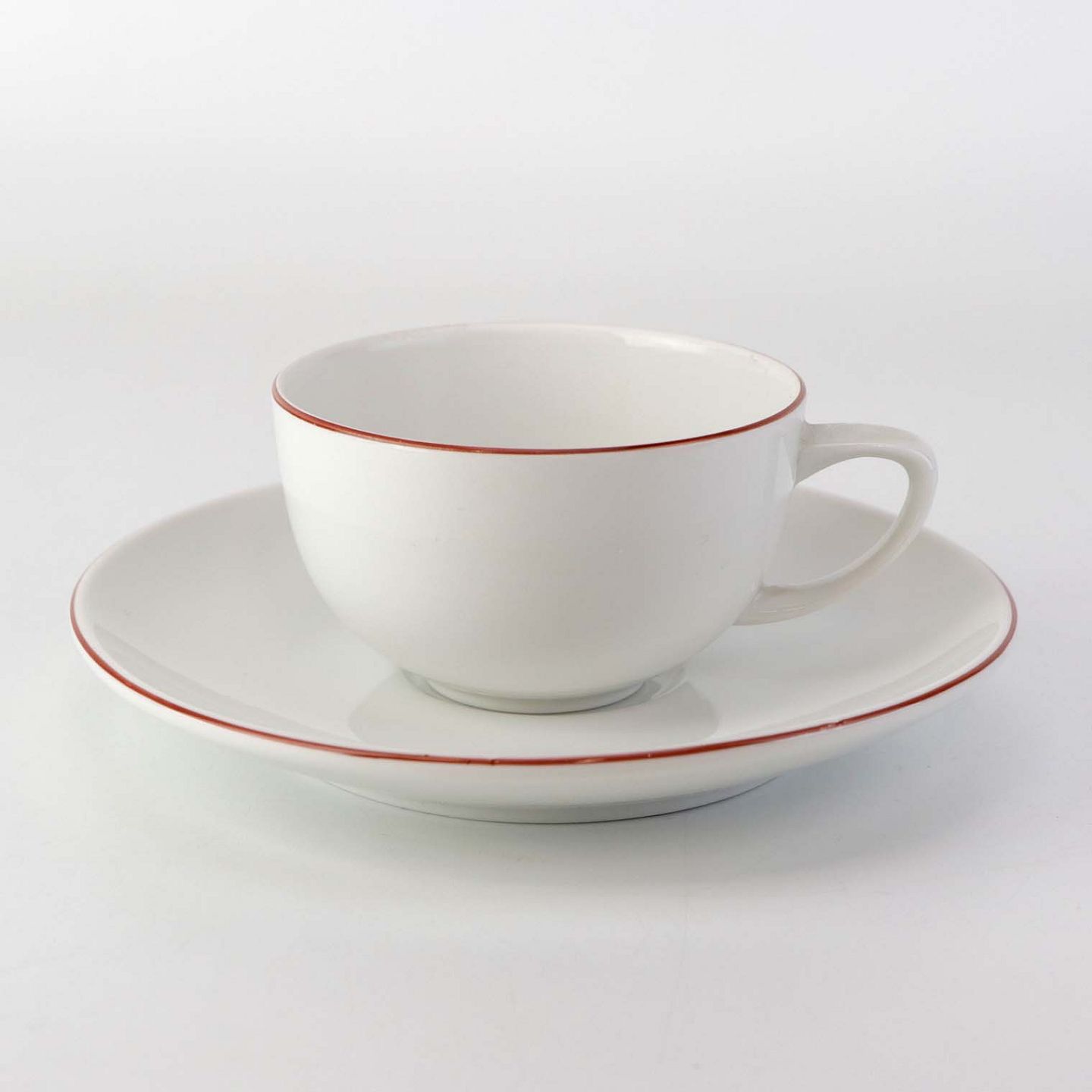 Service i glat hvidt porcelæn med dekoration i tynd rød streg.