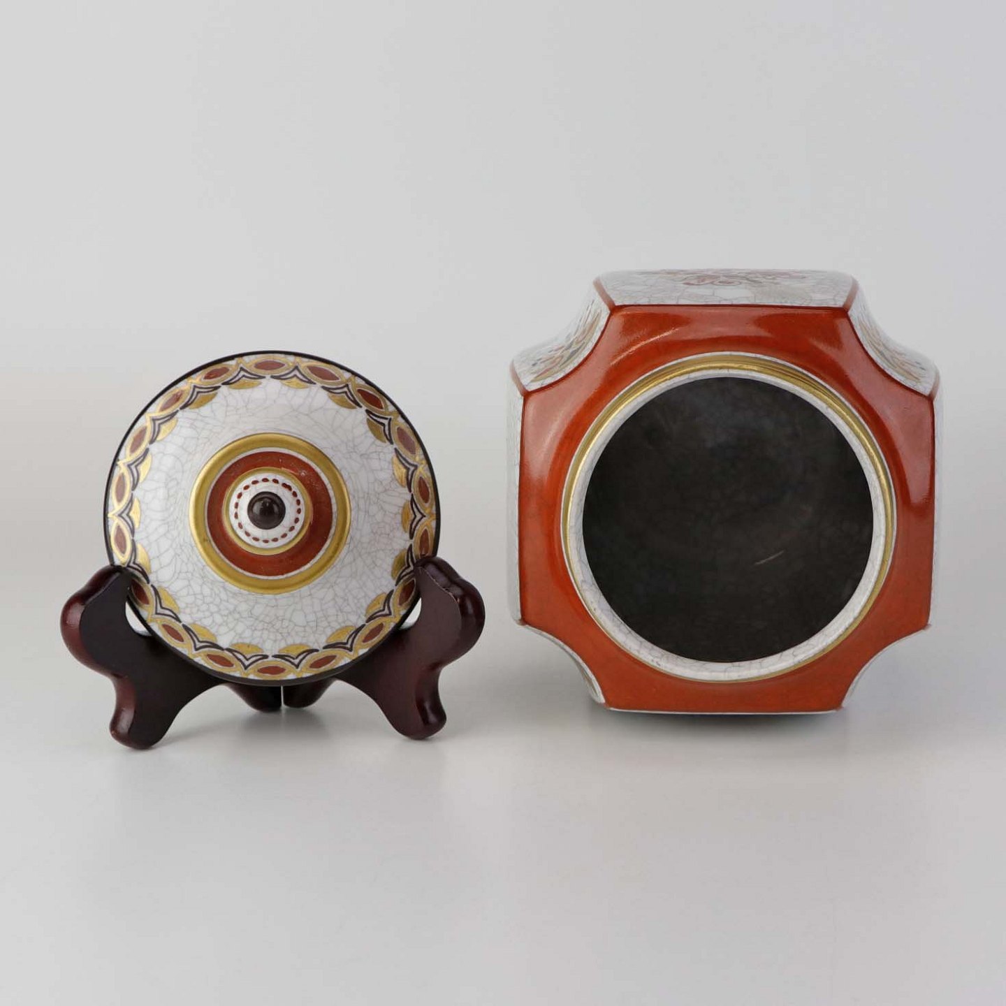 Kantet krukke med låg i porcelæn med krakele glasur og motiv af blomster samt kantet med orangerød bort og guld kant. Nr. 196/600