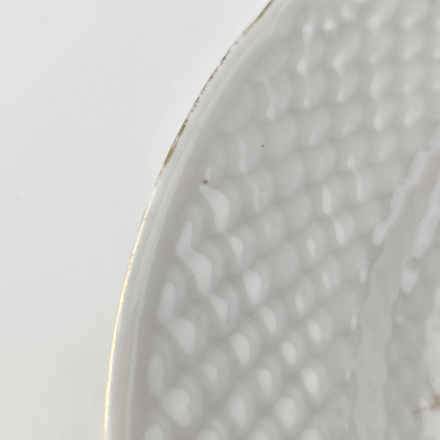 Tallerken i cremefarvet porcelæn med skælmønster og guldkant med blomstermotiv