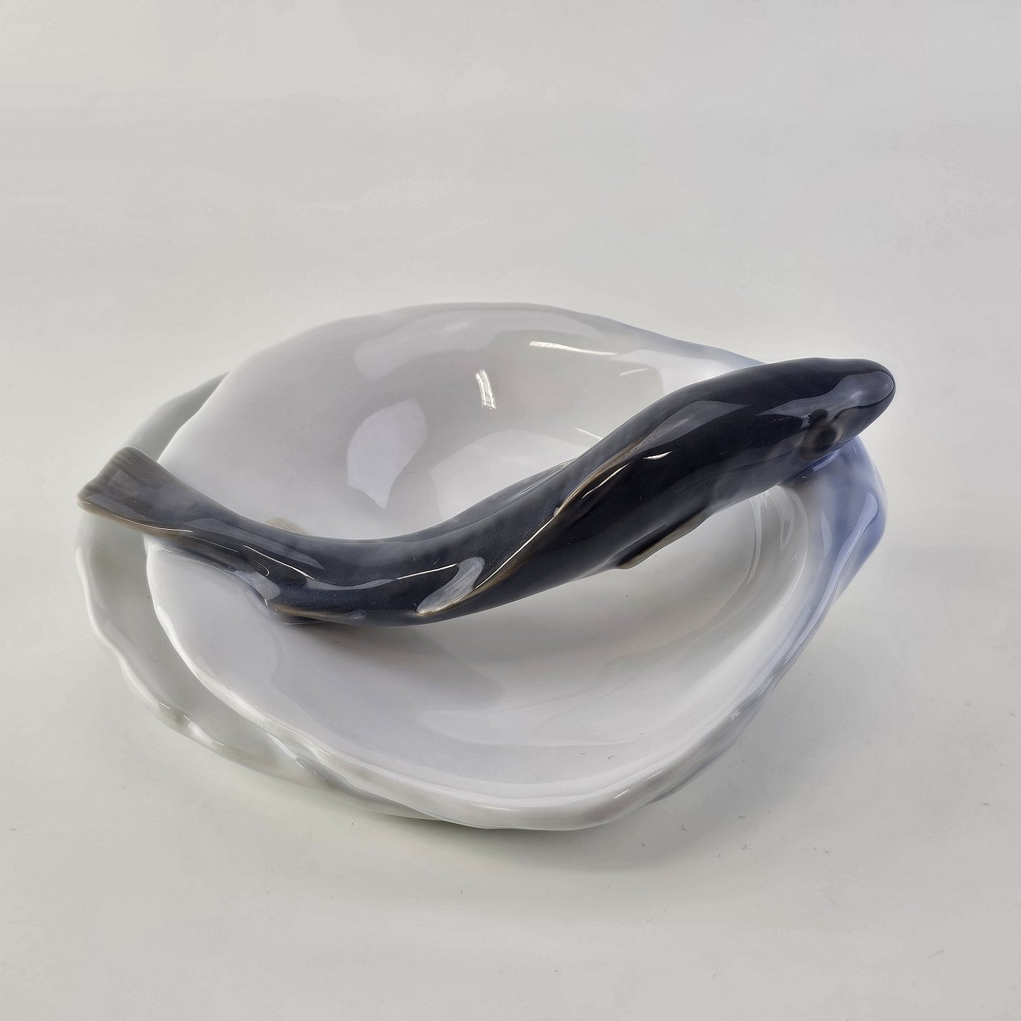 Sjælden skål i kongeligt porcelæn i art nouveau stil med form af to muslingeskaller med en fisk