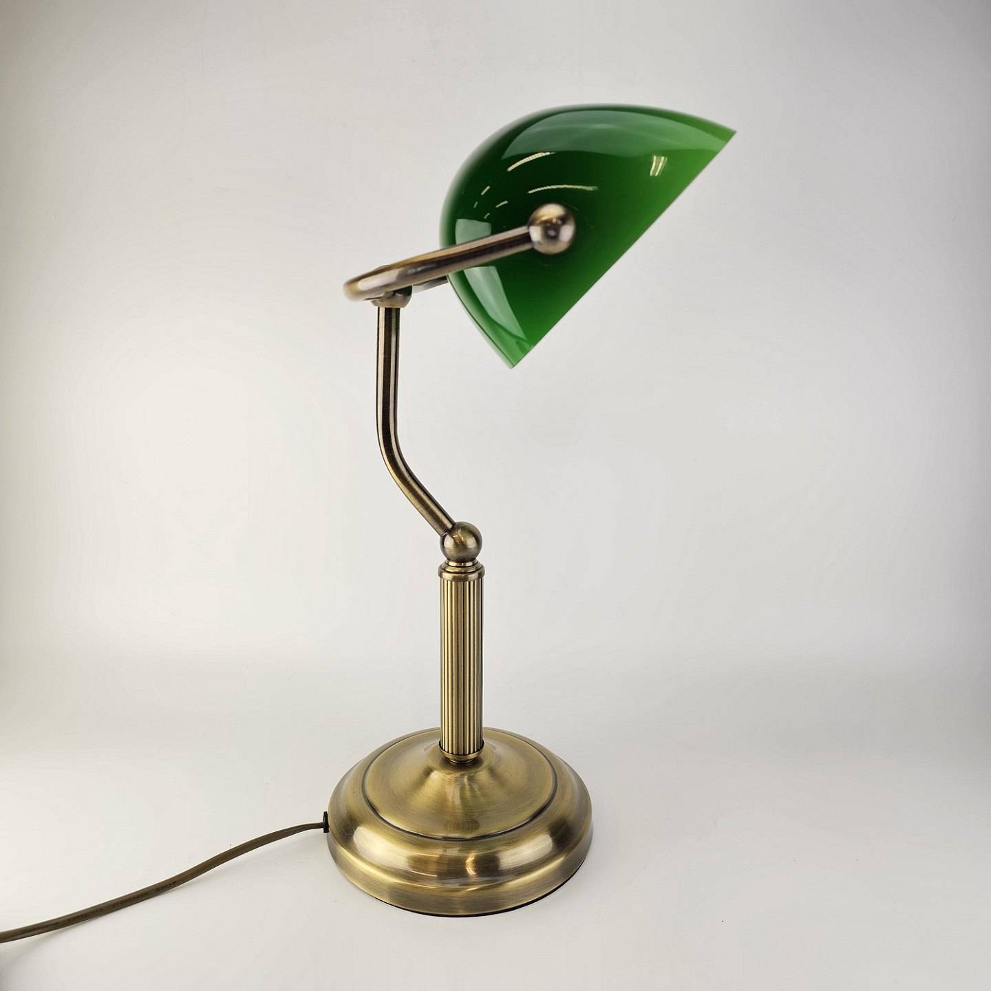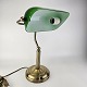 Bordlampe med fod i messing og skærm af grønt/hvid glas